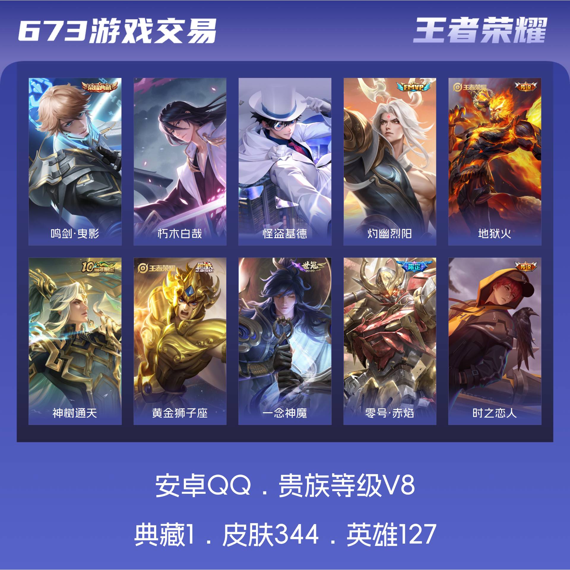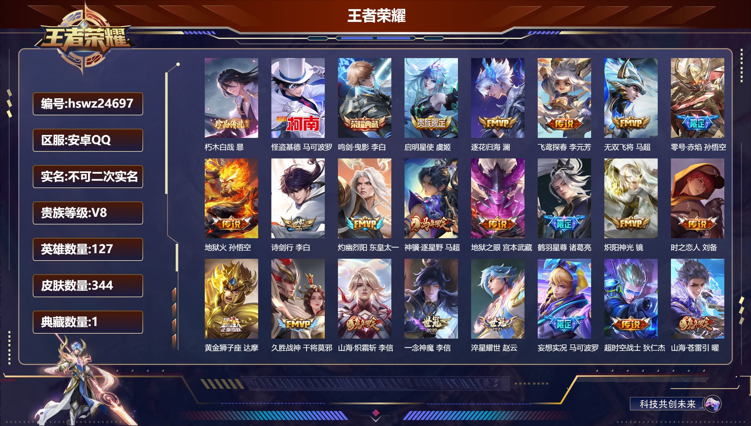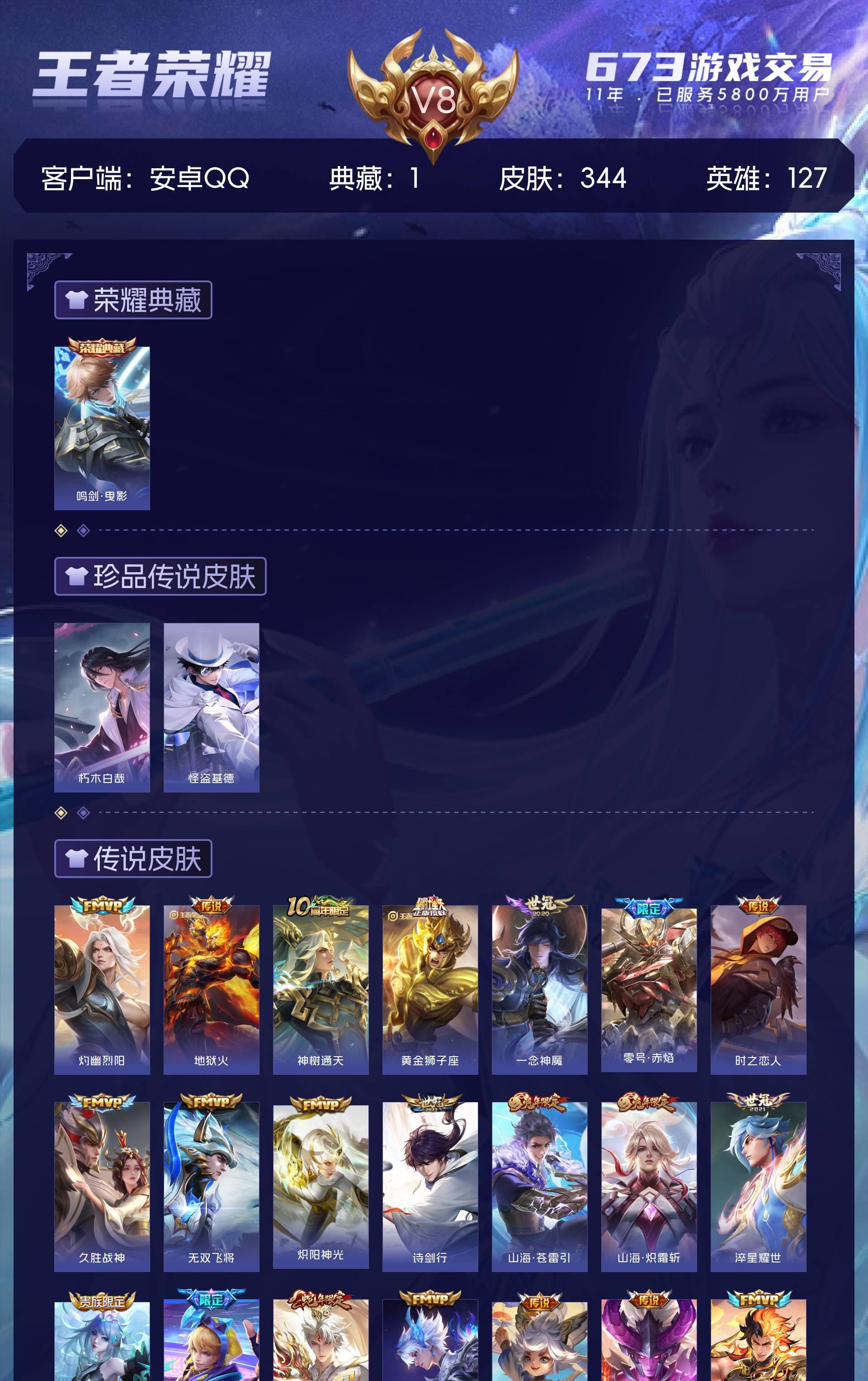 安卓QQ/绝世王者/344皮肤/127英雄/1典藏/0珍品无双/0无双/2珍品传说/25传说/95史