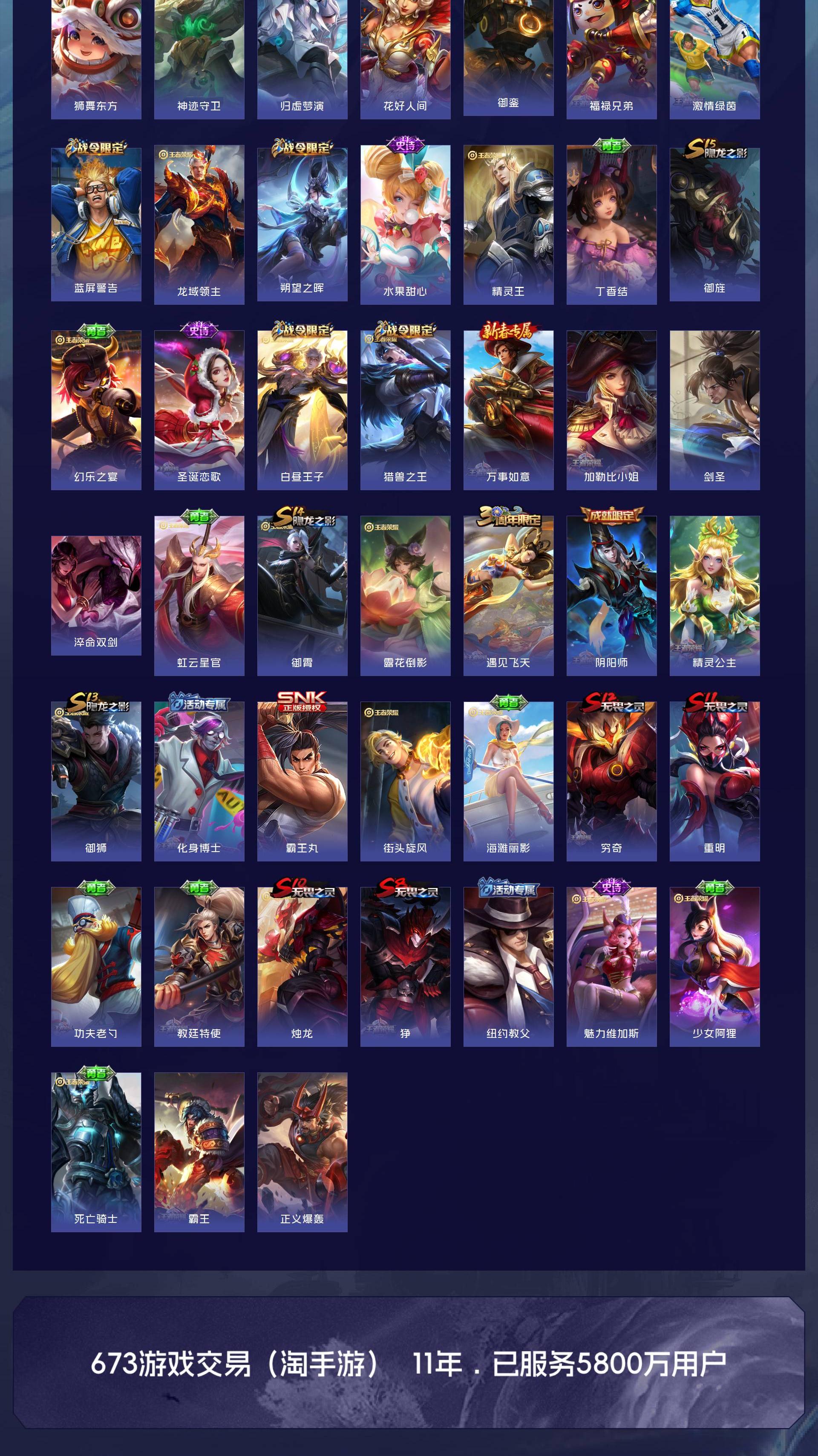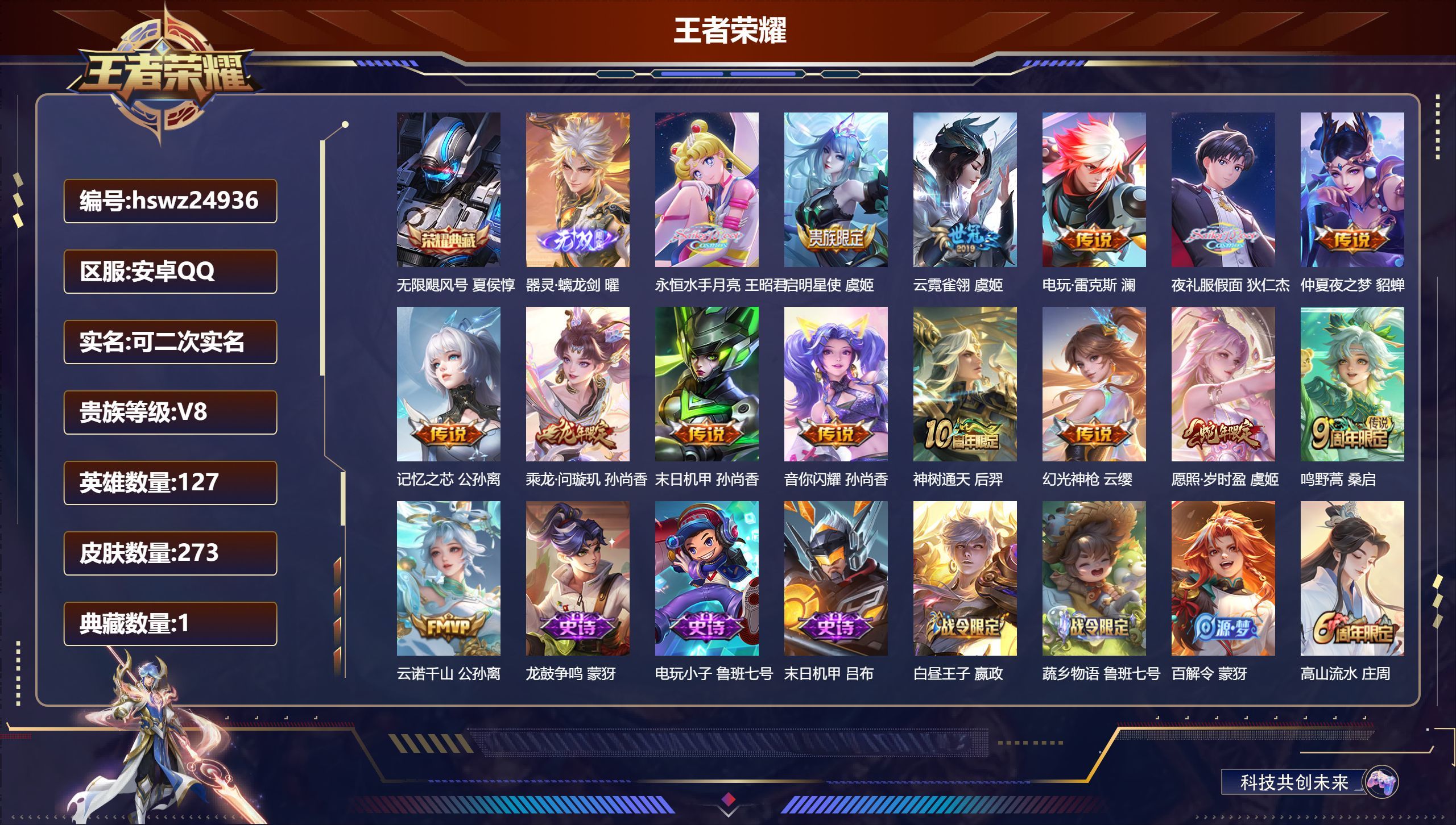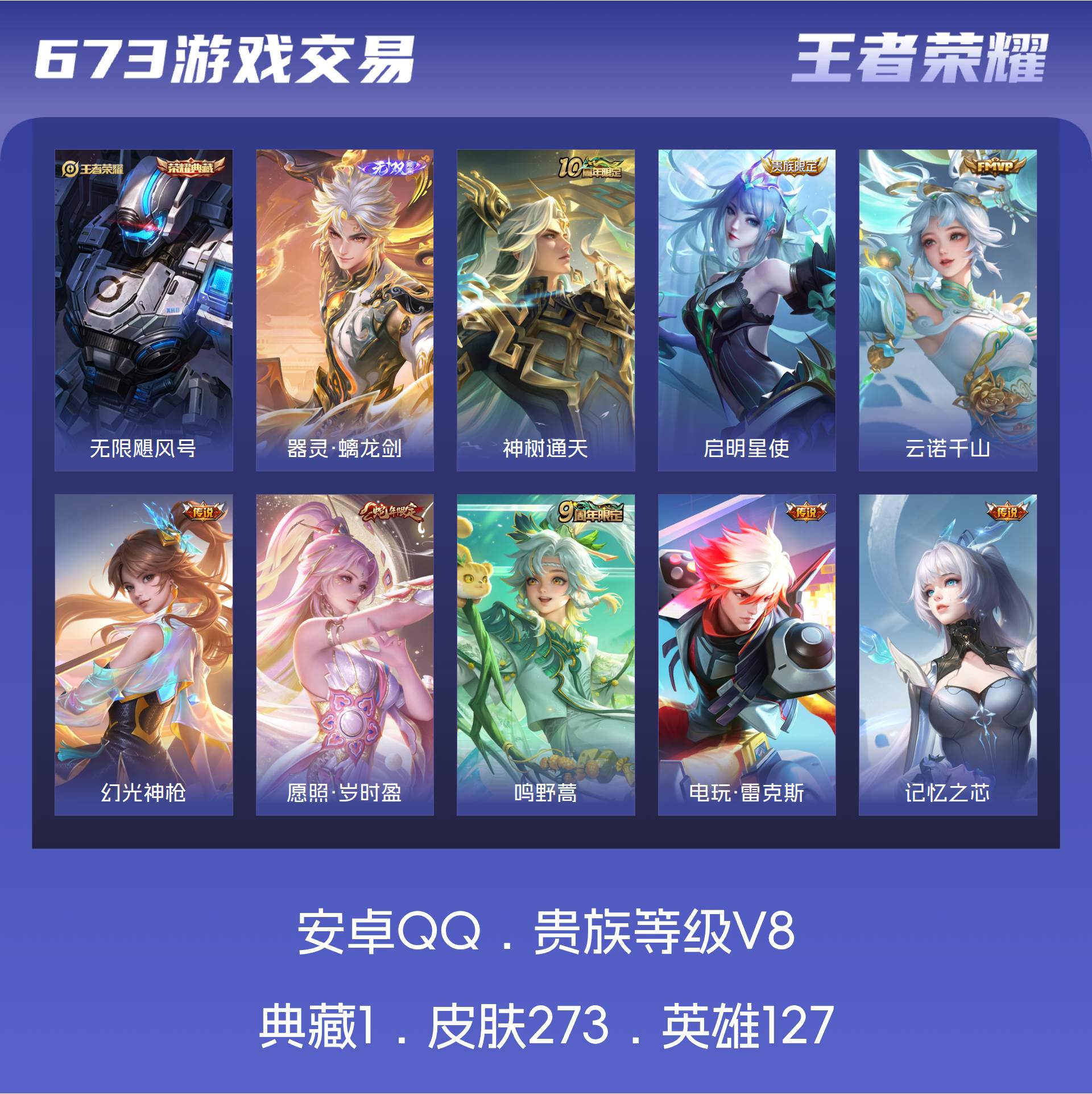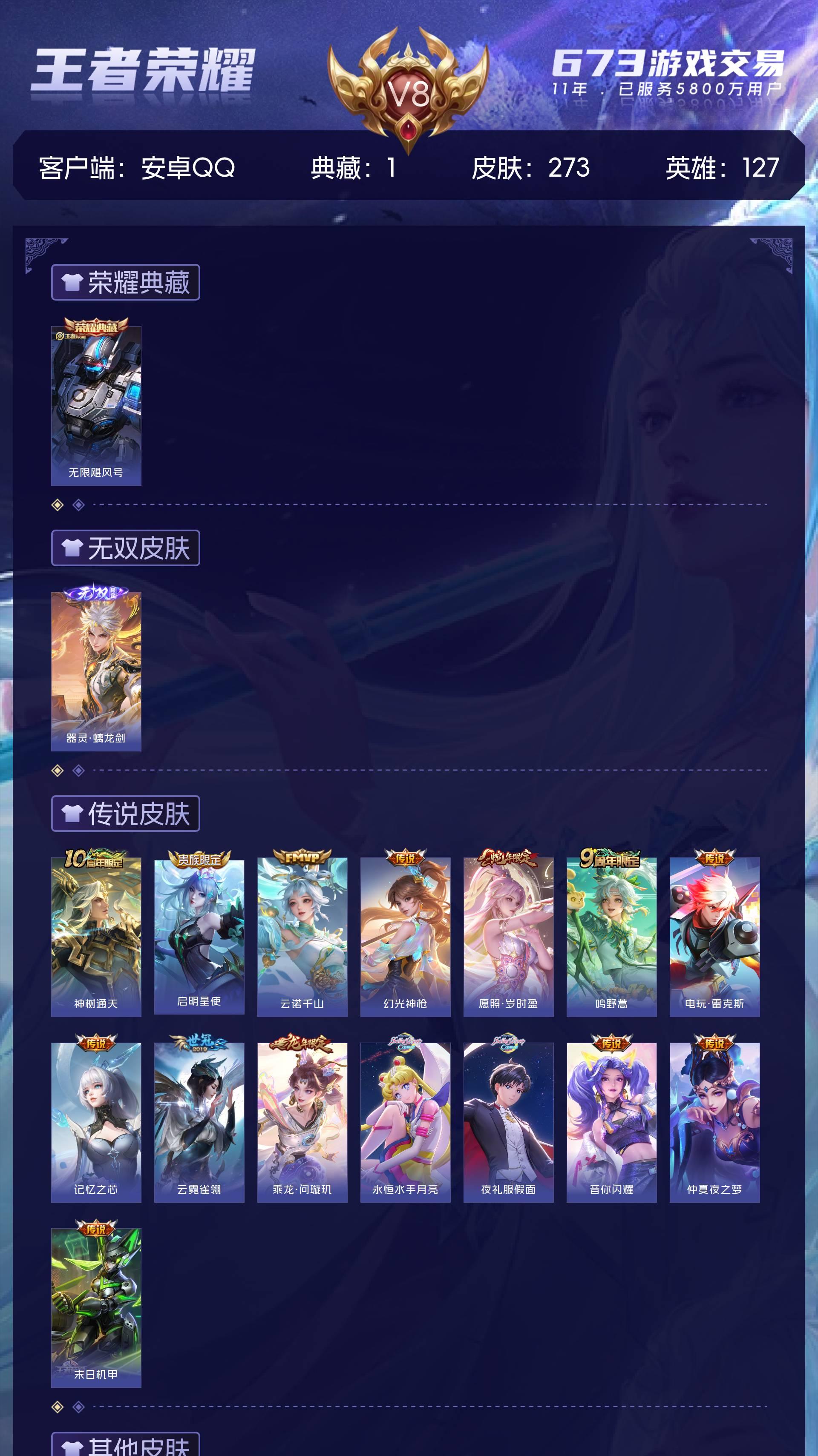 安卓QQ/最强王者/273皮肤/127英雄/1典藏/0珍品无双/1无双/0珍品传说/15传说/84史