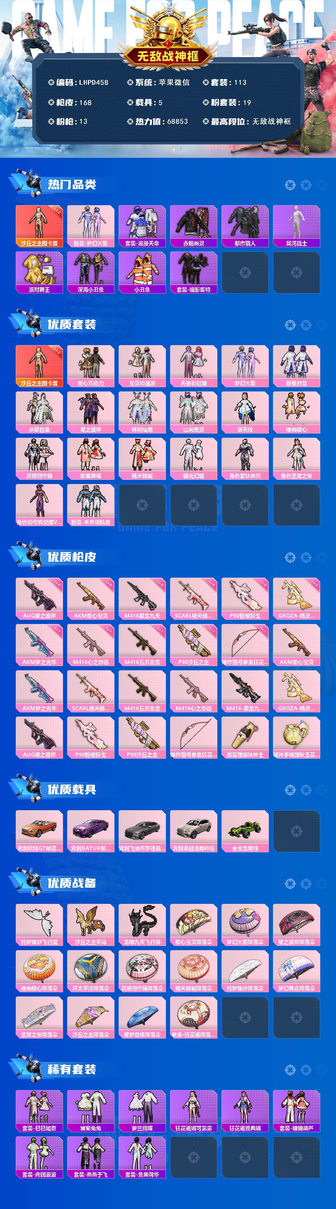 极品素材男神号!【店主推荐捡漏号!可直接换绑】苹果 微信-无敌战神框-1神装-19粉装-13特效枪-5载具-3粉色飞行器-68853热力值-9王牌印记-113套装-168枪皮【红色神装等级】:沙丘之主-图卡盟(二级)【红色角色神装】:沙丘之主-图卡盟【热门品类】:粉装-梦幻火箭,套装-浪漫天命,套装-赤蝎幽灵,套装-都市猎人,套装-冥河战士,套装-派对舞王,套装-深海小丑鱼,套装-小丑鱼,套装-
