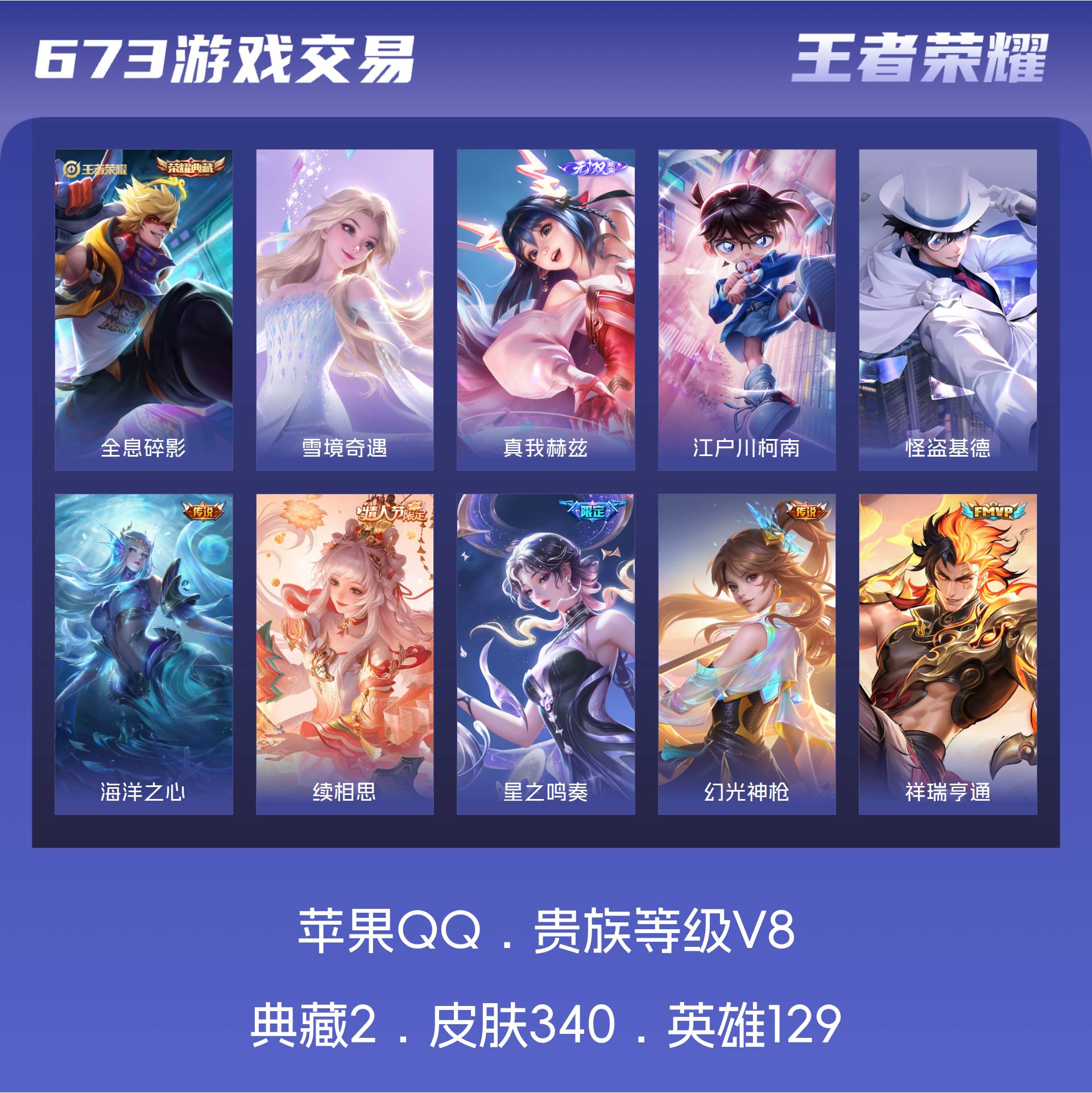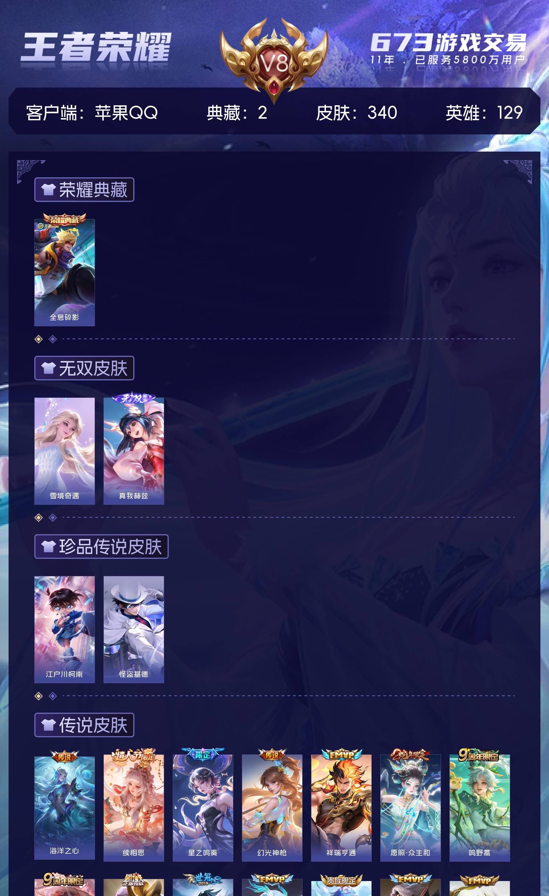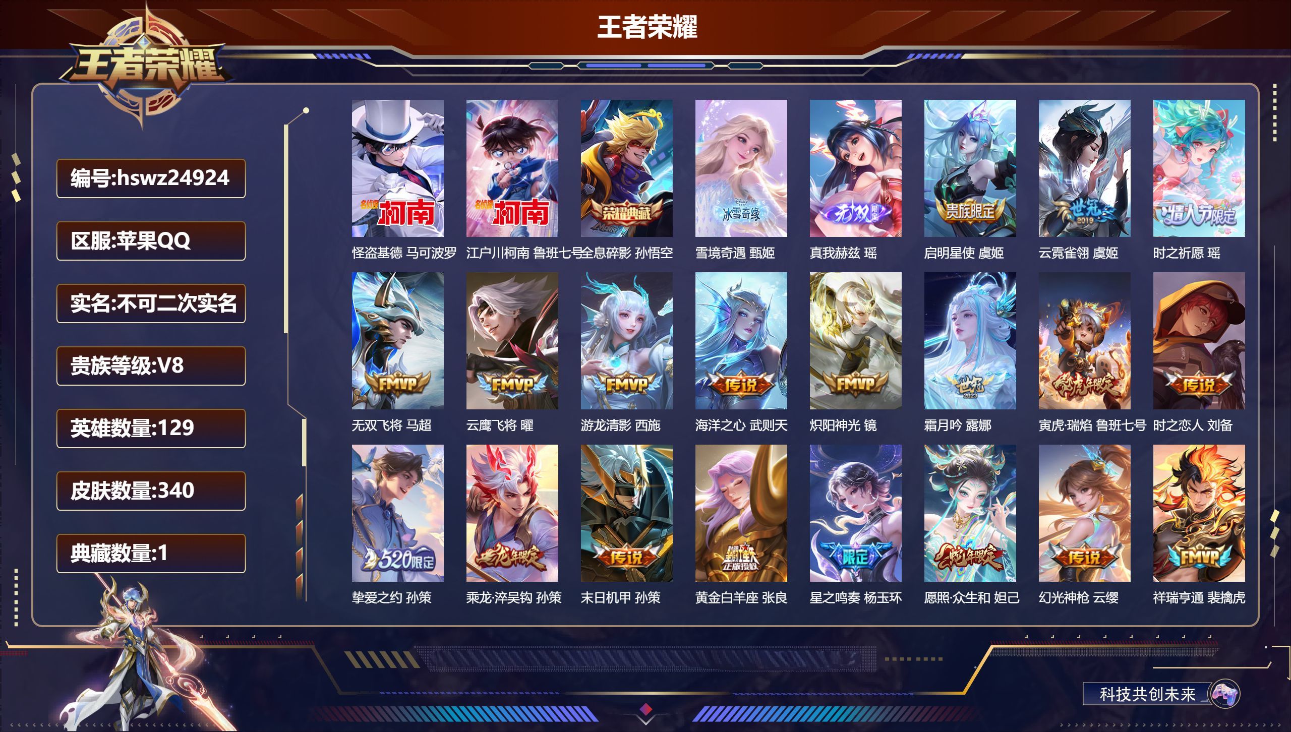 苹果QQ/非凡王者/340皮肤/129英雄/1典藏/0珍品无双/2无双/2珍品传说/22传说/95史