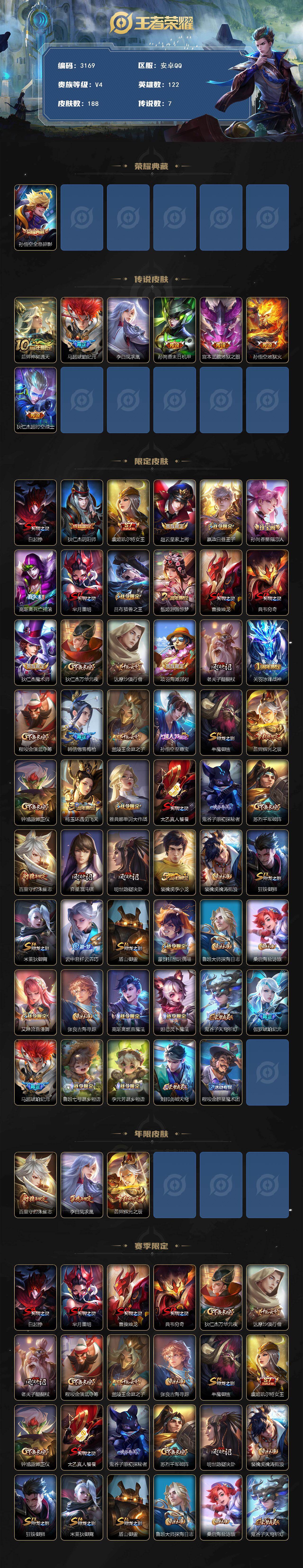 237-[17147628]贵族7-188皮1典藏7传说 安卓手Q108区188皮1典藏7传说0无双V4 营地ID331429901永恒钻石IV【荣耀典藏】:全息碎影【优质限定皮肤】:凤求凰,至尊宝【传说皮肤】:神树通天,琥珀纪元,地狱之眼,凤求凰,超时空战士,地狱火,末日机甲【史诗皮肤】:冰冠公主,蔷薇恋人,猫狗日记,蔬乡物语,幽灵船长,燃音魔法,女仆咖啡,乱世虎臣,琥珀纪元,金属风暴,偶像歌手,傲雪梅枪,水果甜心,圣诞狂欢,星夜王子,纤云弄巧,狂想玩偶喵,冰雪圆舞曲,李小龙,鹰眼统帅,未来纪