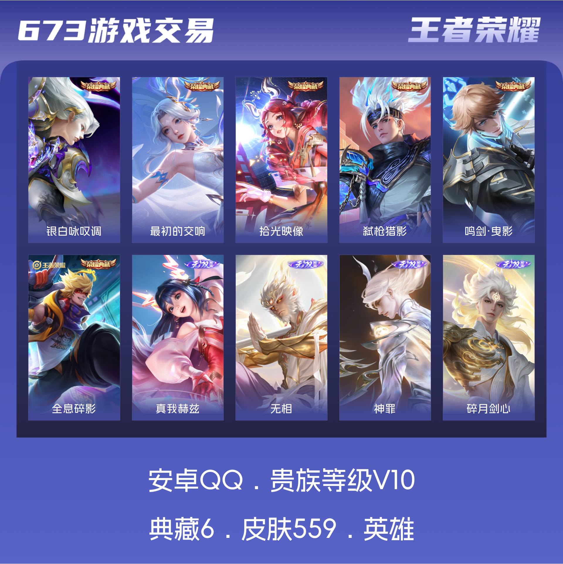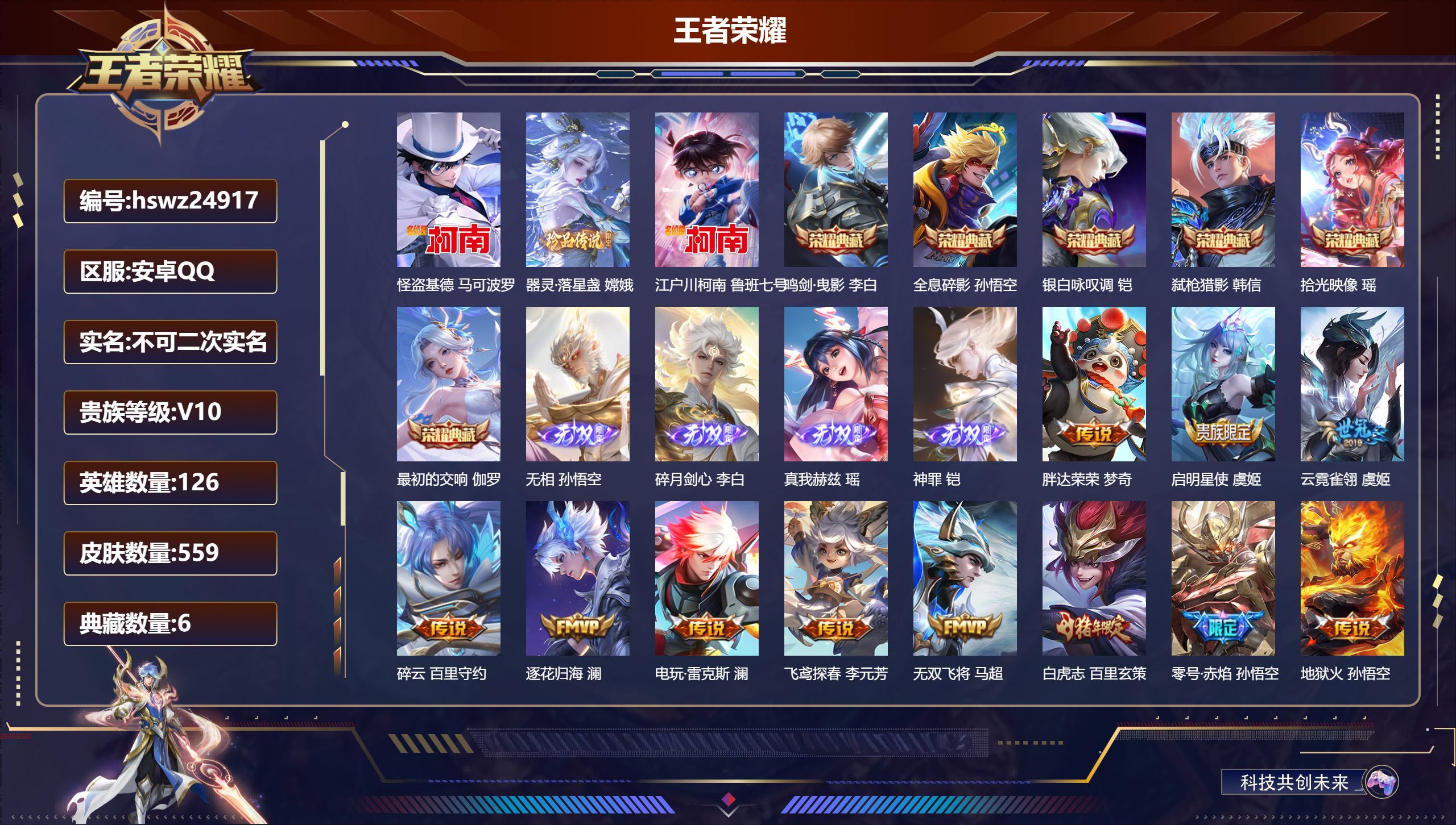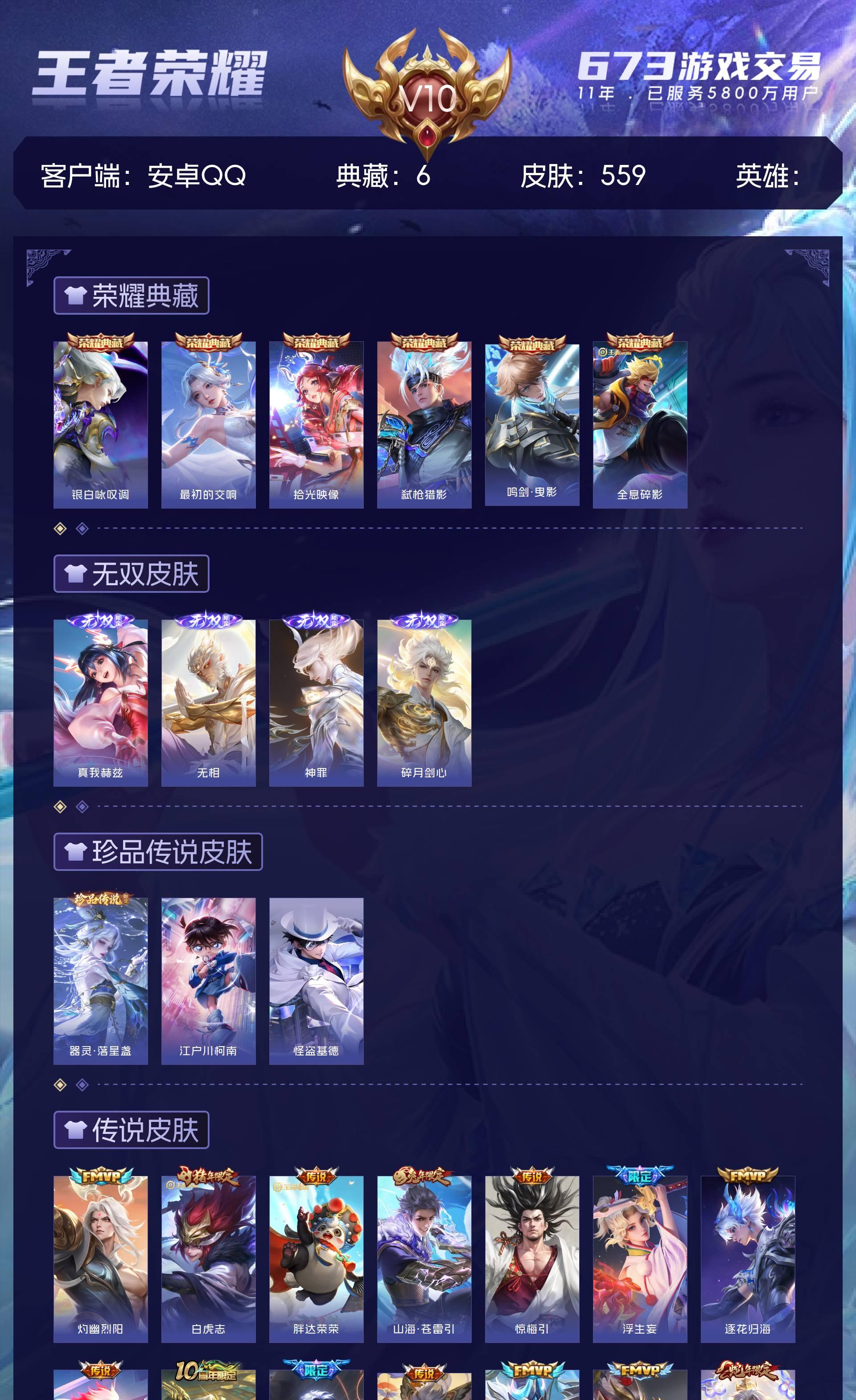 安卓QQ/荣耀王者/559皮肤/126英雄/6典藏/0珍品无双/4无双/3珍品传说/55传说/187