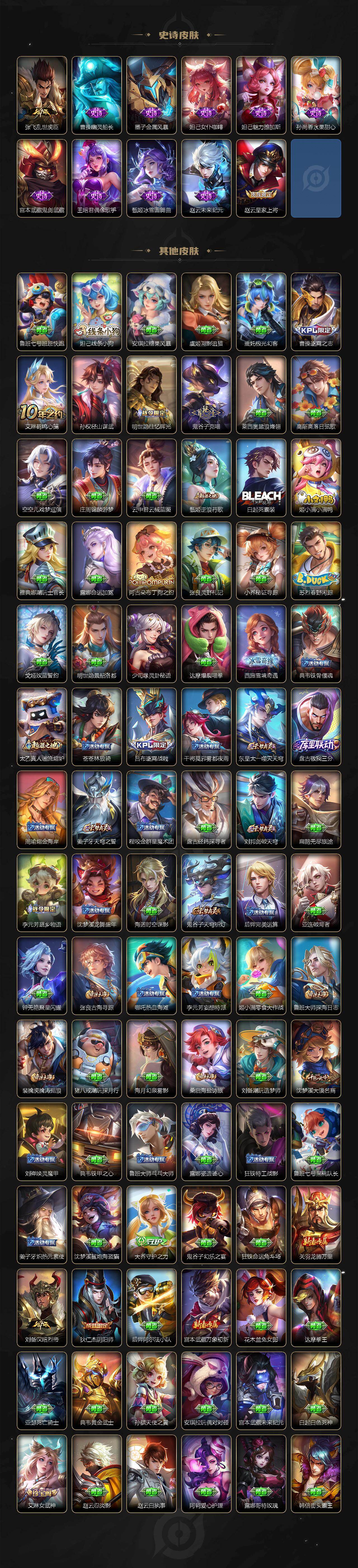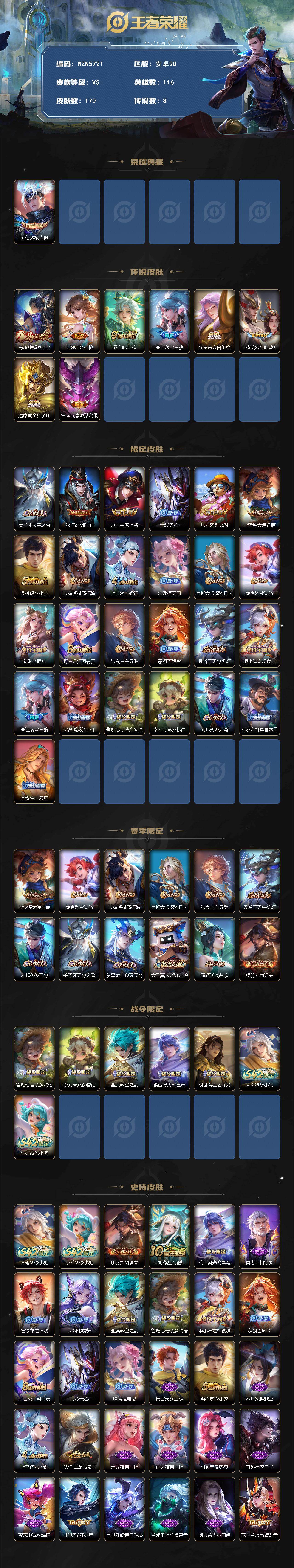 贵族5/皮肤170/典藏1/传说8/史诗40/英雄116/孙权全皮/敖隐全皮/空空儿全皮/