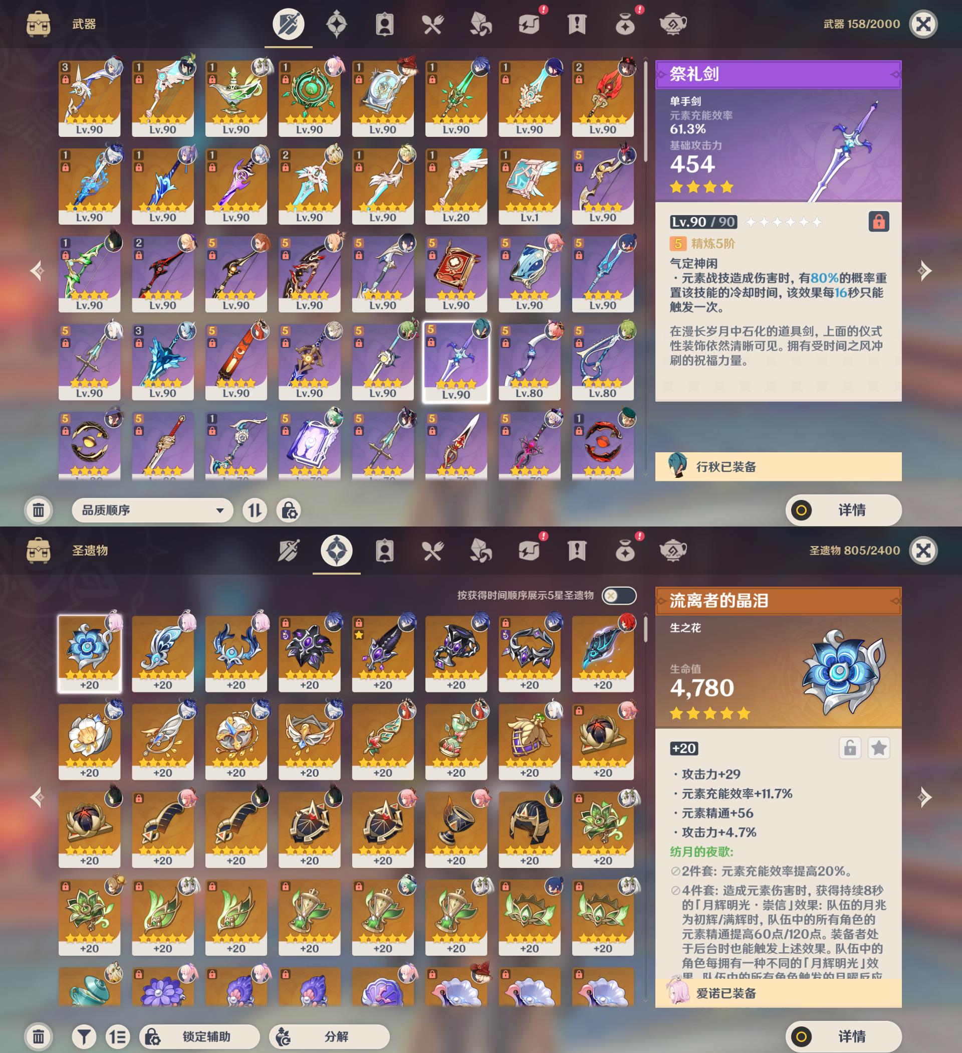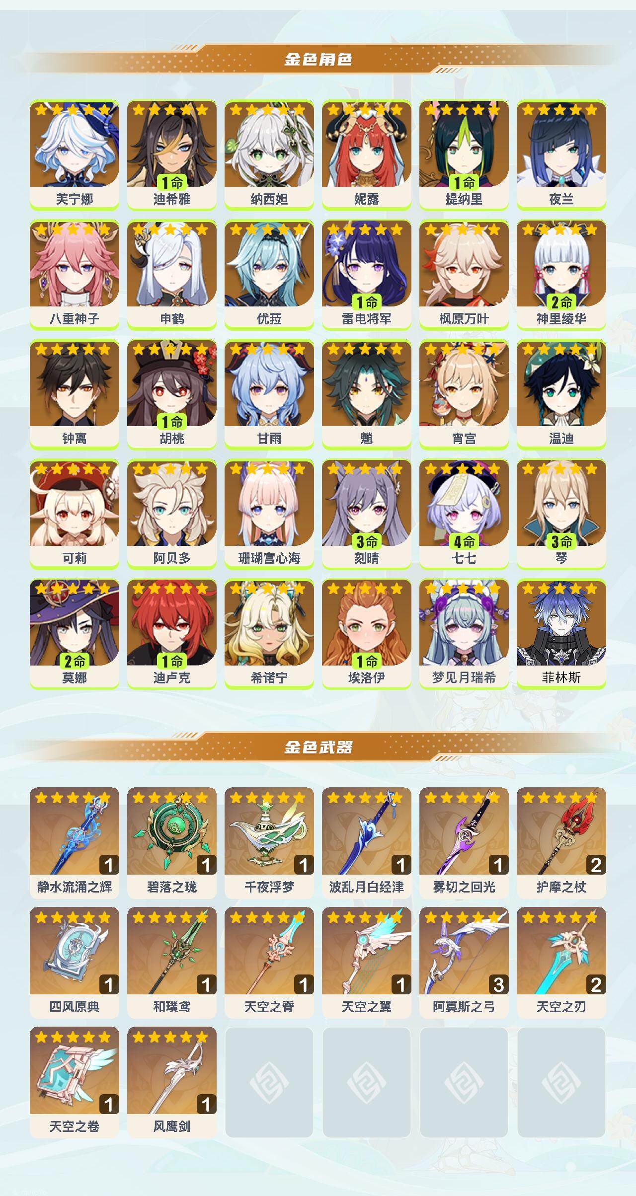 【YSN2442】60级/68黄/女主/30个五星角色/15个五星武器/钟离/夜兰/1命胡桃/1命雷电将军/希诺宁/阿贝多/枫原万叶/魈/温迪/申鹤/优菈/甘雨/2命神里绫华/0命菲林斯/八重神子/3命刻晴/纳西妲/1命提纳里/芙宁娜/妮露/珊瑚宫心海/2命莫娜/宵宫/可莉/4命七七/3命琴/梦见月瑞希/0命埃洛伊/1命迪卢克/1命迪希雅/精3阿莫斯之弓/天空之翼/千夜浮梦/碧落之珑/四风原典/和璞鸢/天空之脊/精2护摩之杖/静水流涌之辉/波乱月白经津/雾切之回光/精2天空之刃/风鹰剑/天空之卷
