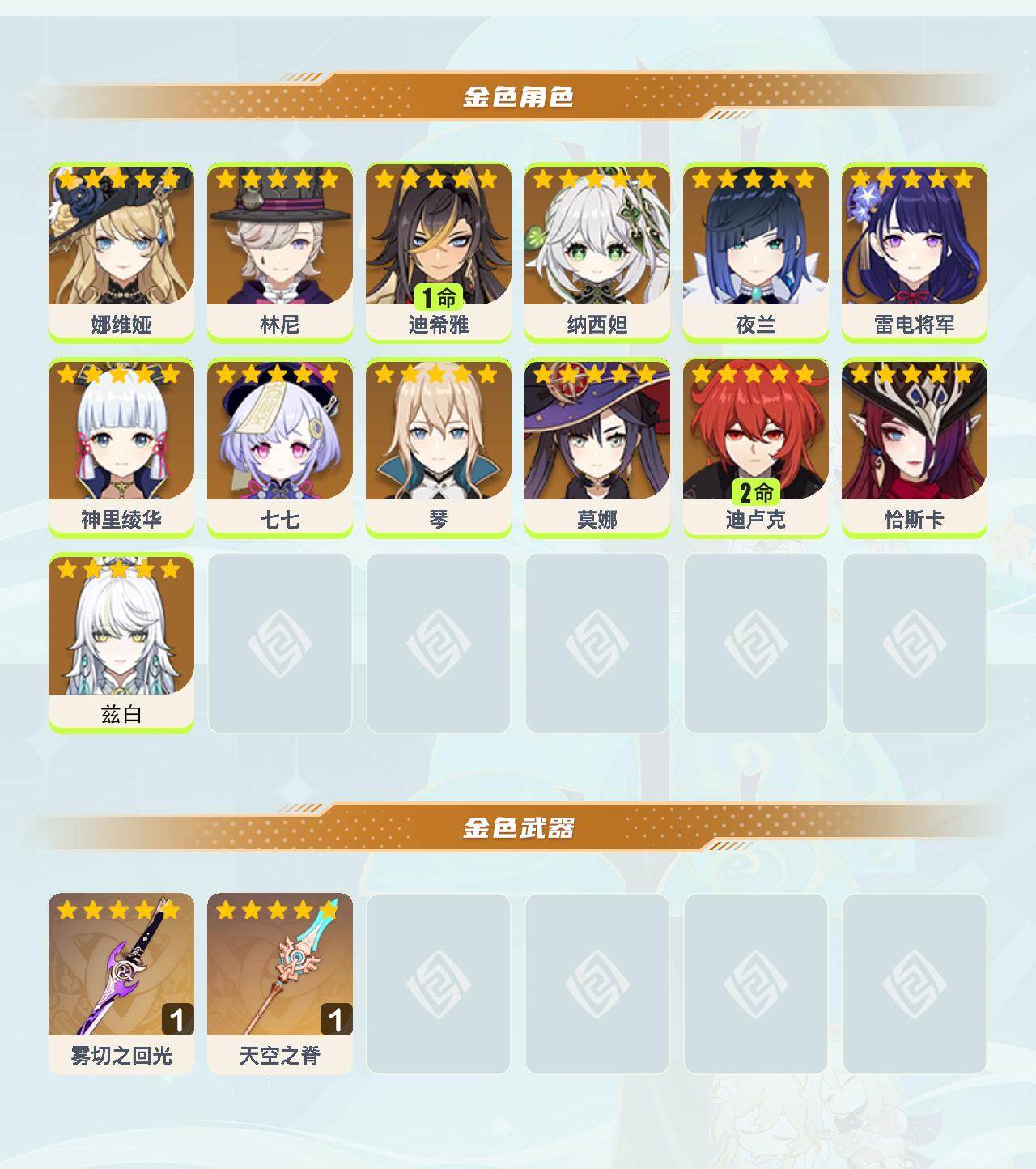 【YSN2438】56级/18黄/女主/13个五星角色/2个五星武器/夜兰/雷电将军/0命兹白/林尼/七七/神里绫华/纳西妲/琴/恰斯卡/莫娜/1命迪希雅/2命迪卢克/娜维娅/天空之脊/雾切之回光
