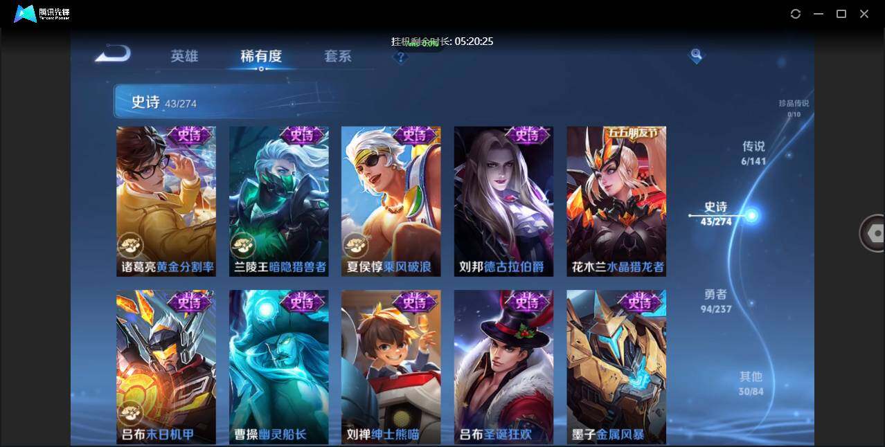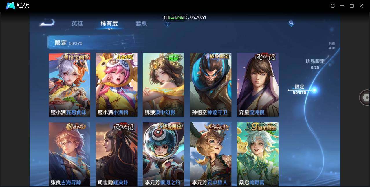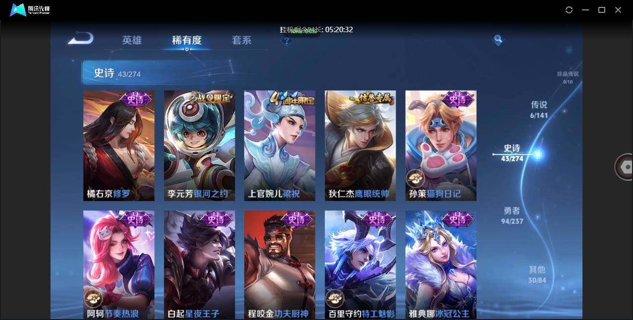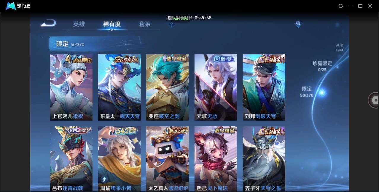 不可二次-贵5-126英雄-174皮肤-1典藏-6传说-50限定-2按键-贵族积分8543
