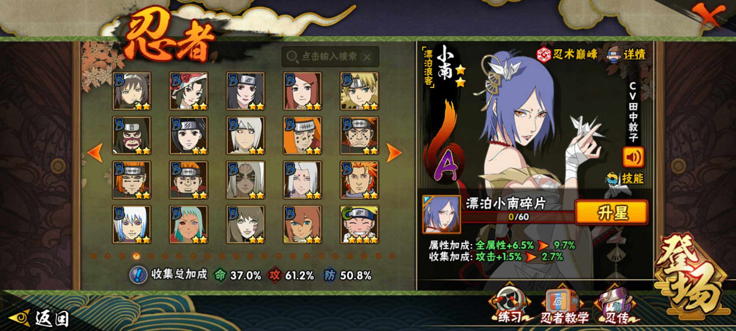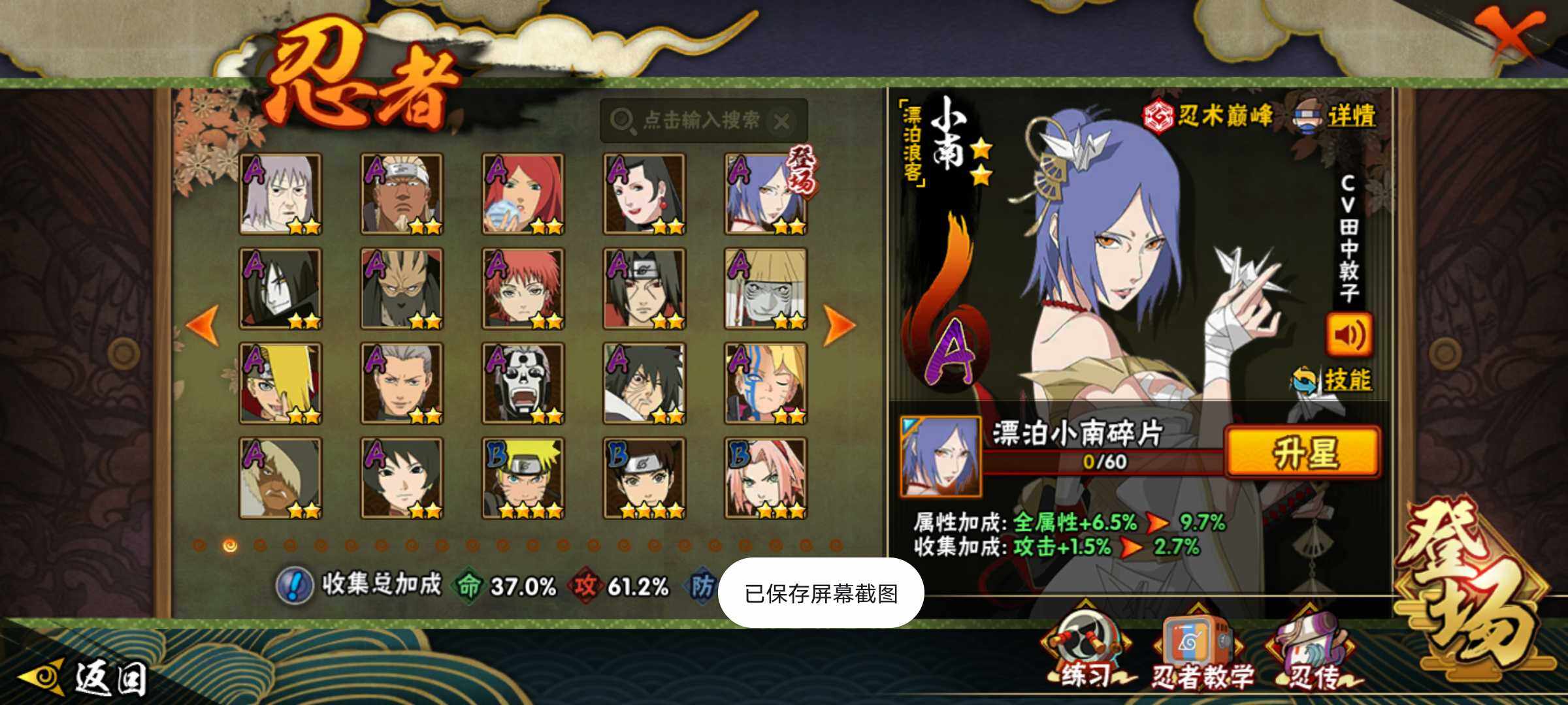 【A级忍者】:艾「青年」(2星),波风水门「青年」(2星),达鲁伊「博人传」(2星),迪达拉(2星),大蛇丸