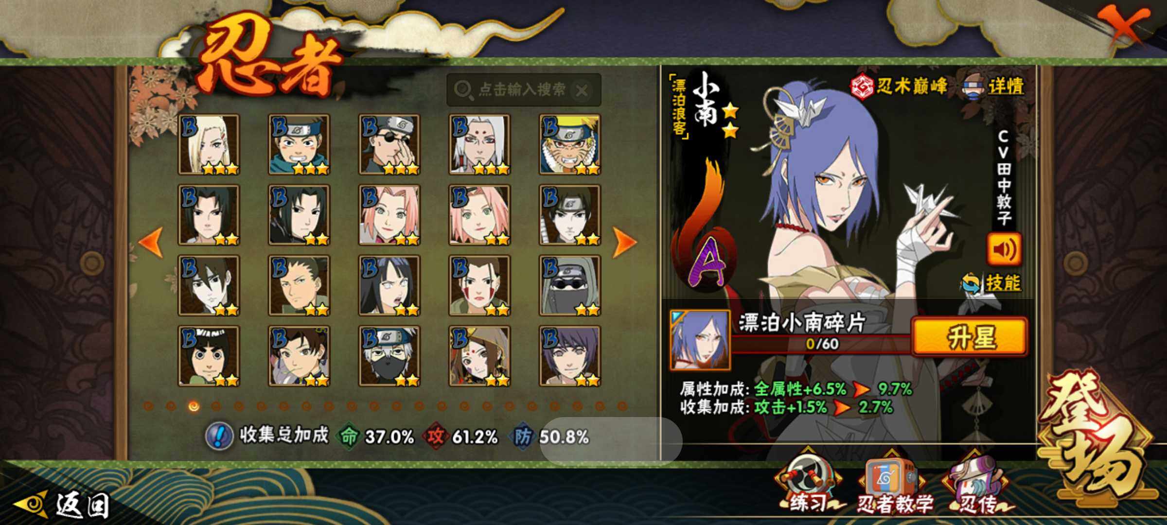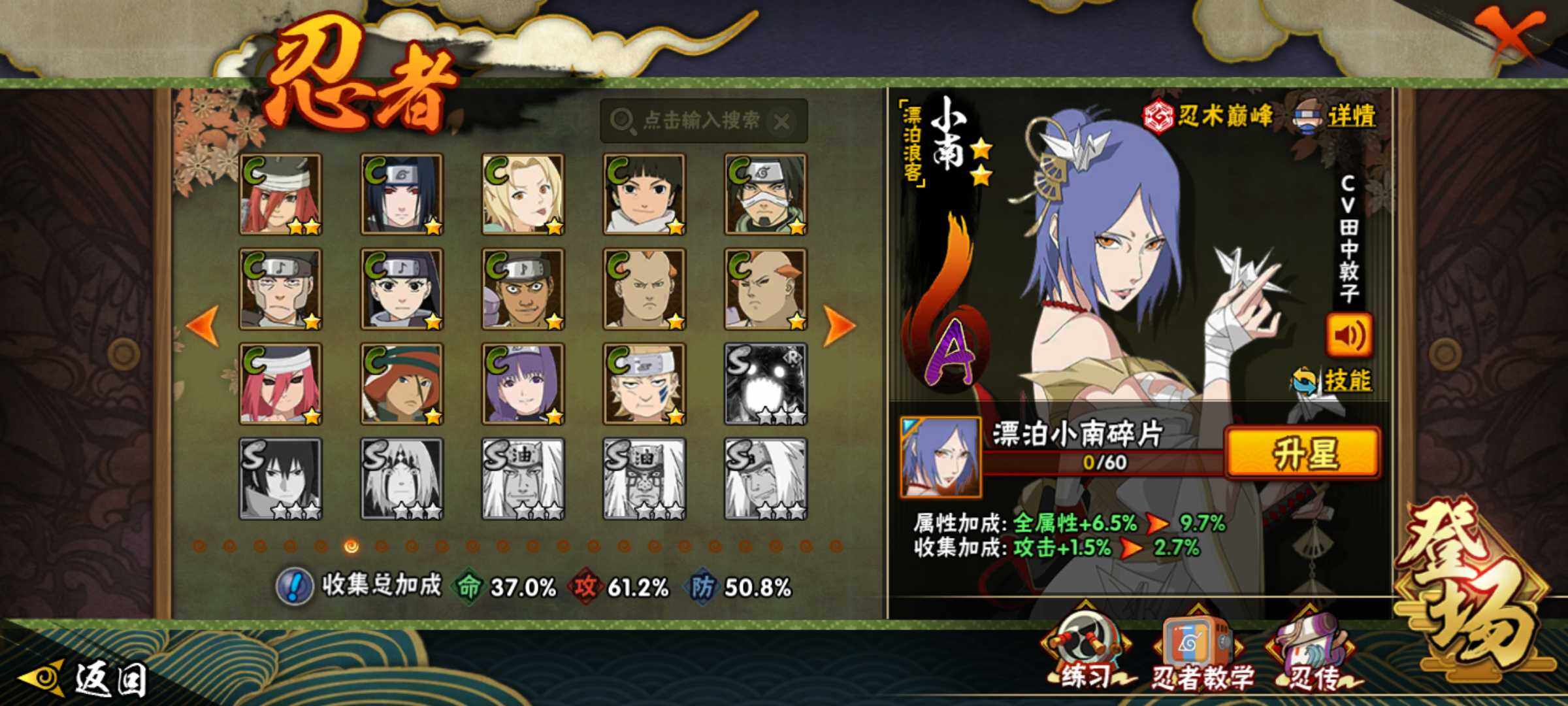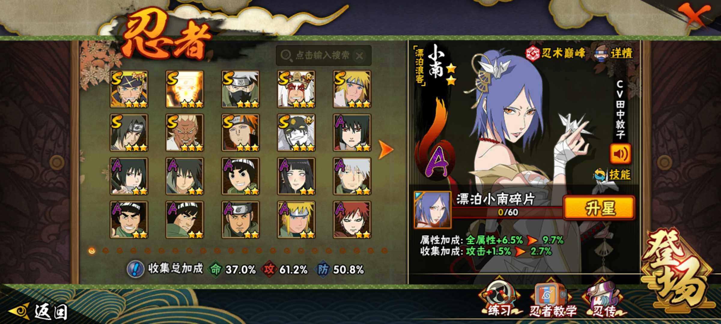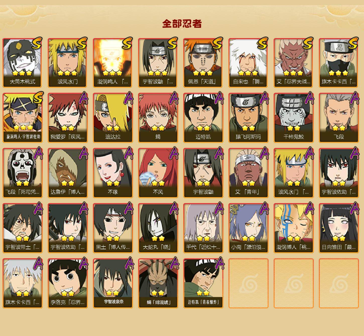【S级忍者】:艾「忍界大战」(3星),宇智波鼬「须佐能乎」(3星),旗木卡卡西「须佐能乎」(3星),自来也「舞之豪杰」(3星),波风水门(3星),漩涡鸣人「九喇嘛连结」(3星),佩恩「天道」(3星),大筒木桃式(3星),漩涡鸣人·宇智波佐助(3星)