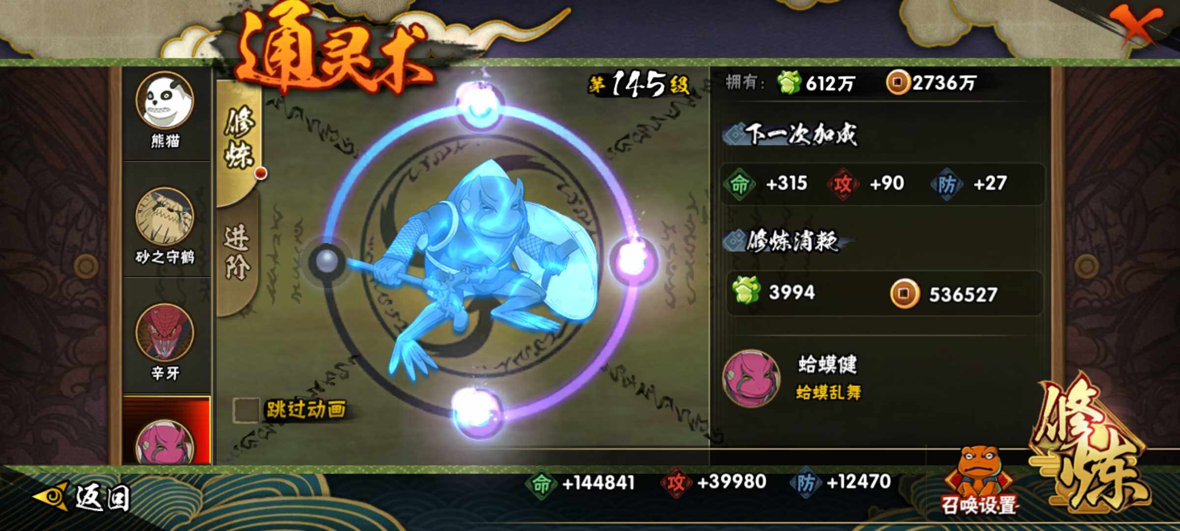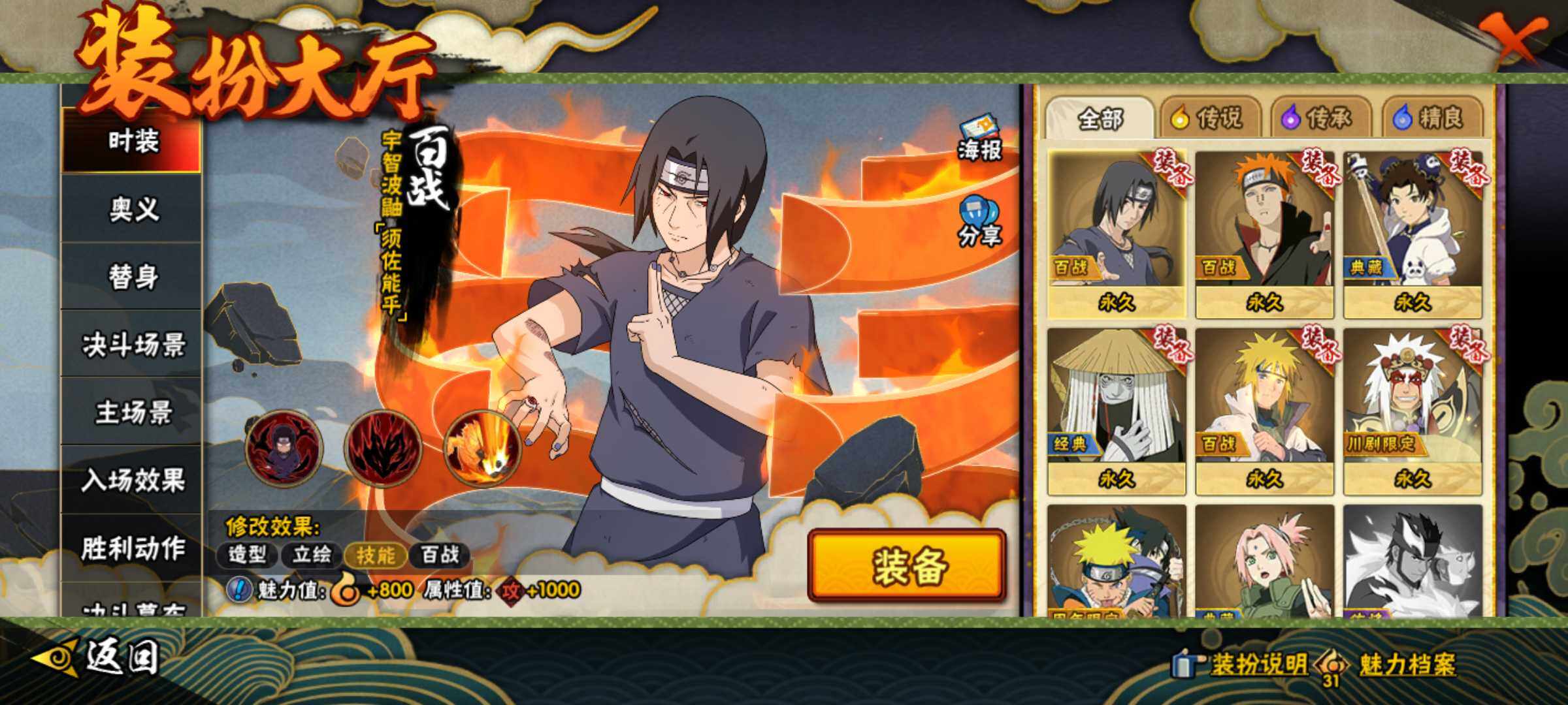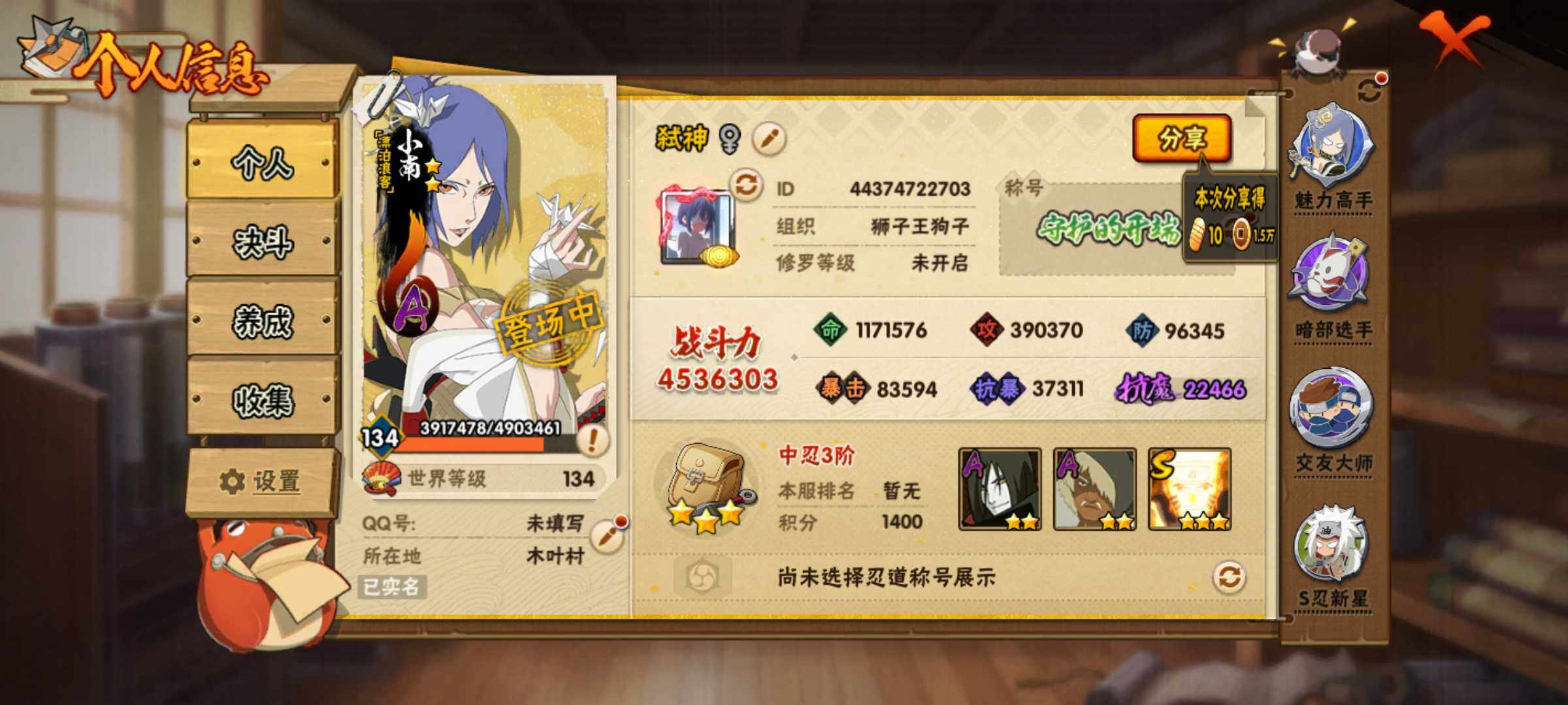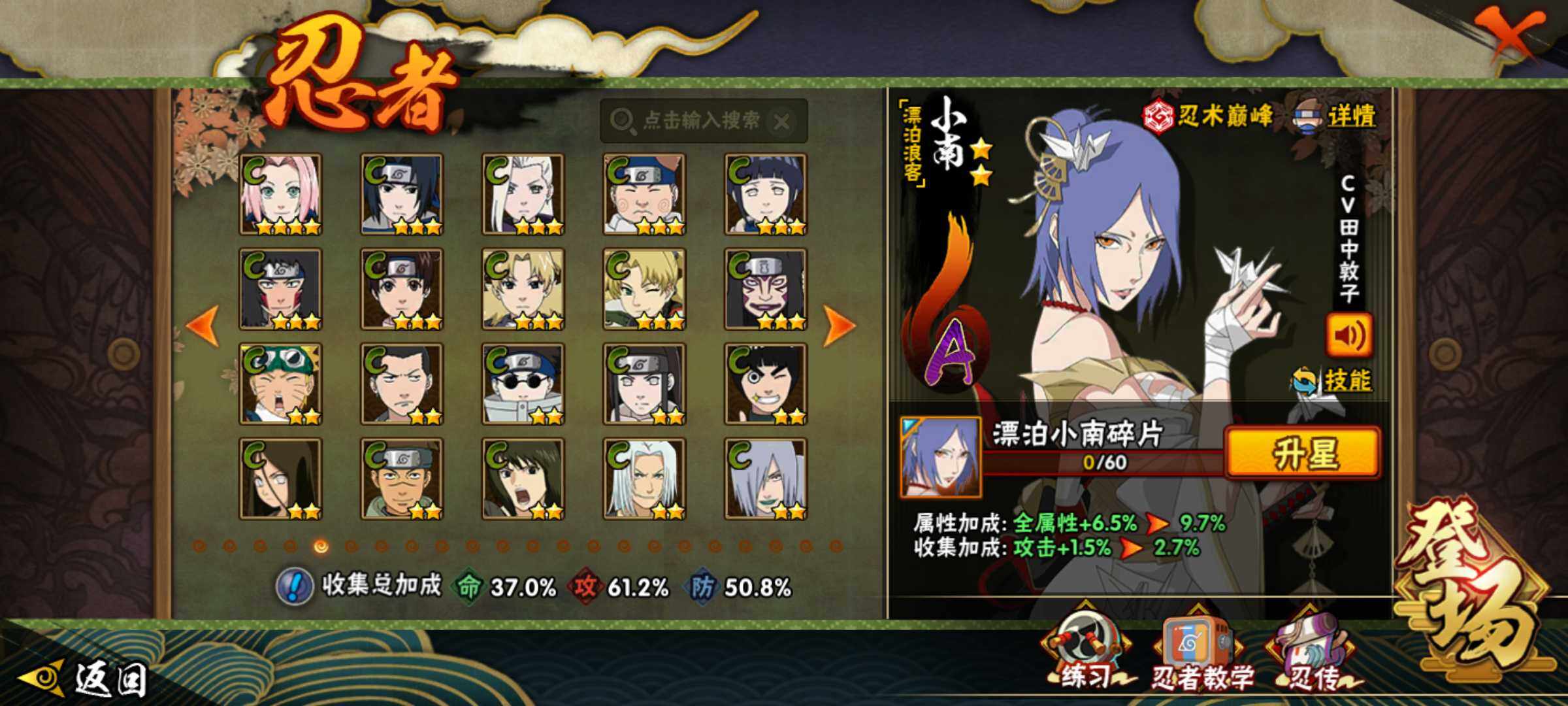 【S级忍者】:艾「忍界大战」(3星),宇智波鼬「须佐能乎」(3星),旗木卡卡西「须佐能乎」(3星),自来也「舞之豪杰」(3星),波风水门(3星),漩涡鸣人「九喇嘛连结」(3星),佩恩「天道」(3星),大筒木桃式(3星),漩涡鸣人·宇智波佐助(3星)