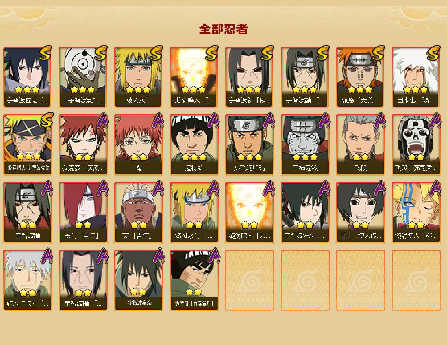 【S级忍者】:宇智波鼬「秽土转生」(3星),宇智波鼬「须佐能乎」(3星),自来也「舞之豪杰」(3星),波风水门(3星),漩涡鸣人「九喇嘛连结」(3星),佩恩「天道」(3星),宇智波佐助「永恒万花筒」(3星),宇智波斑 「白面具」(3星宇智波斑「白面具」),漩涡鸣人·宇智波佐助(3星)