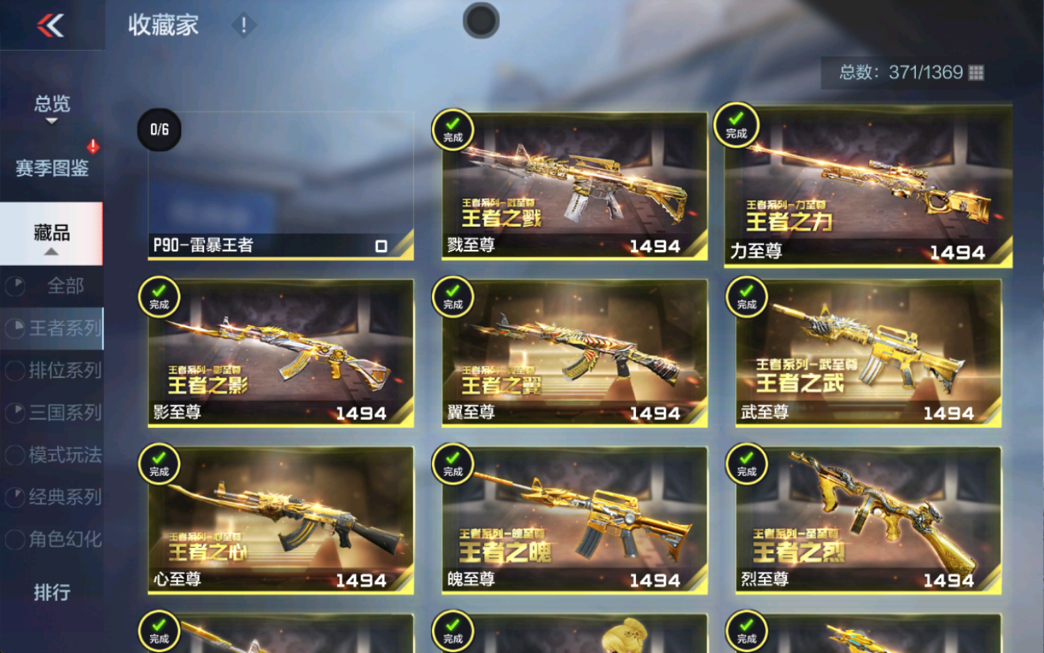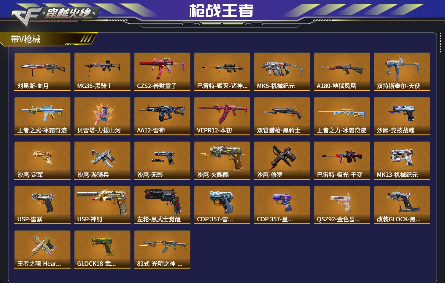 【王者武器】王者之技,王者之竞手雷,王者之竞烟雾弹,王者之竞闪光弹,王者之兽,M12S-雷霆王者,王者之蝶,雷霆王者之锋,M4A1-雷霆王者,王者之心手雷,王者之翼手雷,王者之影手雷,王者之兽手雷,王者之心烟雾弹,王者之心闪光弹,王者之翼闪光弹,王者之
