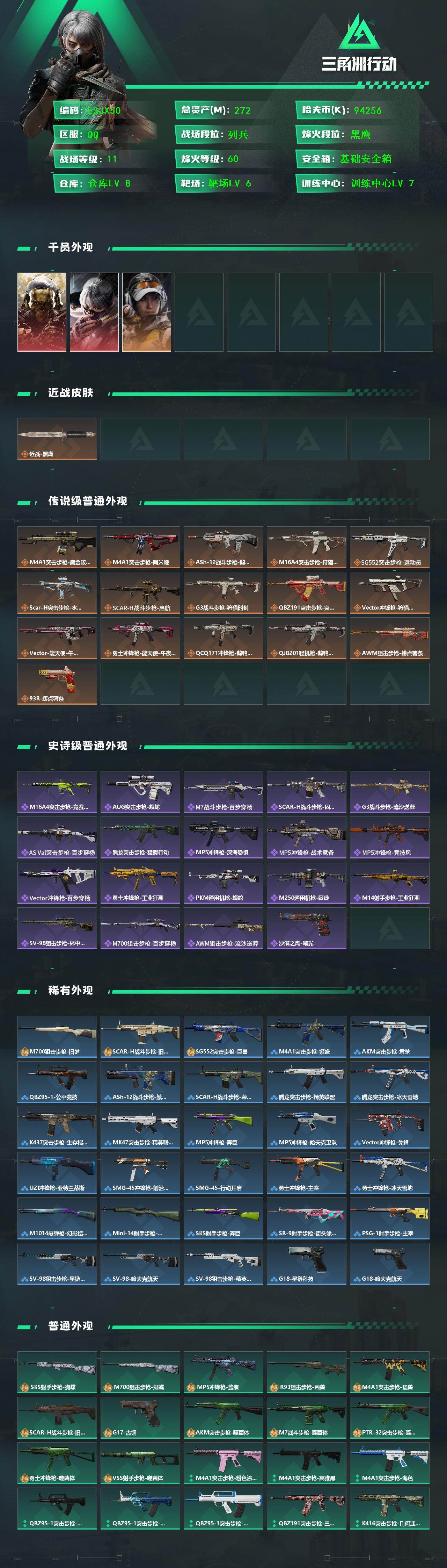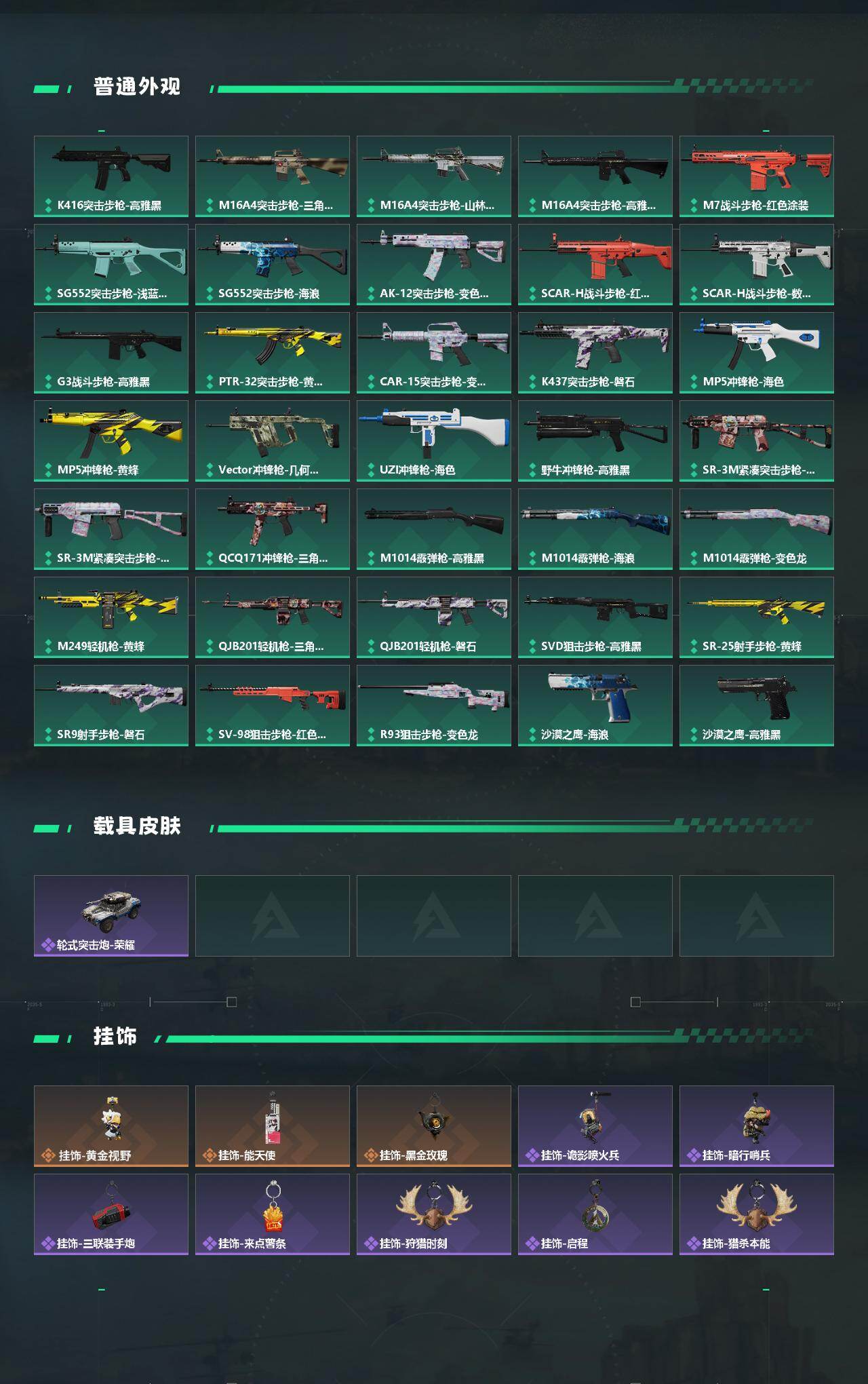 【传说外观】:M4A1突击步枪-蚀金玫瑰,M4A1突击步枪-阿米娅,ASh-12战斗步枪-鹅鸭杀,M16A4突击步枪-狩猎时刻,SG552突击步枪-运动员,SCAR-H战斗步枪-水墨云图,SCAR-H战斗步枪-启航,G3战斗步枪-狩猎时刻,腾龙突击步枪-捞点薯条,Vector冲锋枪-狩猎时刻,Vector冲锋枪-