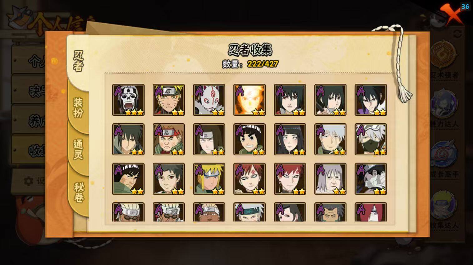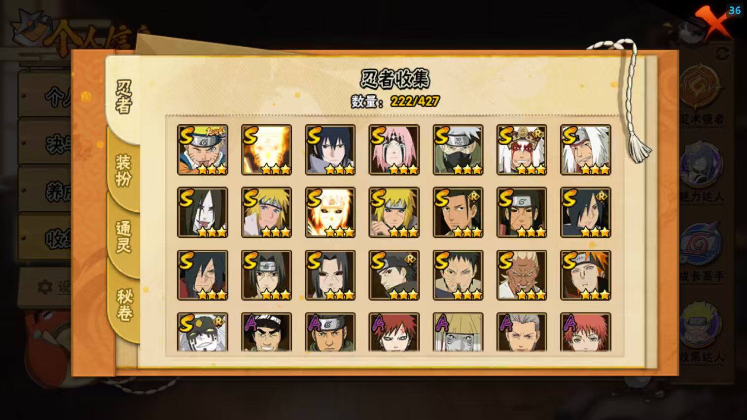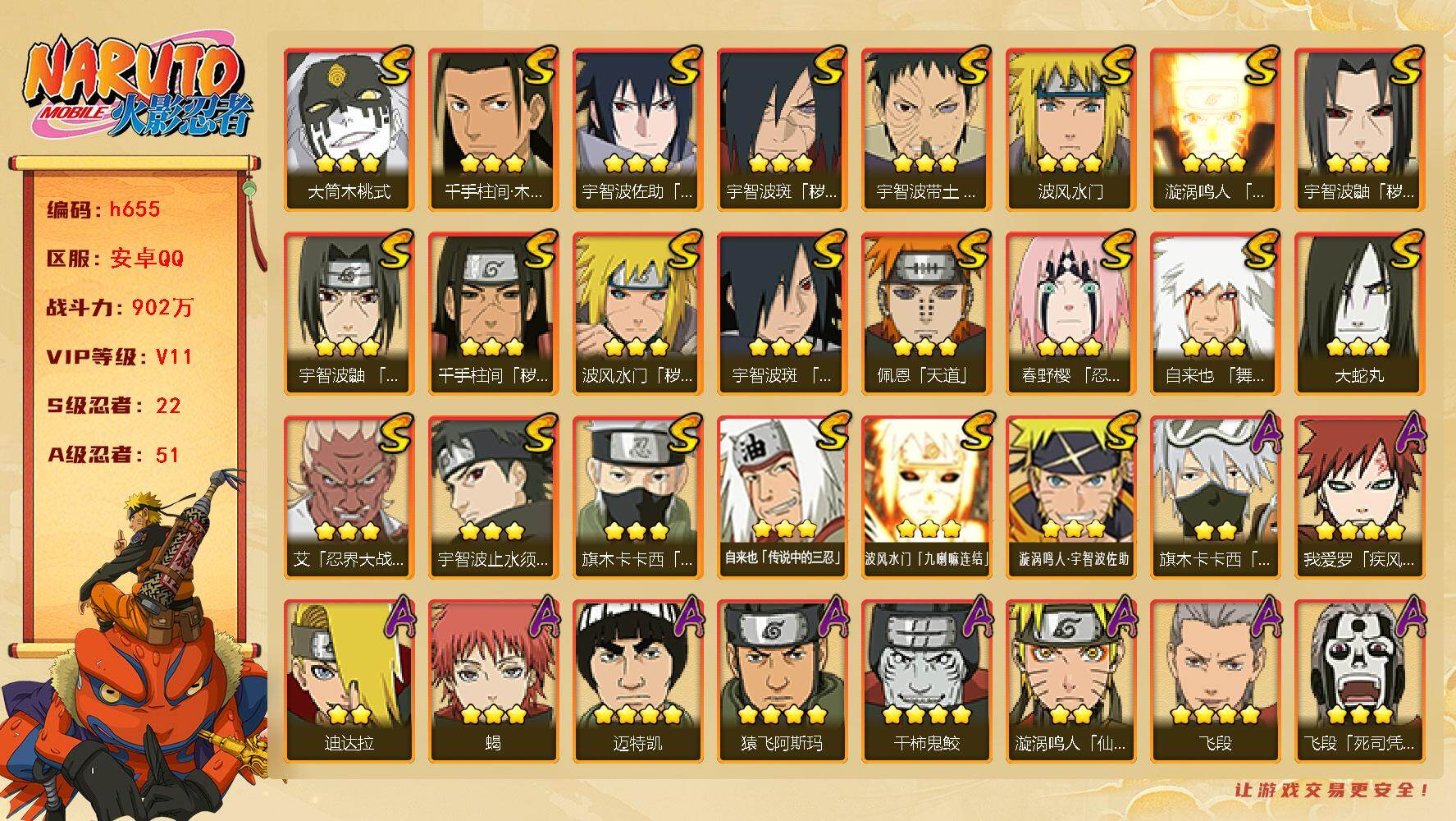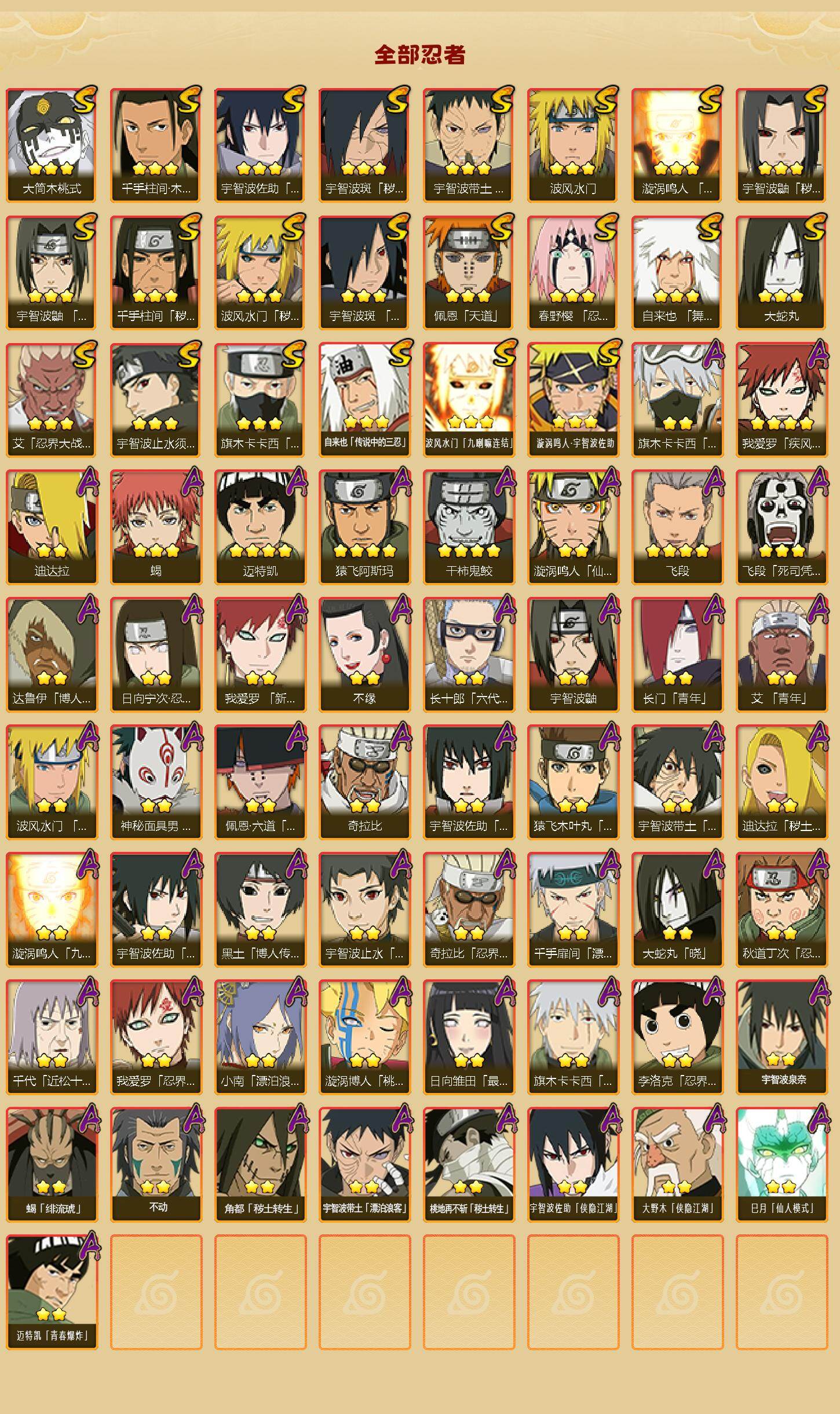 22S级忍者数-51A级忍者数【S级忍者】:波风水门「秽土转生」(3星),千手柱间「秽土转生」(3星),宇智波鼬「秽土转生」(3星),宇智波斑「秽土转生·解」(3星),春野樱「忍界大战」(3星),宇智波带土「忍界大战」(3星),艾「忍界大战」(3星),宇智波鼬「须佐能乎」(3星),宇智波止水「须佐能乎」(3星),旗木卡卡西「须佐能乎」(3星),宇智波斑「木叶创立」(3星),千手柱间「木叶创立」(3星),自来也「舞之豪杰」(3星),大蛇丸(3星),自来也「传说中的三忍」(3星),波风水门(3星),