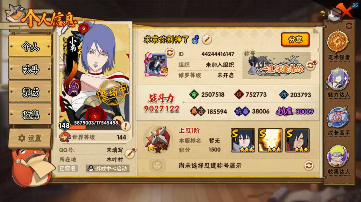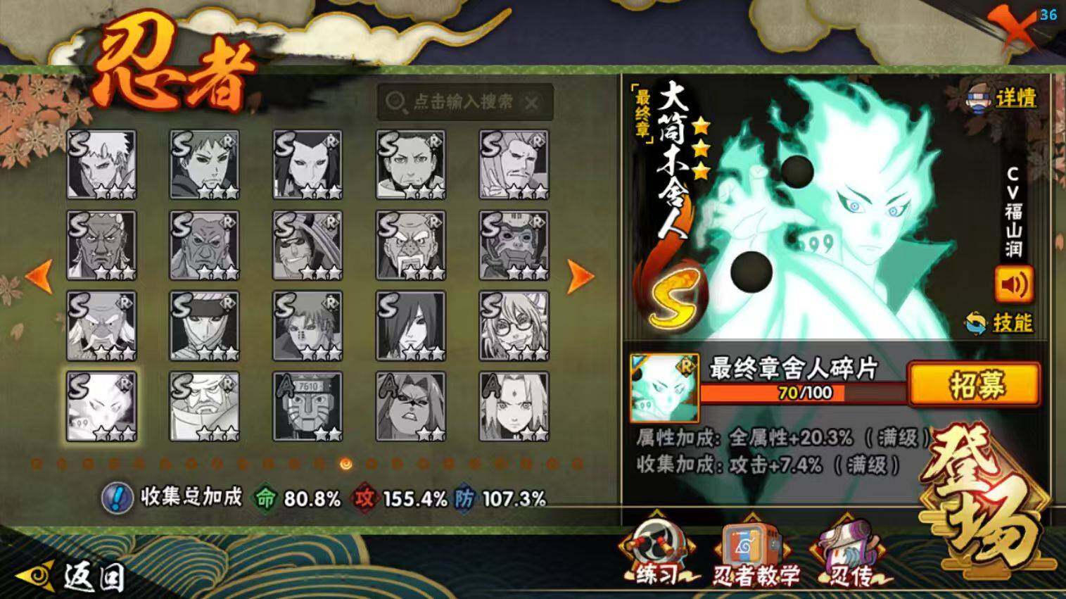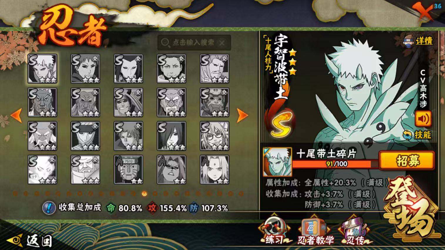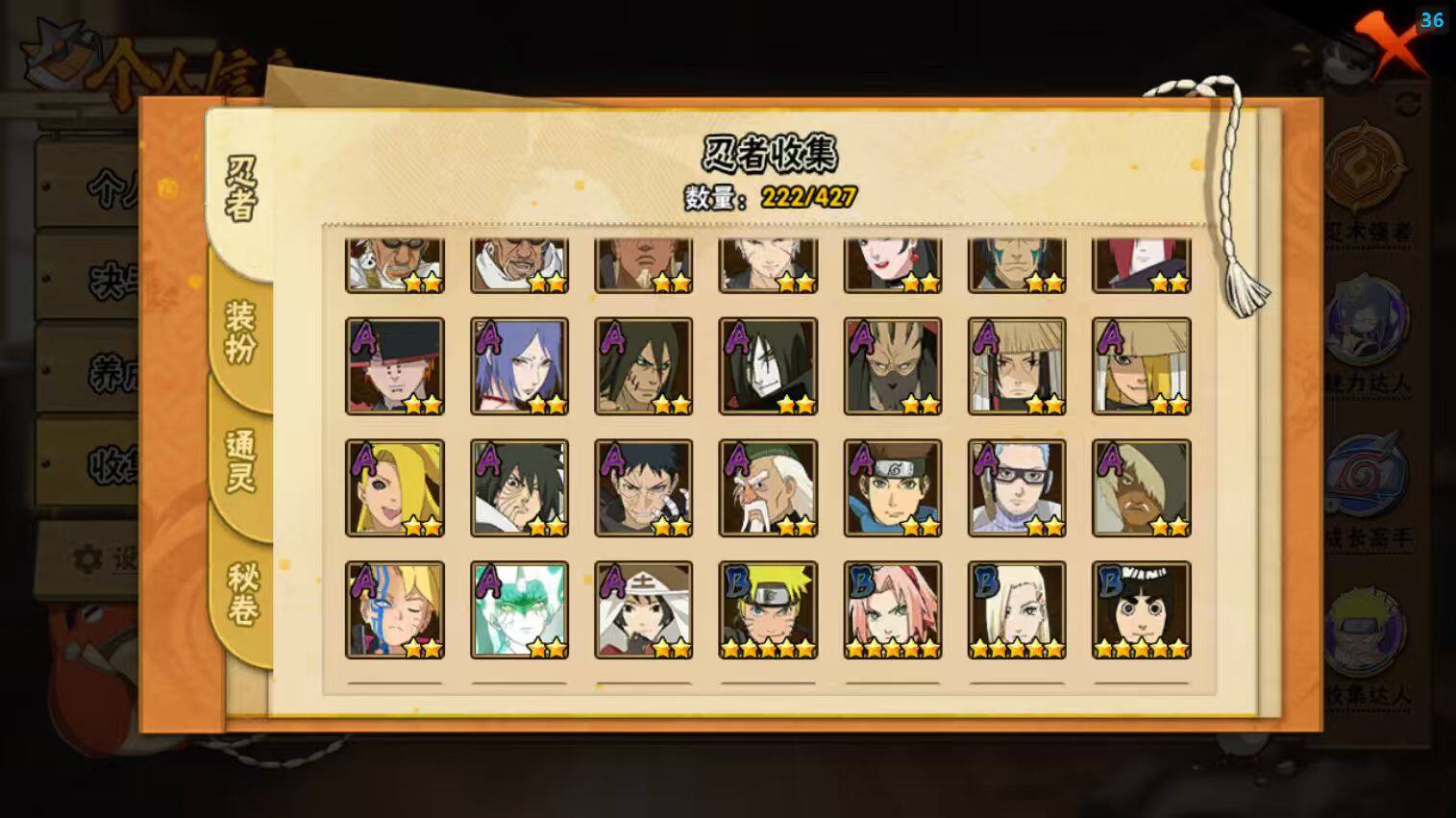 22S级忍者数-51A级忍者数【S级忍者】:波风水门「秽土转生」(3星),千手柱间「秽土转生」(3星),宇智波鼬「秽土转生」(3星),宇智波斑「秽土转生·解」(3星),春野樱「忍界大战」(3星),宇智波带土「忍界大战」(3星),艾「忍界大战」(3星),宇智波鼬「须佐能乎」(3星),宇智波止水「须佐能乎」(3星),旗木卡卡西「须佐能乎」(3星),宇智波斑「木叶创立」(3星),千手柱间「木叶创立」(3星),自来也「舞之豪杰」(3星),大蛇丸(3星),自来也「传说中的三忍」(3星),波风水门(3星),