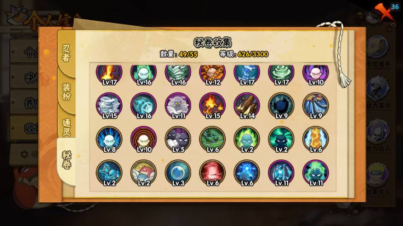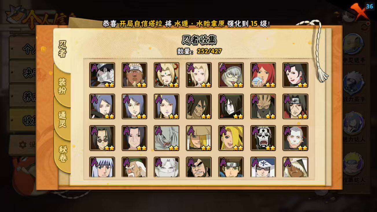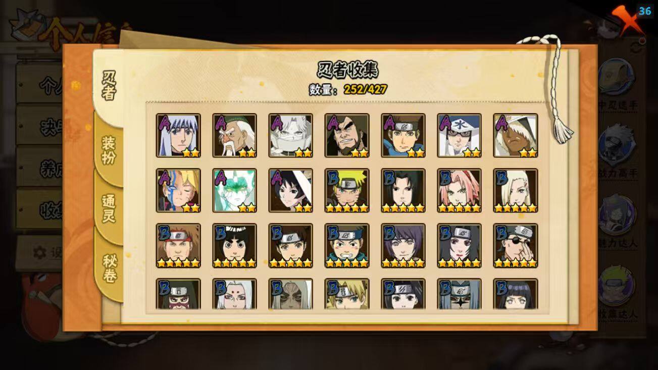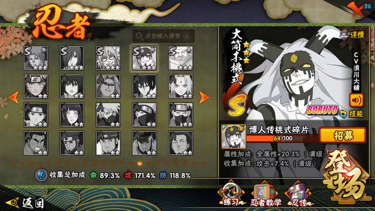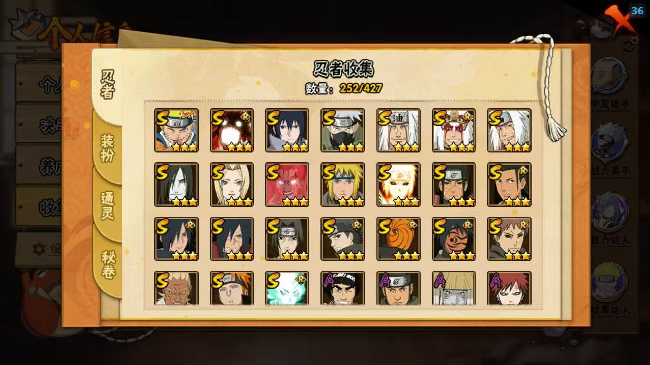 24S级忍者数-63A级忍者数【S级忍者】:千手柱间「秽土转生」(3星),宇智波斑「秽土转生·解」(3星),艾「忍界大战」(3星),宇智波鼬「须佐能乎」(3星),宇智波止水「须佐能乎」(3星),旗木卡卡西「须佐能乎」(3星),宇智波斑「木叶创立」(3星),千手柱间「木叶创立」(3星),罗砂「四代目风影」(3星),自来也(3星),自来也「舞之豪杰」(3星),大蛇丸(3星),自来也「传说中的三忍」(3星),纲手(3星),波风水门(3星),神秘面具男「红夜之刃」(3星),迈特凯「死门」(3星),佩恩「