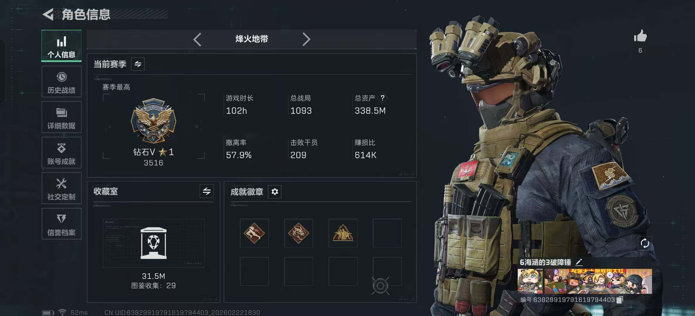 【SJ1196】339m总资产-142652k哈伏币-60烽火等级-钻石-1战场等级-无军衔