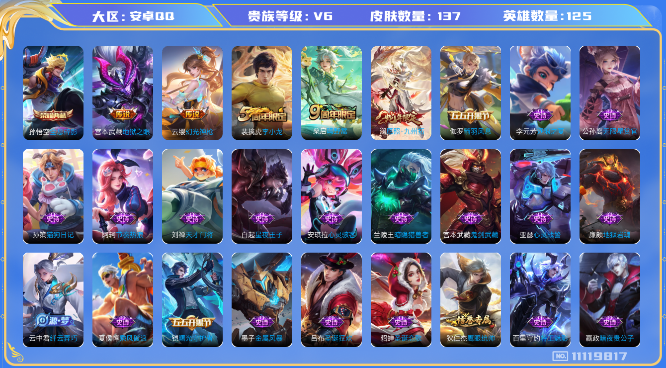 【编号79613可秒换绑】【店长推荐精品号!】店长推荐特价处理精品号安卓Q-V6-至尊星耀I段位-125英雄-137皮肤-1典藏-0珍品无双-0无双-0珍品传说-4传说-42史诗【荣耀典藏】:孙悟空全息碎影【内测皮肤】:高渐离玩趣恶龙,狂铁特工战影【传说皮肤】:宫本武藏地狱之眼,桑启鸣野蒿,云缨幻光神枪,澜愿照九州拓【限定皮肤】:蒙犽顽岩魄,蔡文姬夏日便利店,虞姬夏日便利店,姜子牙天穹之誓,狄仁杰阴阳师,赵云皇家上将,高渐离玩趣恶龙,狄仁杰魔术师,项羽海滩派对,裴擒虎李小龙,裴擒虎擒涛扼浪,狂铁