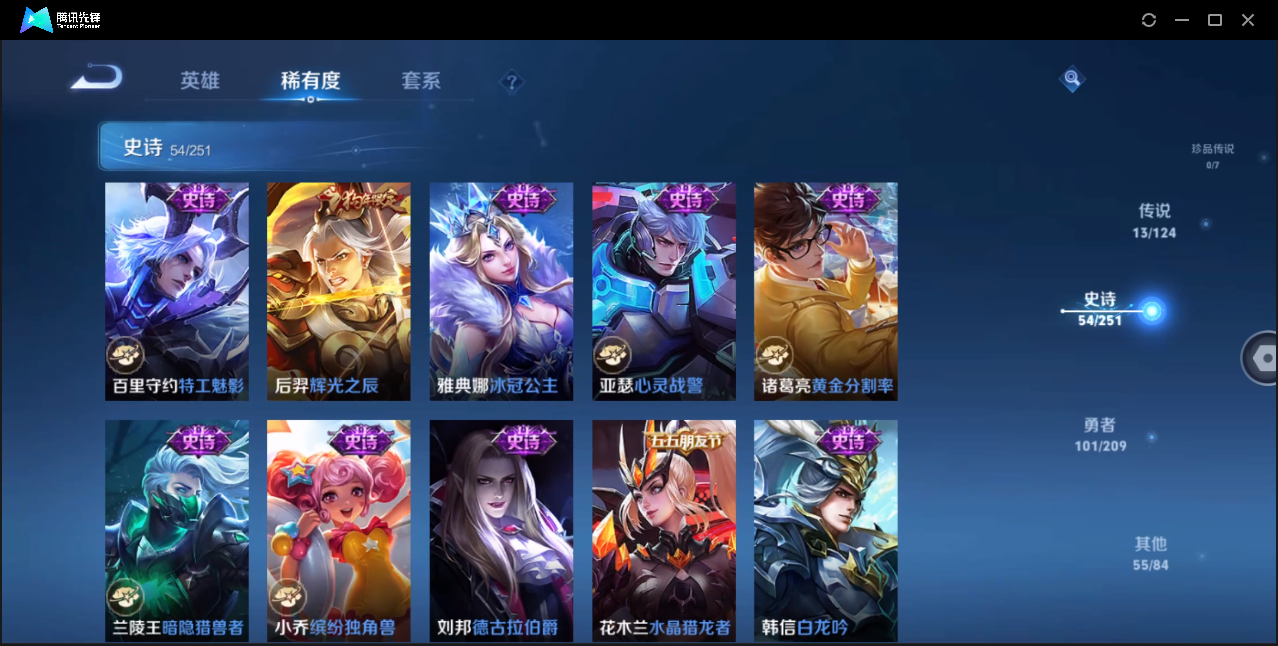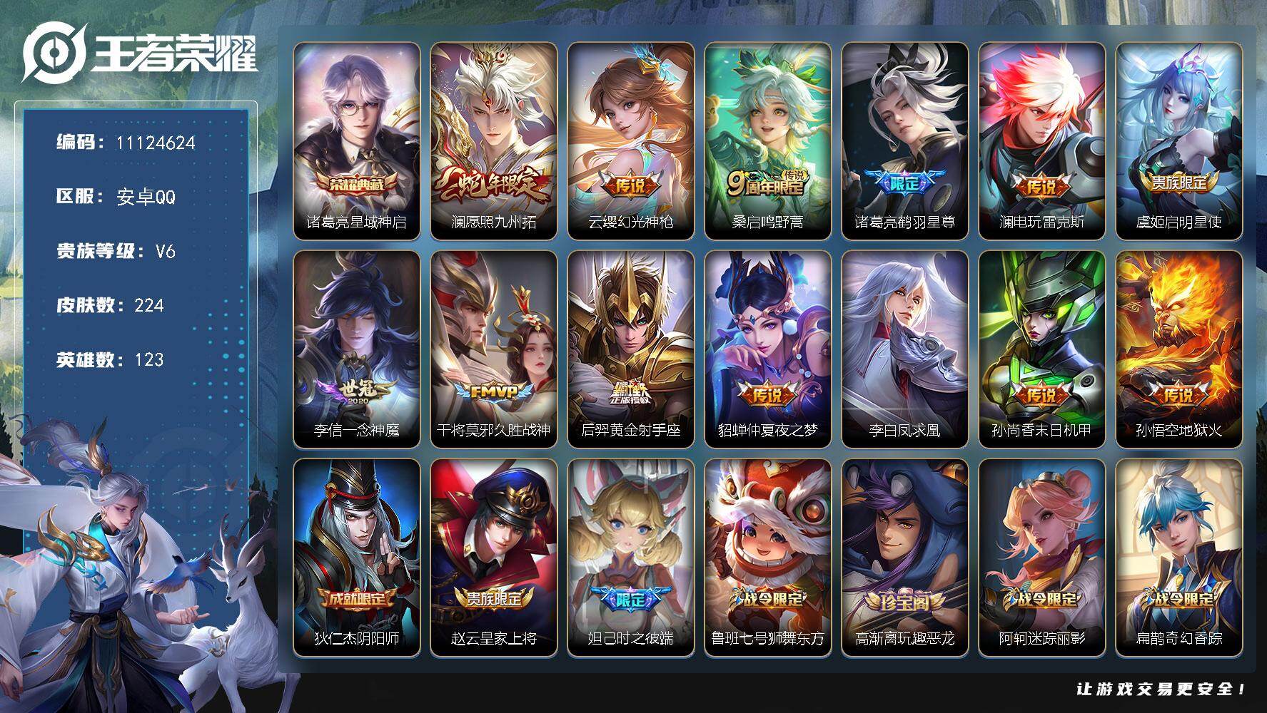 安卓Q-V6-最强王者段位-123英雄-224皮肤-1典藏-0珍品无双-0无双-0珍品传说-13传说-54史诗