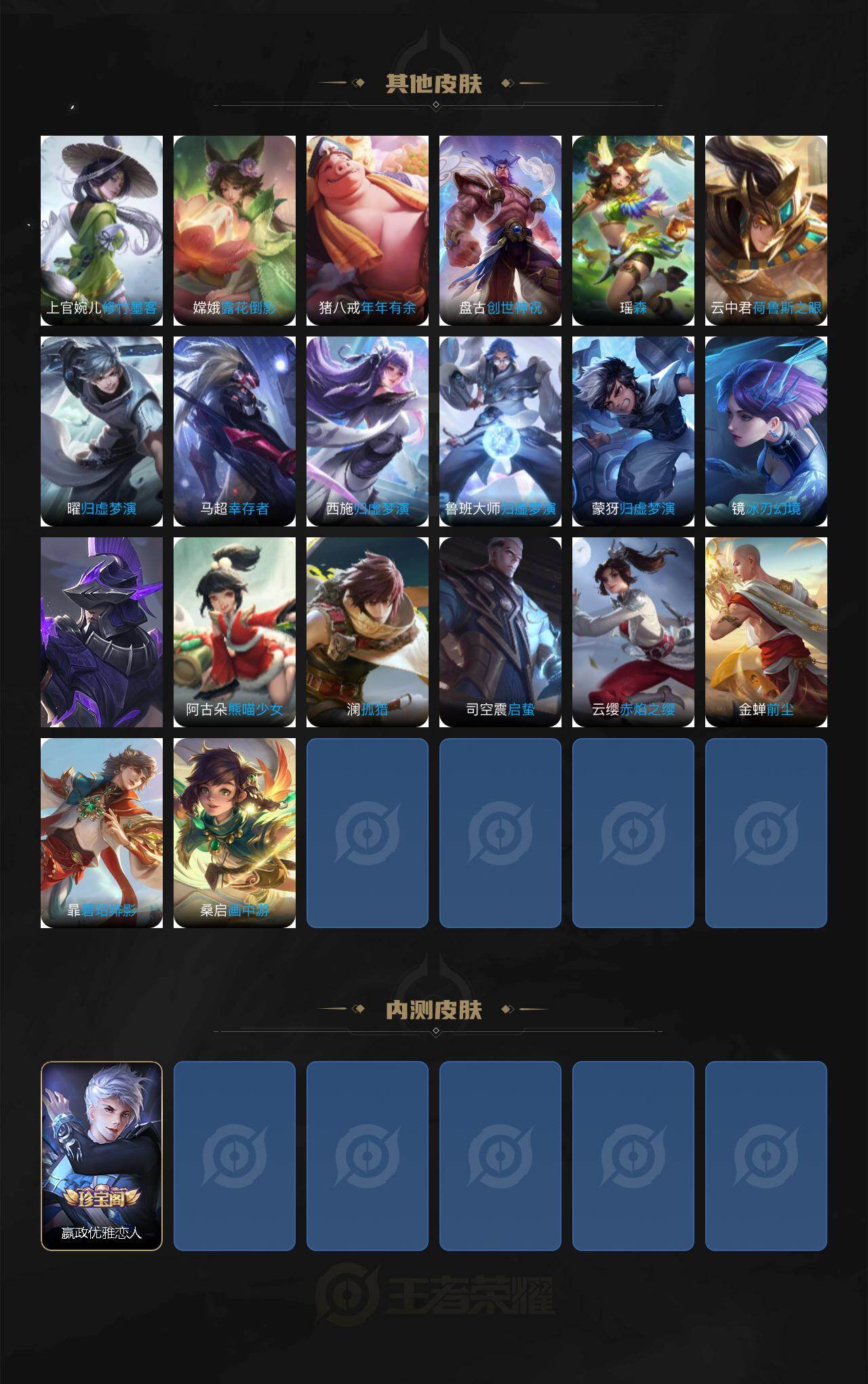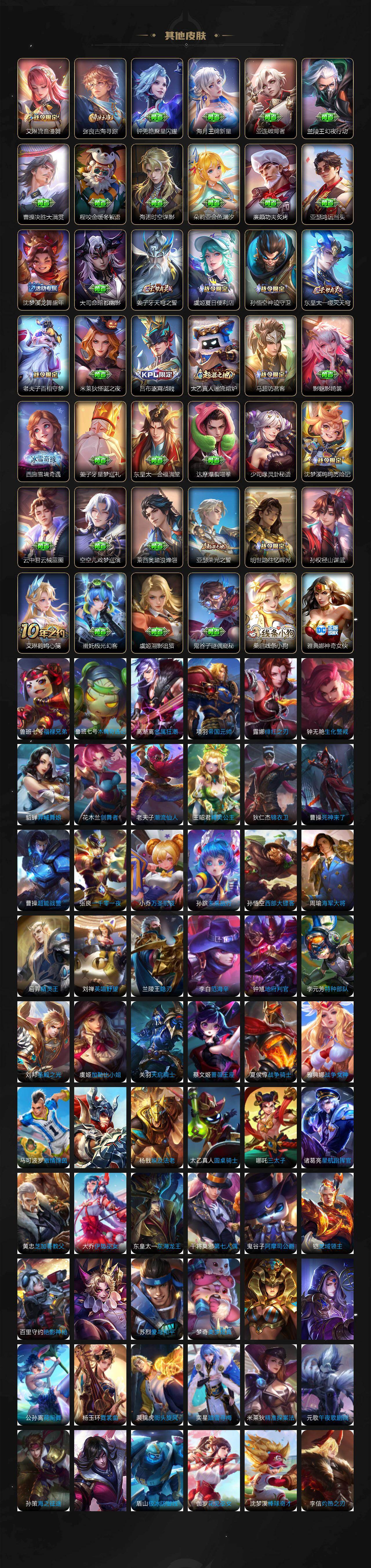 【英雄全皮】:孙权全皮,娜可露露全皮,李信全皮,澜全皮,夏洛特全皮,司空震全皮,金蝉全皮,赵怀真全皮,莱西奥全皮,空空儿全皮,影全皮