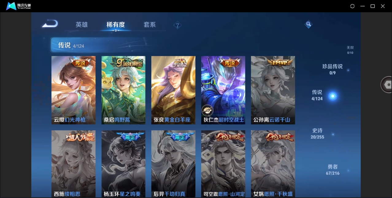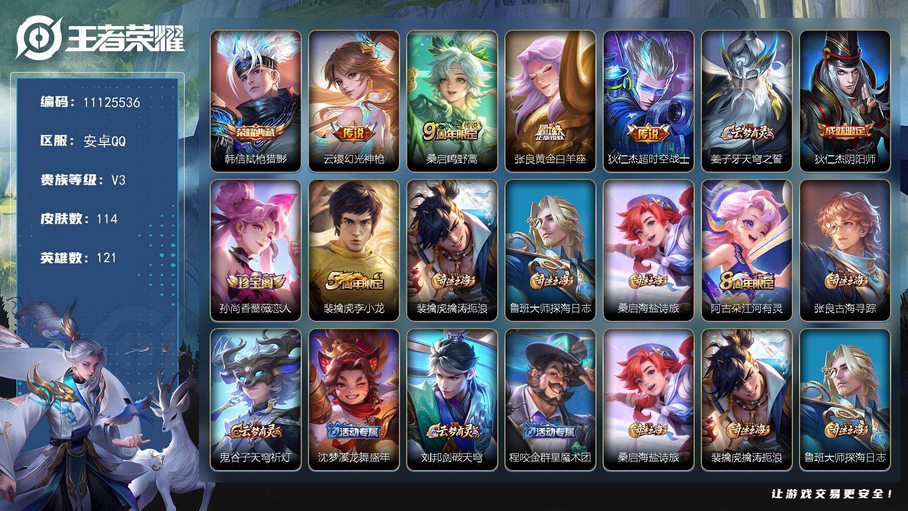 安卓Q-V3-最强王者段位-121英雄-114皮肤-1典藏-0珍品无双-0无双-0珍品传说-4传说-20史诗