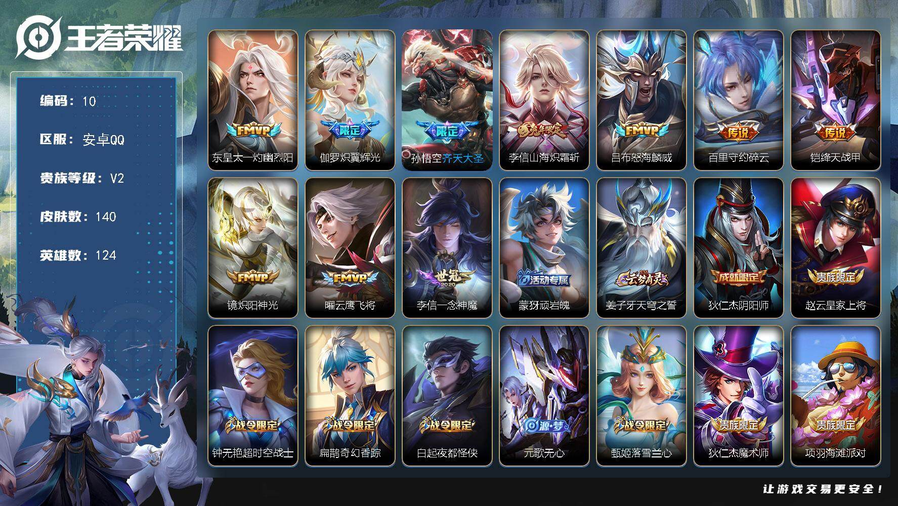 【编号70668 可秒换绑】【新手号 适合回坑玩家皮肤质量扎实!!】安卓Q-V2-尊贵铂金IV段位-124英雄-140皮肤-0典藏-0珍品无双-0无双-0珍品传说-10传说-43史诗【传说皮肤】:东皇太一灼幽烈阳,伽罗炽翼辉光,孙悟空齐天大圣,李信山海炽霜斩,吕布怒海麟威,百里守约碎云,铠绛天战甲,镜炽阳神光,曜云鹰飞将,李信一念神魔【限定皮肤】:蒙犽顽岩魄,姜子牙天穹之誓,狄仁杰阴阳师,赵云皇家上将,钟无艳超时空战士,扁鹊奇幻香踪,白起夜都怪侠,元歌无心,甄姬落雪兰心,狄仁杰魔术师,项羽海滩派