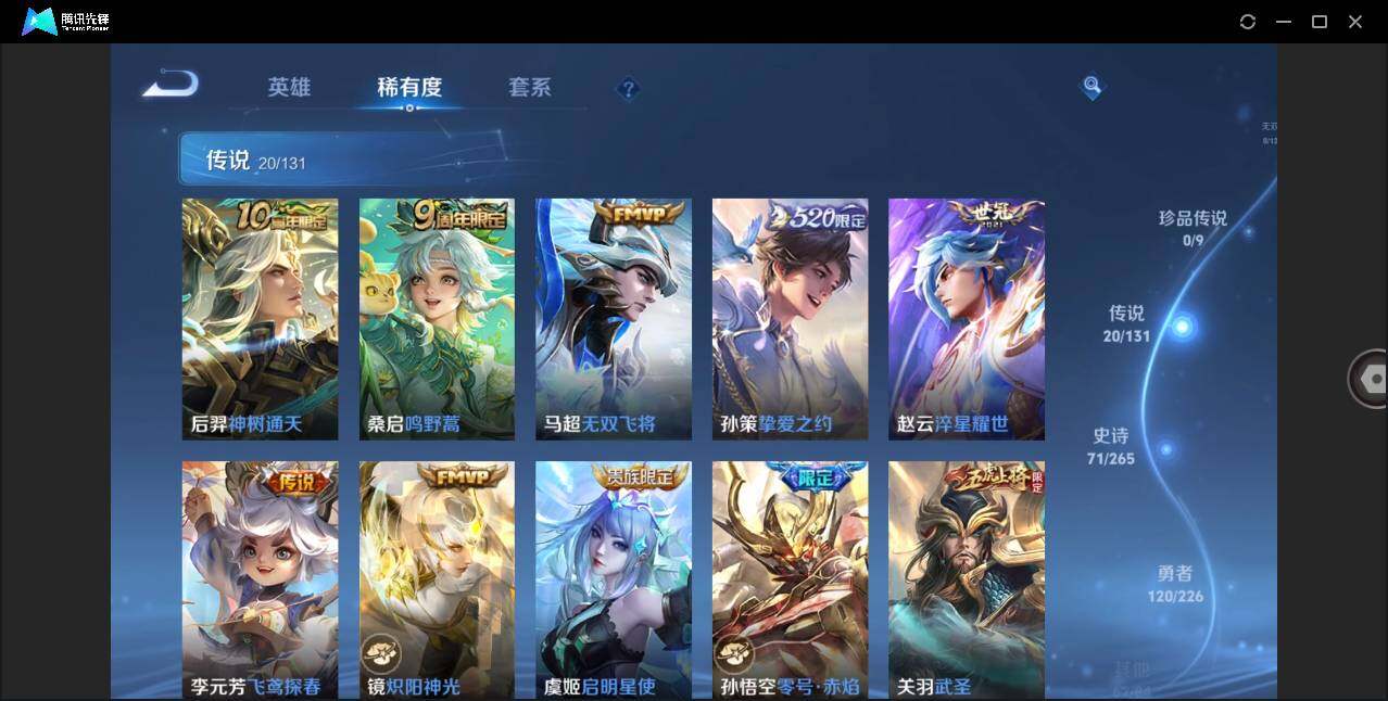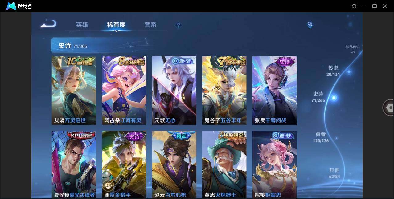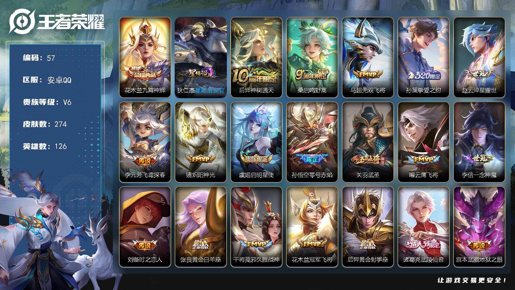 安卓Q-V6-最强王者段位-126英雄-274皮肤-1典藏皮肤-20传说-71史诗