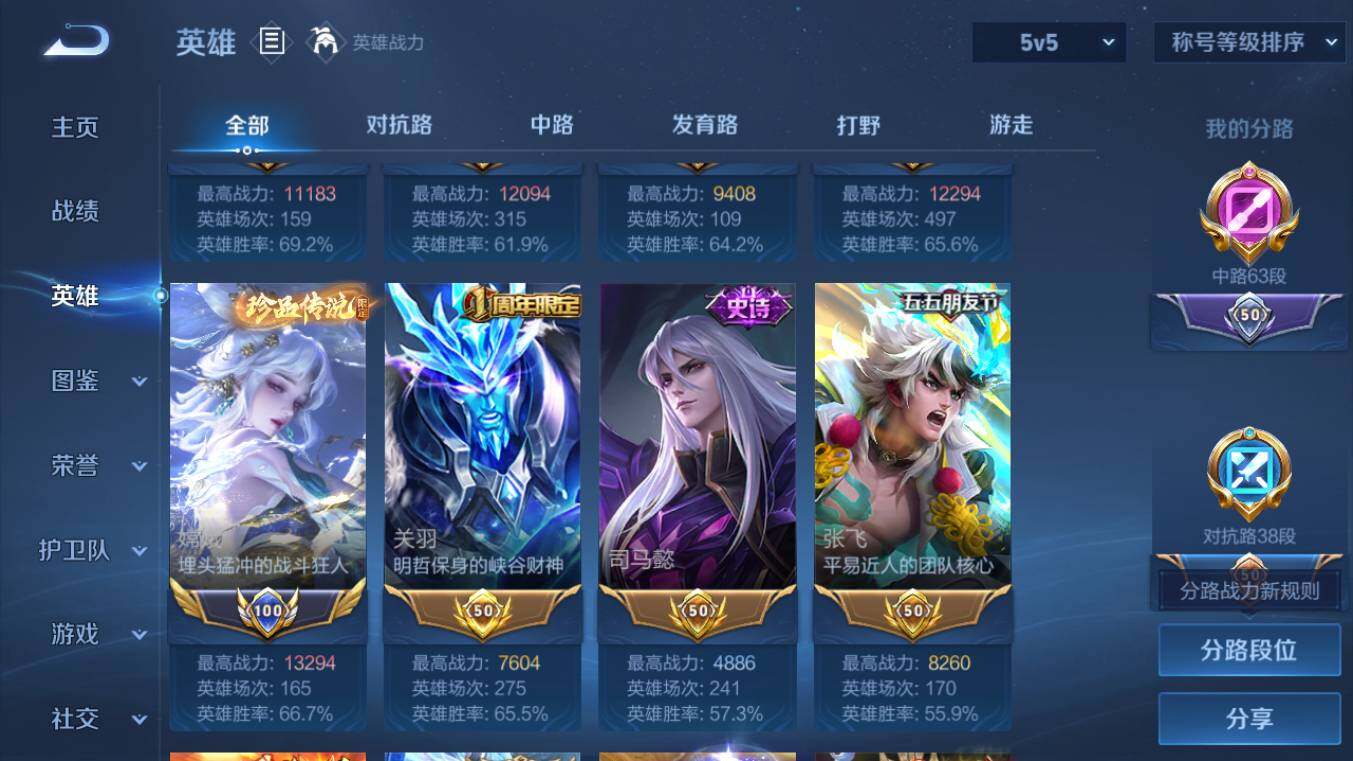 安卓Q-V10-【全能大师/中路63段/历史5小国标嫦娥/国标张良/国标不知火舞/国标扁鹊/国标杨玉环】-123英雄-488皮肤-11典藏皮肤-1典藏英雄-3无双-1珍品传说-66传说-176史诗