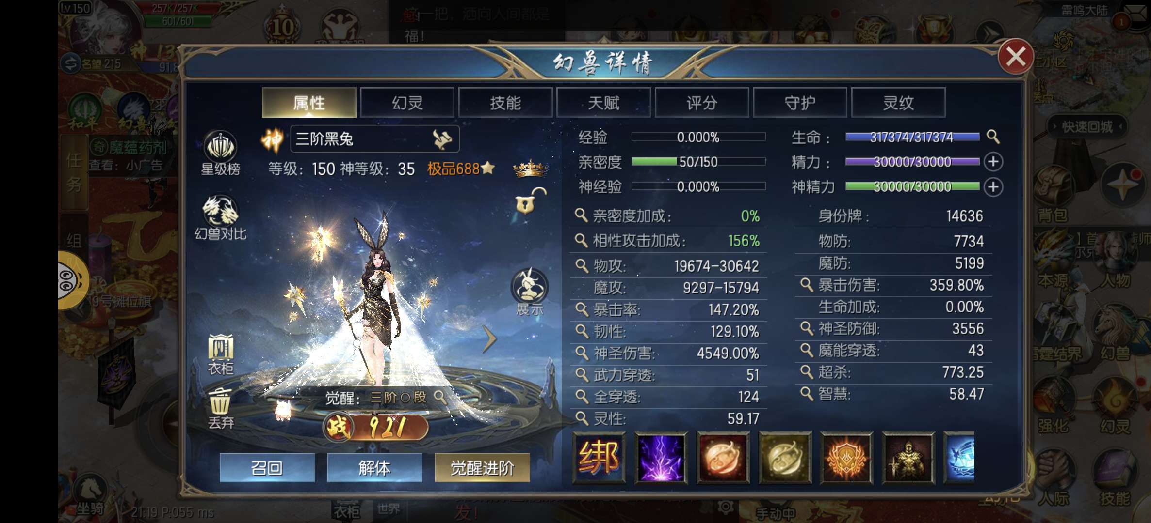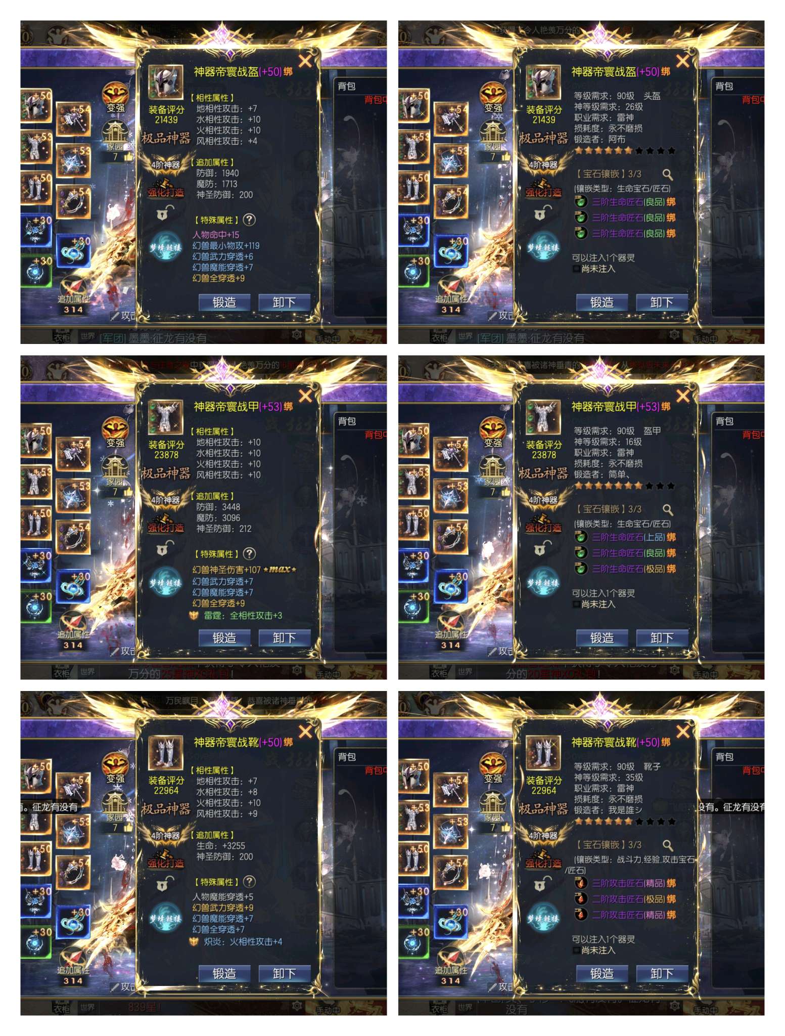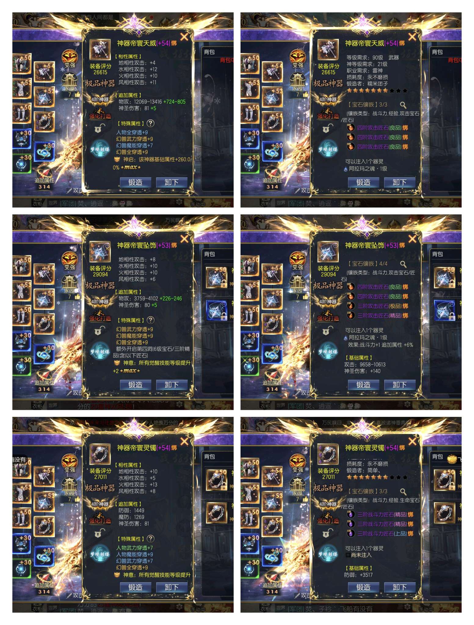 装备:一套三洞,项链是4洞,属性装备,武器神启260,项链手镯神意,幻穿套