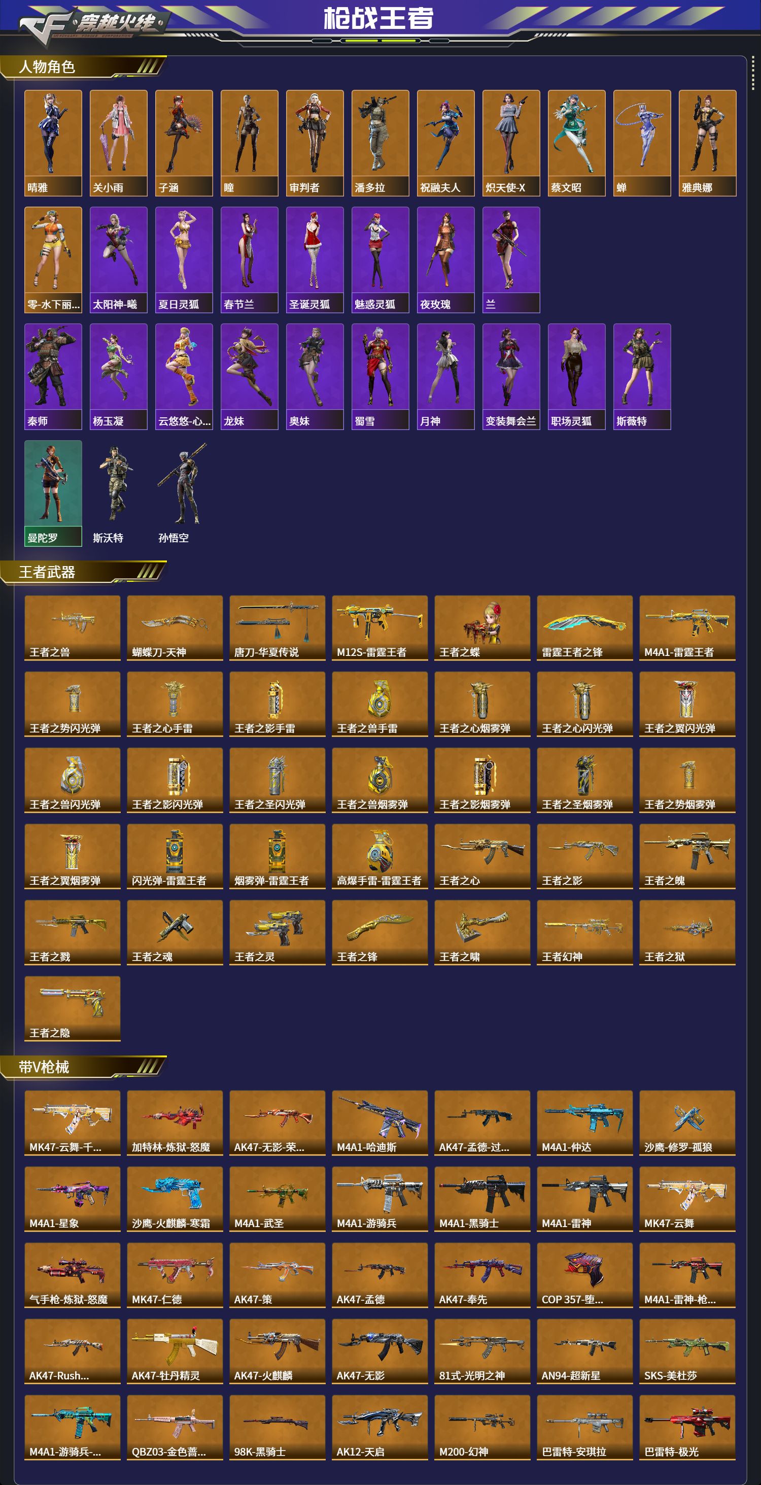 【人物角色】晴雅,孙悟空,关小雨,子涵,瞳,太阳神-曦,大老师,龙的传人-王力宏,夏日灵狐,春节兰,夜玫瑰-2017,圣诞灵狐,刀锋-2017,魅惑灵狐,审判者,曼陀罗,夜玫瑰,兰,潘多拉,斯沃特,秦师,祝融夫人,炽天使-X,杨玉凝,云悠悠-心动起点,蔡文昭,龙