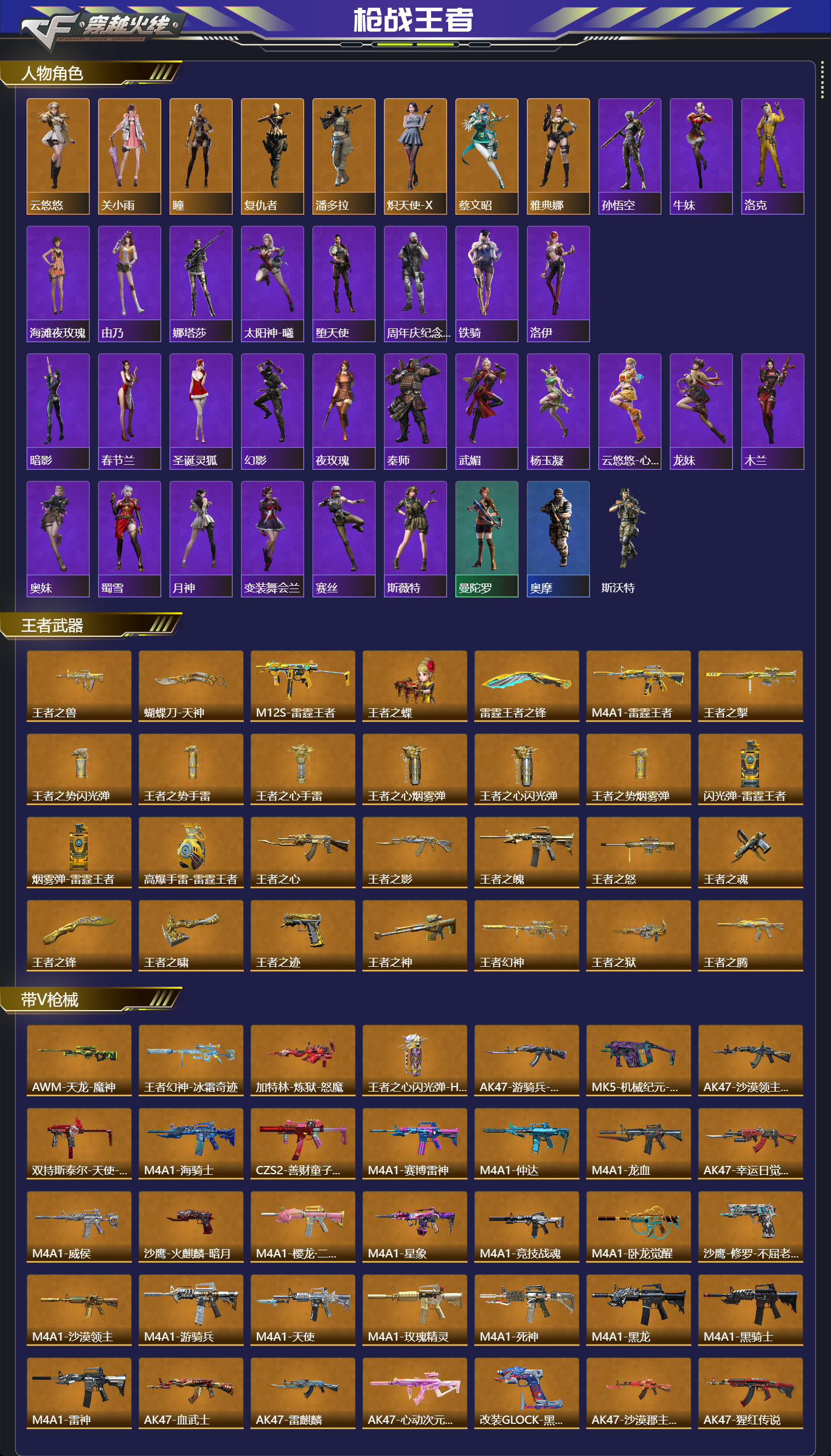 【人物角色】孙悟空,牛妹,洛克,云悠悠,关小雨,海滩夜玫瑰,由乃,瞳,潜龙队,娜塔莎,太阳神-曦,大老师,堕天使,周年庆纪念赛斯,复仇者,运动宝贝兰,铁骑,洛伊,暗影,春节兰,圣诞灵狐,刀锋-2017,曼陀罗,幻影,夜玫瑰,潘多拉,奥摩,斯沃特,秦师,炽天使-X,武媚,杨玉凝,云