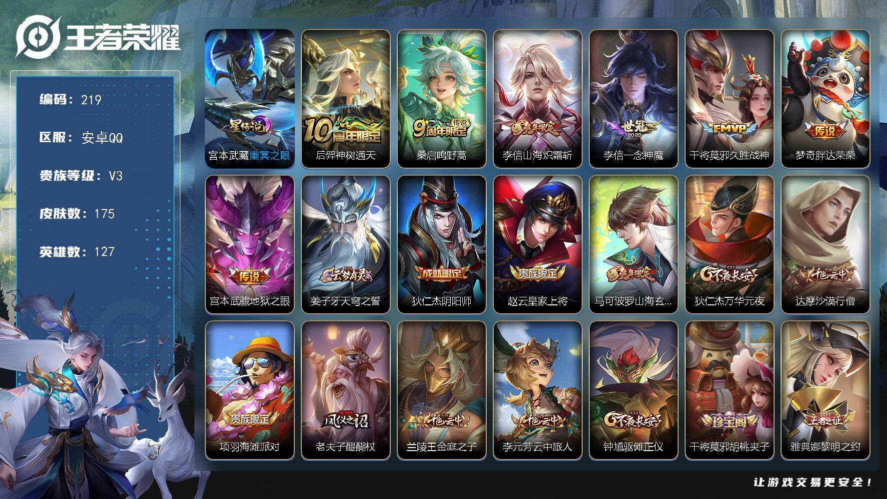 安卓Q-V3-至尊星耀IV段位-127英雄-175皮肤-7传说-45史诗