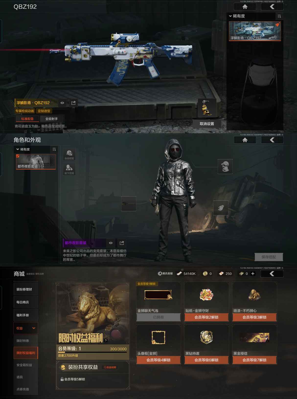 MWT4676【仓库价值104.9M 柯恩币54140K 4金枪】安卓Q-等级30-仓库价值104.9m-科恩币54140k-【套装】 都市夜影套装 【枪皮】 告丧夜曲·AUG 旧王圣谕·QBZ191 浮鳞影青·QBZ192 【近战武器】