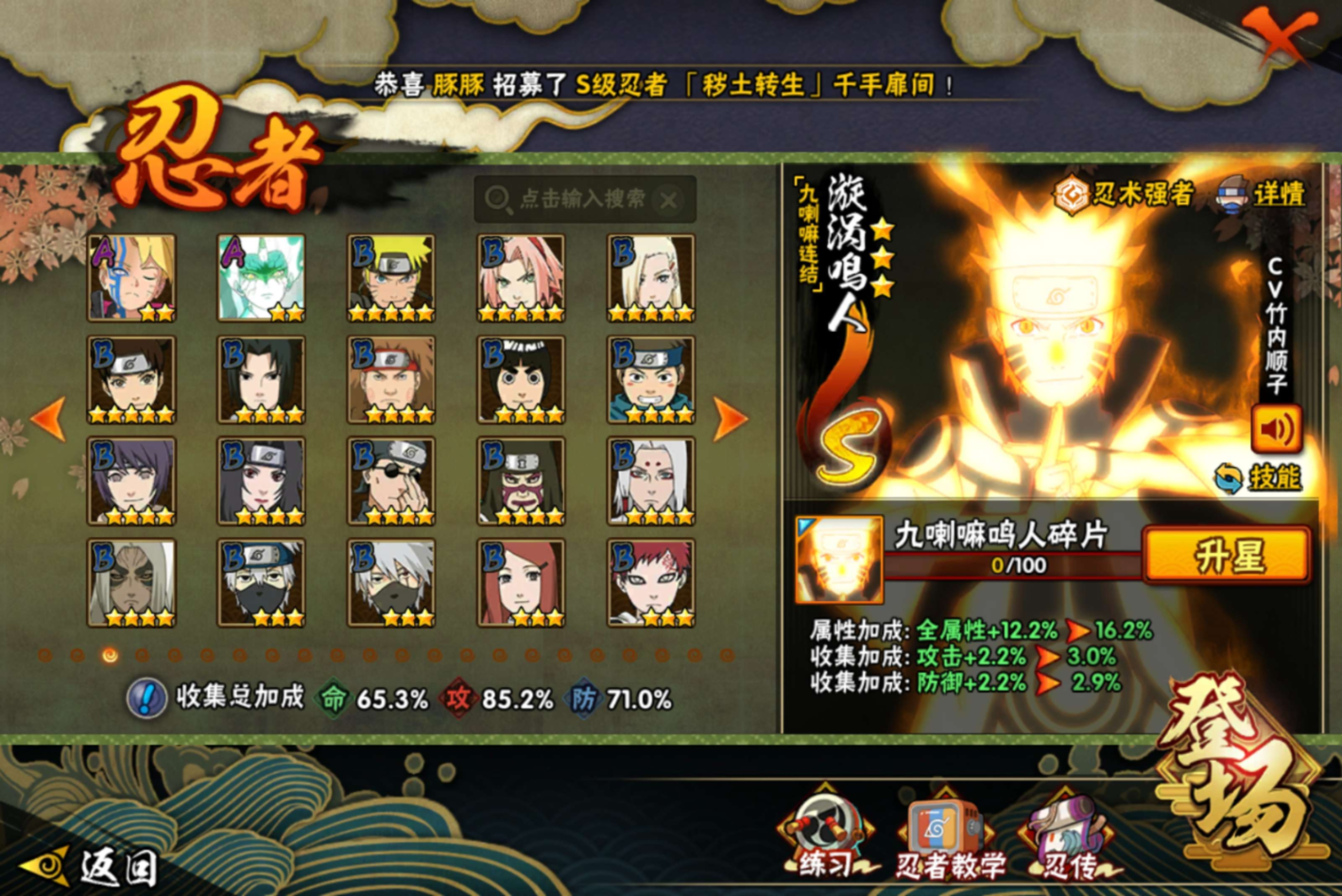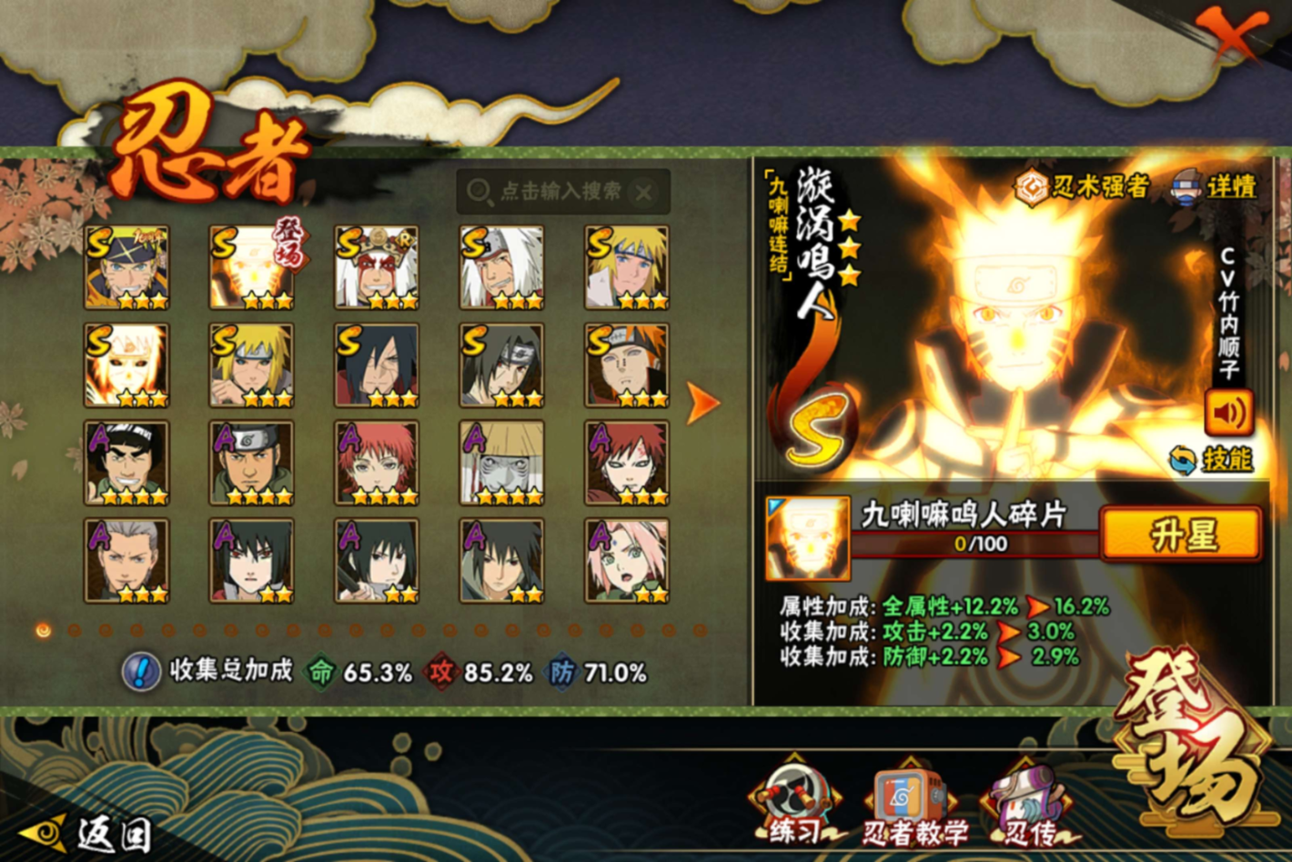 【S级忍者】自来也「传说中的三忍」(3星),宇智波斑「秽土转生·解」(3星),漩涡鸣人「九喇嘛连结」(3星),波风水门「九喇嘛连结」(3星),波风水门「秽土转生」(3