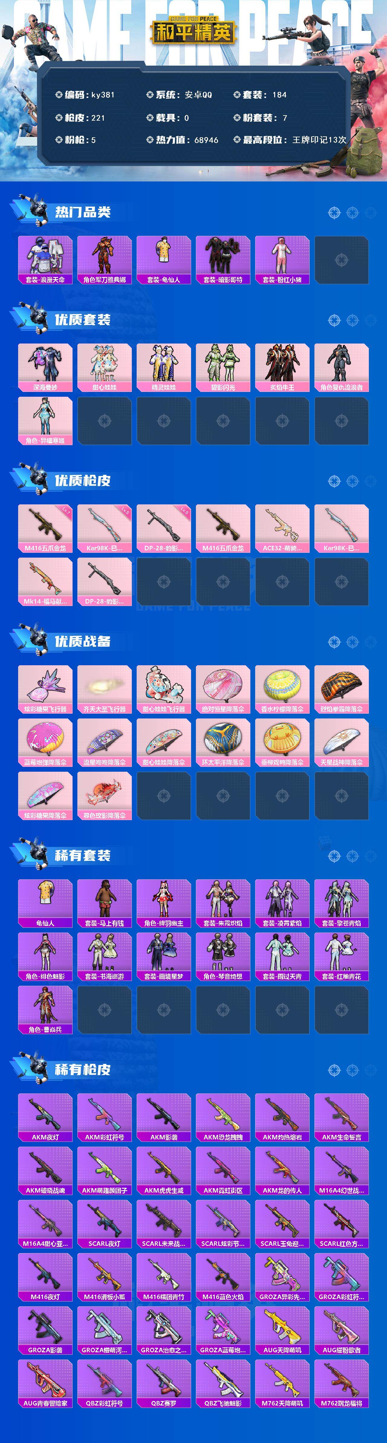 安卓 手Q-7粉装-5特效枪-0载具-3粉色飞行器-68946热力值-13王牌印记-184套装-221枪皮