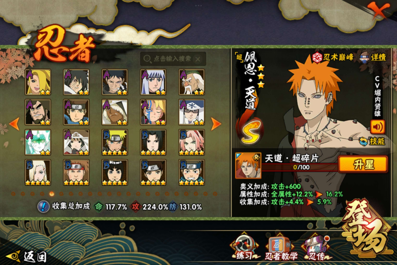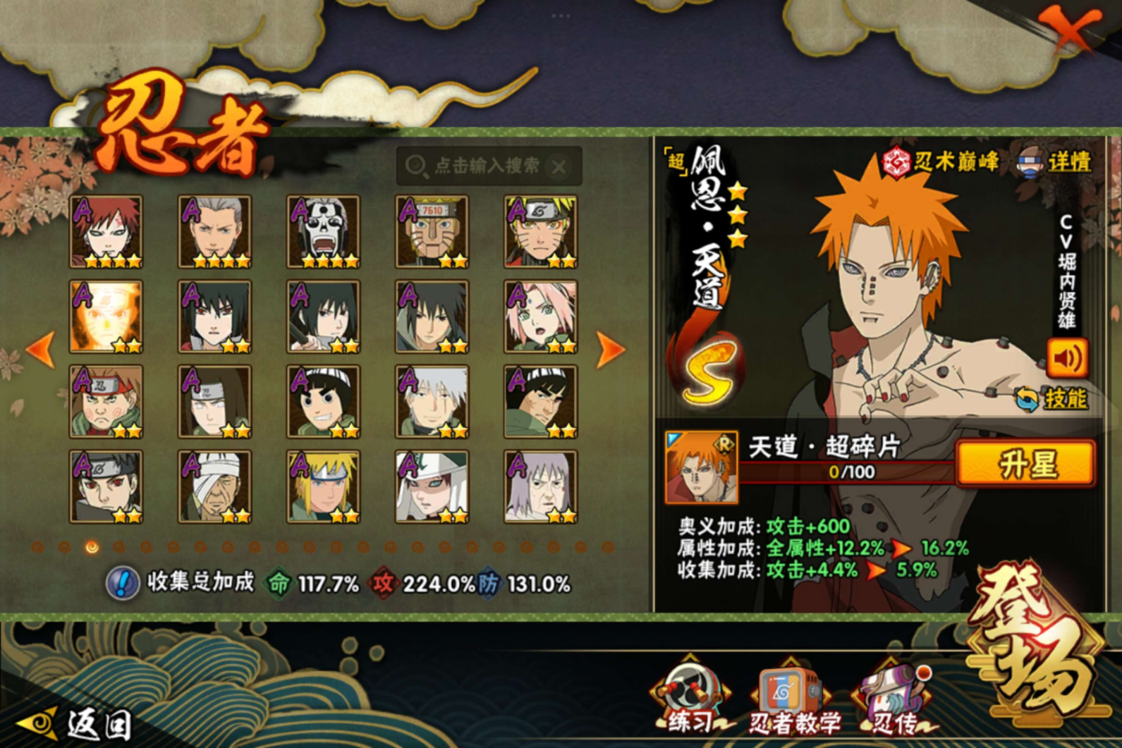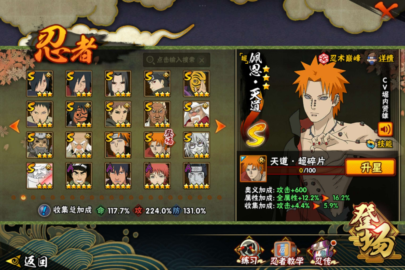 【S级忍者】宇智波带土「忍界大战」(3星),宇智波斑「木叶创立」(3星),迈特凯「死门」(3星),大野木「忍界大战」(3星),旗木卡卡西「须佐能乎」(3星),自来也「传说中的三忍」(3星),宇智波斑「秽土转生·解」(3星),宇智波佐助「永恒万花筒」(3星),神秘面具男「红夜之