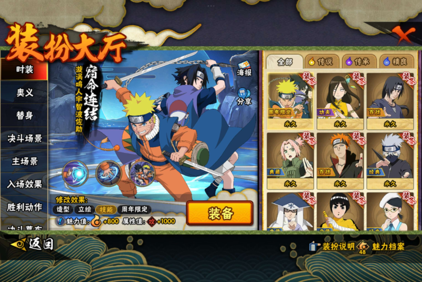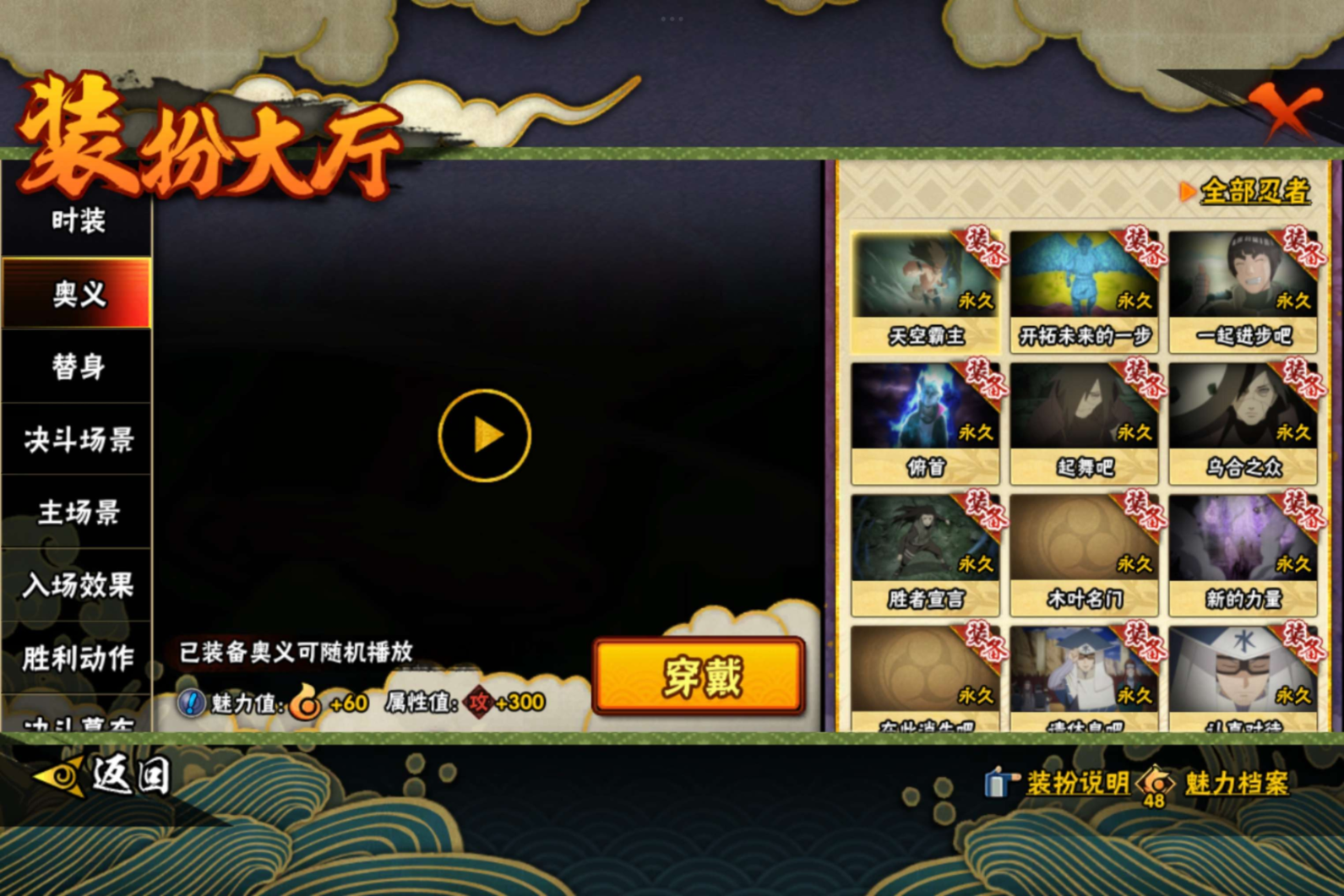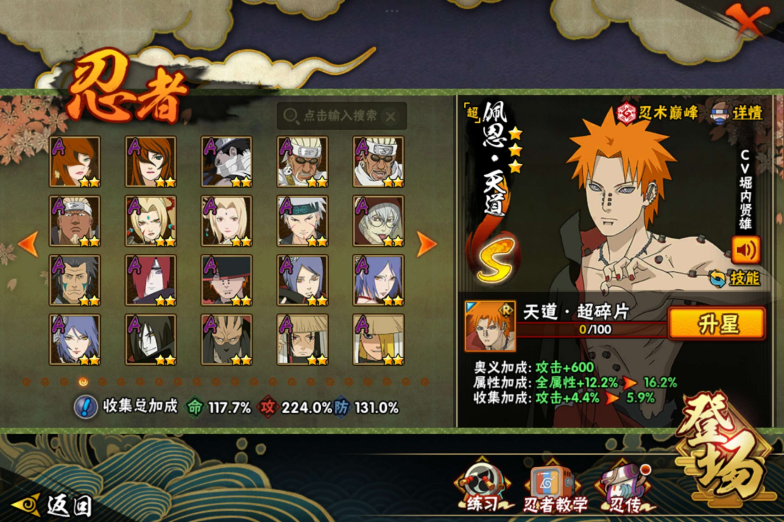 【S级忍者】宇智波带土「忍界大战」(3星),宇智波斑「木叶创立」(3星),迈特凯「死门」(3星),大野木「忍界大战」(3星),旗木卡卡西「须佐能乎」(3星),自来也「传说中的三忍」(3星),宇智波斑「秽土转生·解」(3星),宇智波佐助「永恒万花筒」(3星),神秘面具男「红夜之