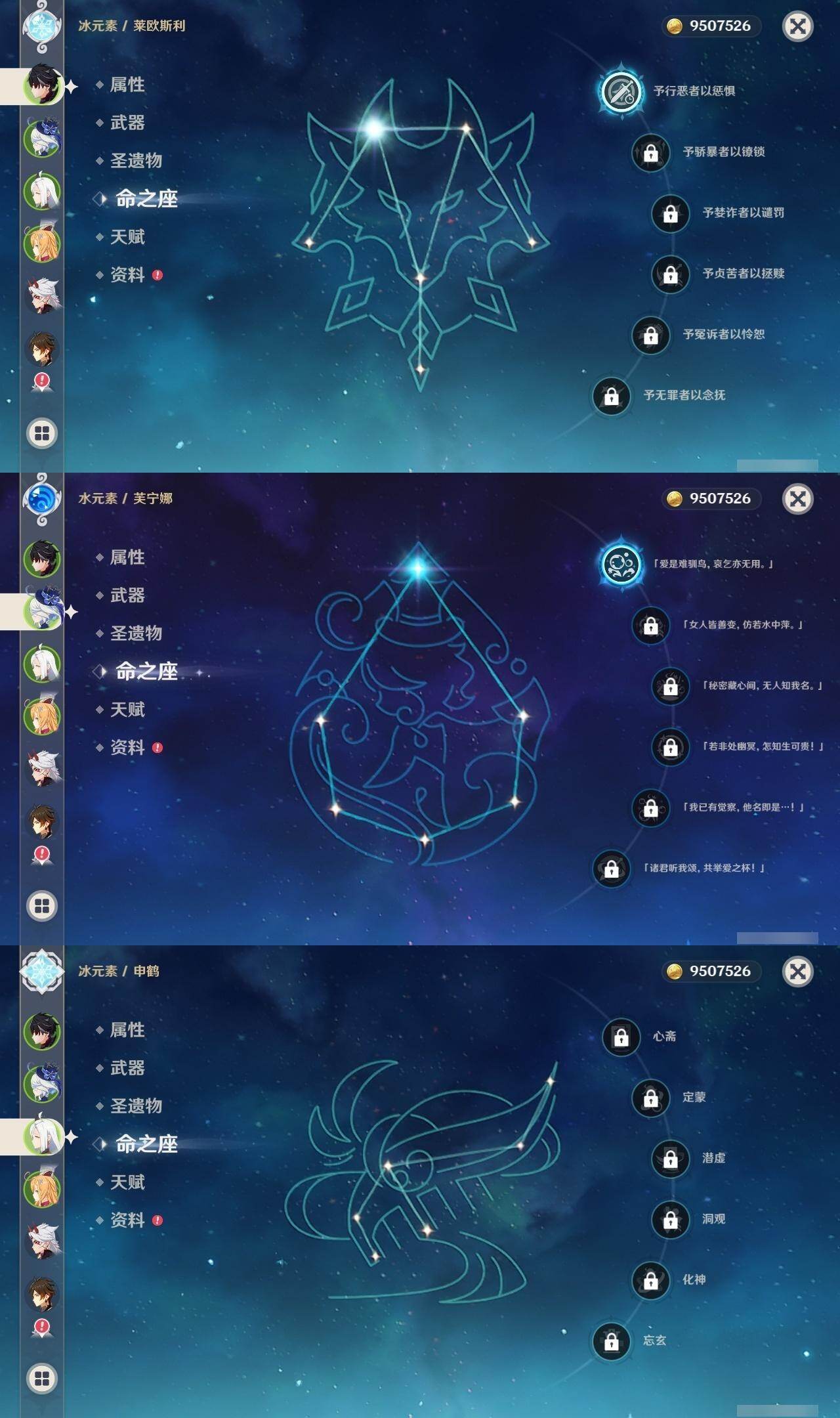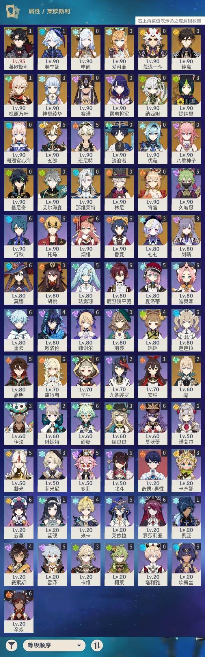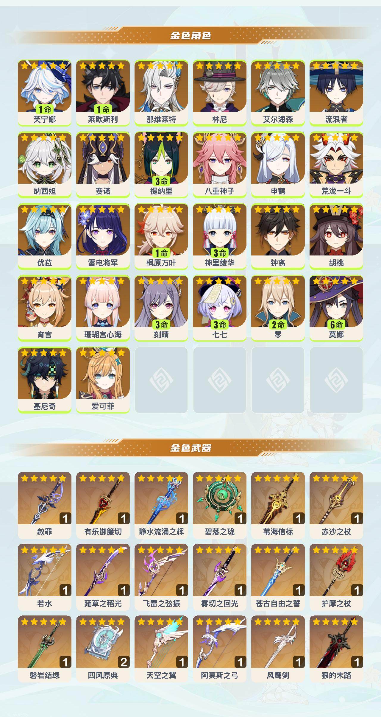 1命芙宁娜,1命莱欧斯利,0命那维莱特,0命林尼,0命艾尔海森,0命流浪者,0命纳西妲,0命赛诺,3命提纳里,0命八重神子,0命申鹤,0命荒泷一斗,0命优菈,0命雷电将军,1命枫原万叶,3命神里绫华,0命钟离,0命胡桃,0命宵宫,0命珊瑚宫心海,3命刻晴,3命七七,2命琴,满命莫娜,0命基尼奇,0命爱可菲,精1赦罪,精1有乐御簾切,精1静水流涌之辉,精1碧落之珑,精1苇海信标,精1赤沙之杖,精1若水,精1薙草之稻光,精1飞雷之弦振,精1雾切之