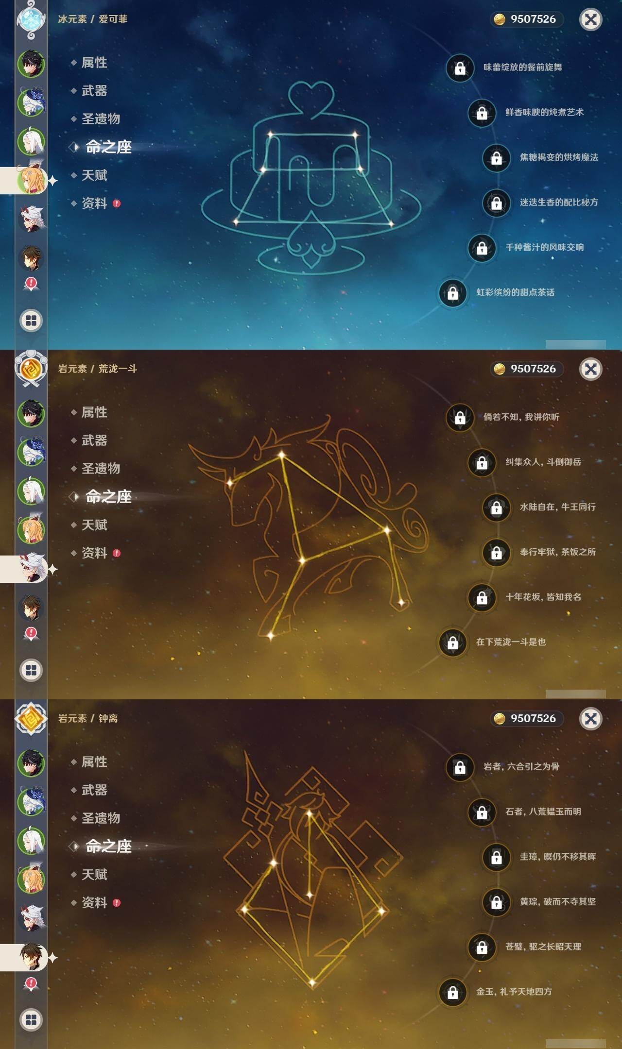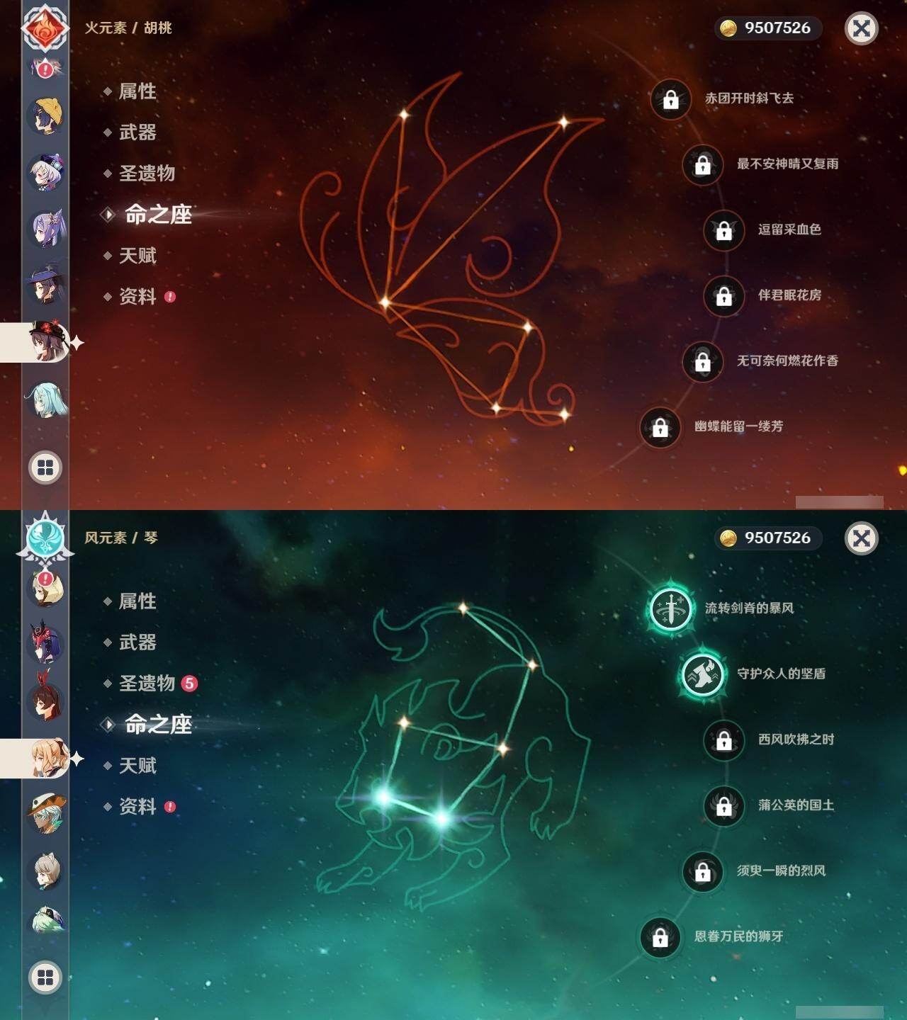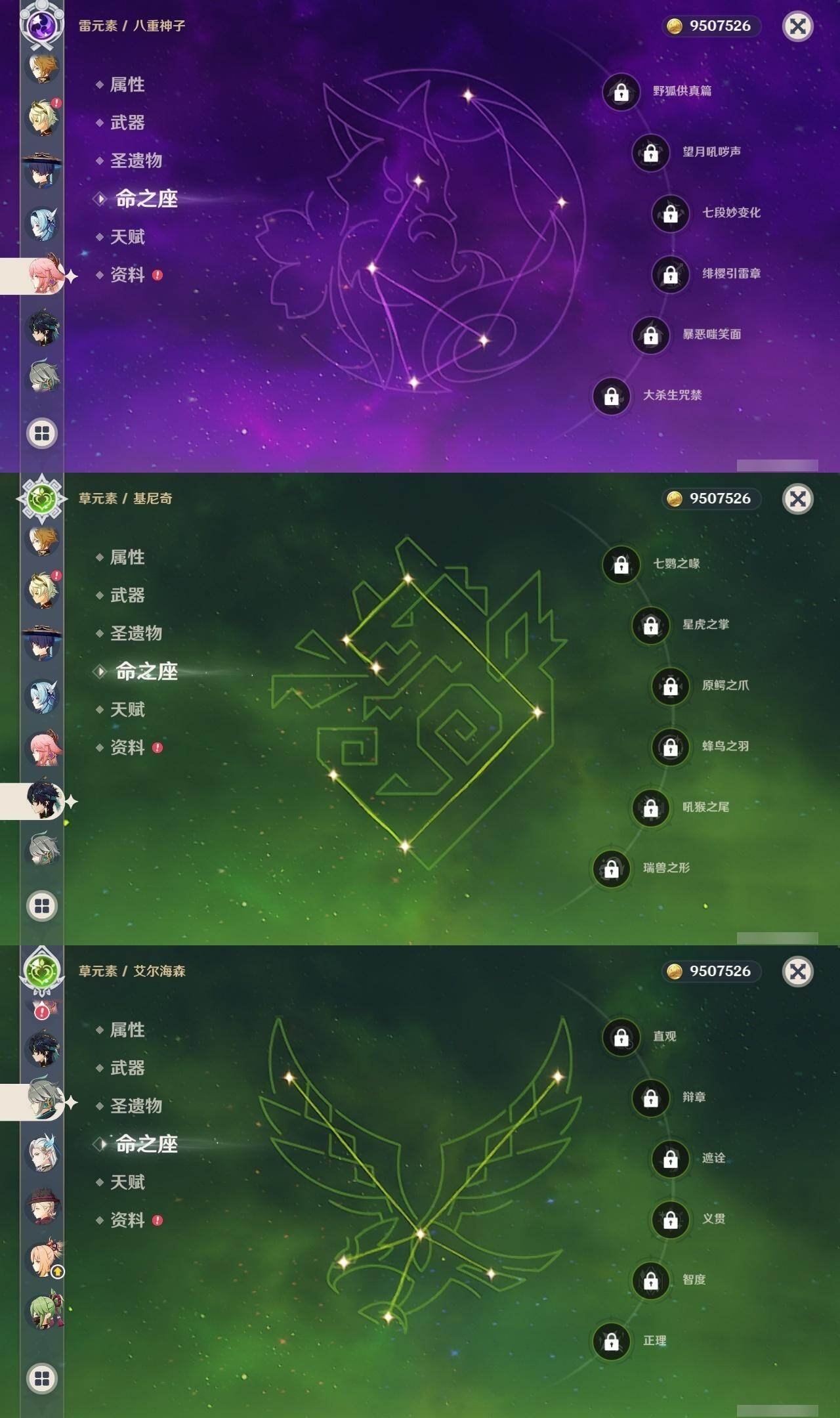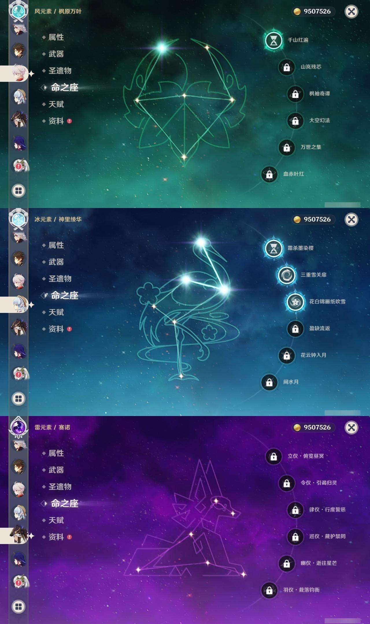 1命芙宁娜,1命莱欧斯利,0命那维莱特,0命林尼,0命艾尔海森,0命流浪者,0命纳西妲,0命赛诺,3命提纳里,0命八重神子,0命申鹤,0命荒泷一斗,0命优菈,0命雷电将军,1命枫原万叶,3命神里绫华,0命钟离,0命胡桃,0命宵宫,0命珊瑚宫心海,3命刻晴,3命七七,2命琴,满命莫娜,0命基尼奇,0命爱可菲,精1赦罪,精1有乐御簾切,精1静水流涌之辉,精1碧落之珑,精1苇海信标,精1赤沙之杖,精1若水,精1薙草之稻光,精1飞雷之弦振,精1雾切之