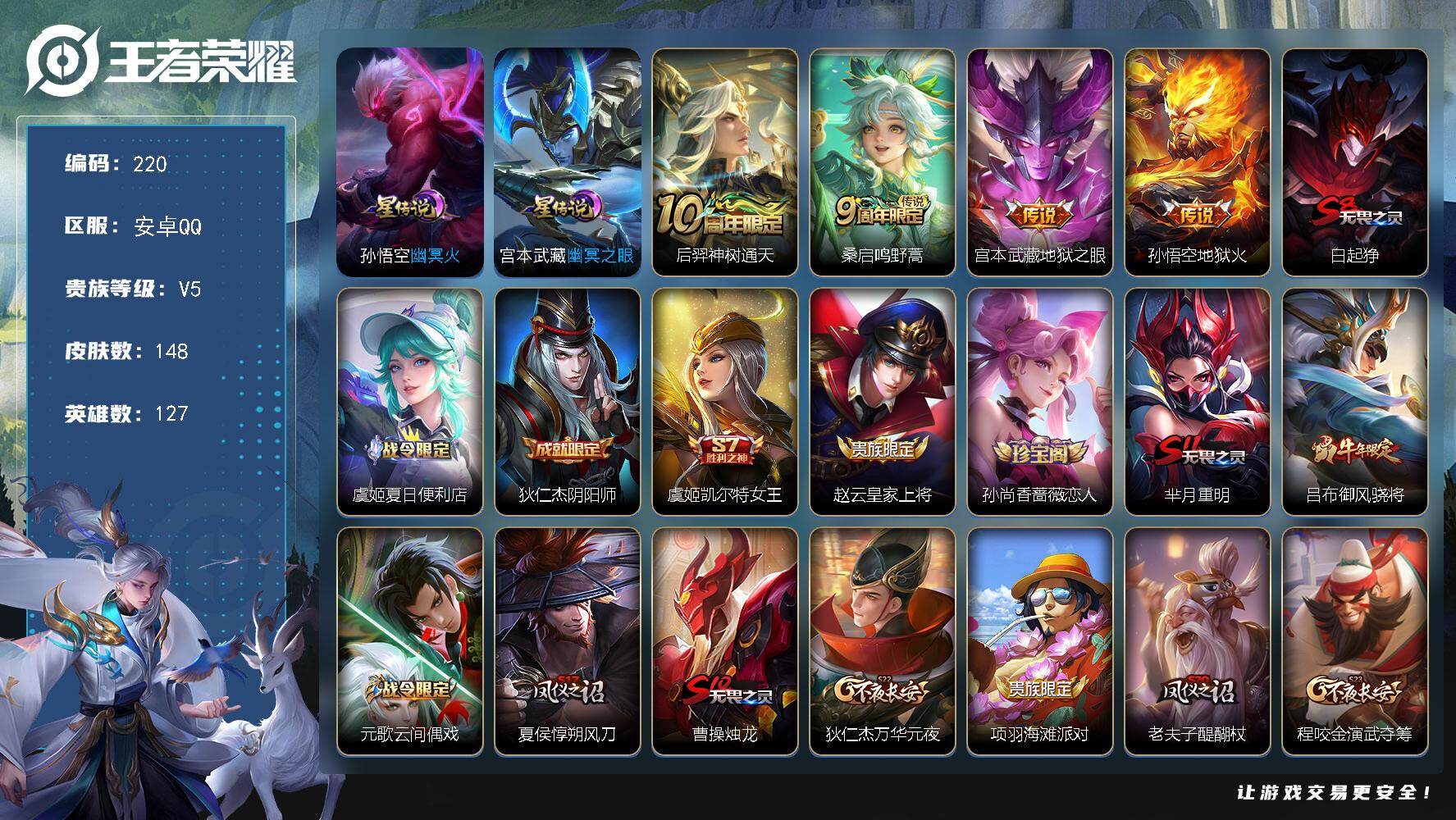 【编号98064,可秒换绑】【店长推荐地狱火+幽冥火!地狱之眼+幽冥之眼!!!】,安卓Q-V5-最强王者段位-127英雄-148皮肤-4传说-35史诗【传说皮肤】:后羿神树通天,桑启鸣野蒿,宫本武藏地狱之眼,孙悟空地狱火【限定皮肤】:白起狰,虞姬夏日便利店,狄仁杰阴阳师,虞姬凯尔特女王,赵云皇家上将,孙尚香蔷薇恋人,芈月重明,吕布御风骁将,元歌云间偶戏,夏侯惇朔风刀,曹操烛龙,狄仁杰万华元夜,项羽海滩派对,老夫子醍醐杖,程咬金演武夺筹,亚瑟潮玩骑士王,牛魔御旌,李元芳云中旅人,钟馗驱傩正仪,太乙