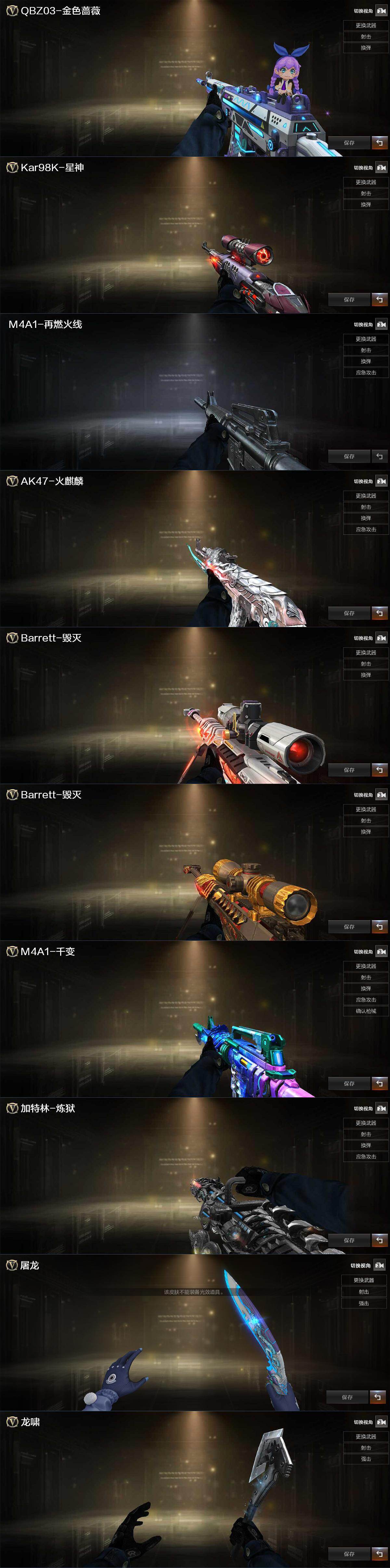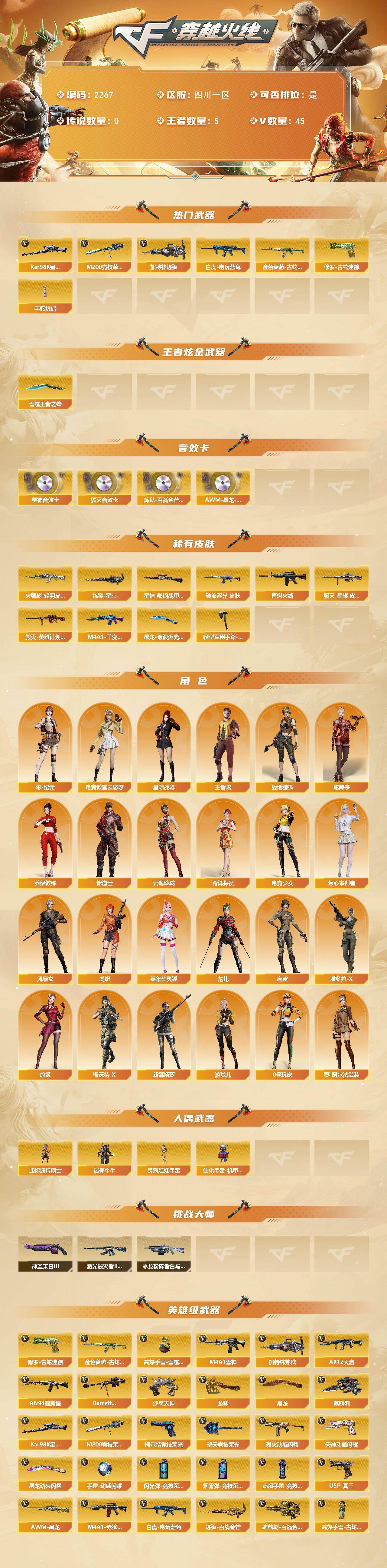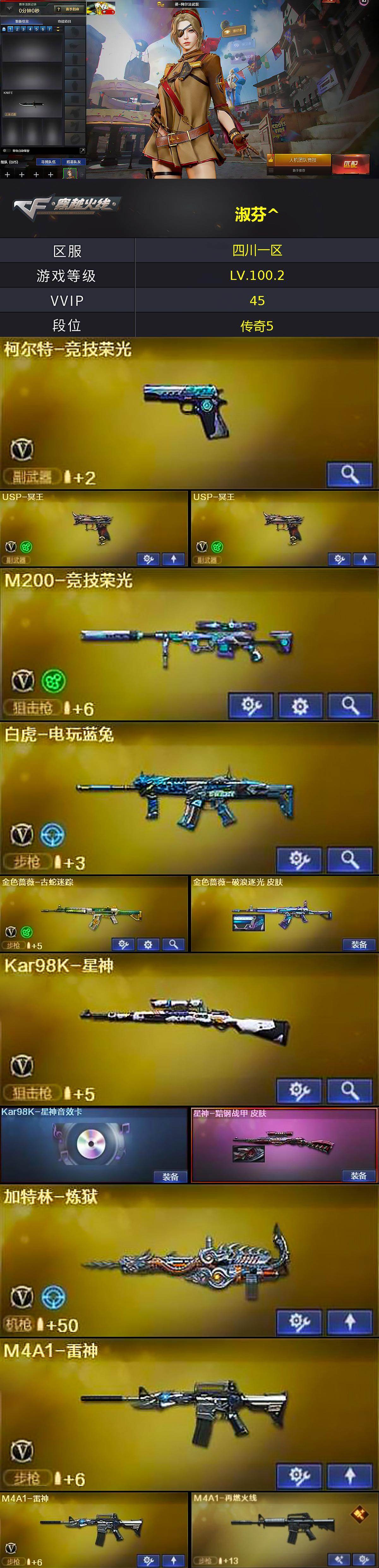 四川一区-46V-5王者武器数-0炫金武器数【热门武器】:金色蔷薇-古蛇迷踪,修罗-古蛇迷踪,M200-竞技荣光,白虎-电玩蓝兔,Kar98K-星神,加特林-炼狱,羊驼玩偶*3【王者炫金武器】:雷霆王者之锋【音效卡】:Barrett-毁灭音效卡,Kar98K-星神音效卡,炼狱-百战金芒-庆典舞曲音效卡,AWM-昌龙-怀旧音效卡【皮肤】:金色蔷薇-破浪逐光 皮肤,星神-黯钢战甲 皮肤,M4A1-再燃火线,火麒麟-轻羽皮肤,毁灭-星耀 皮肤,毁灭-英雄计划 皮肤,M4A1-千变-孔明皮肤,炼狱-星空