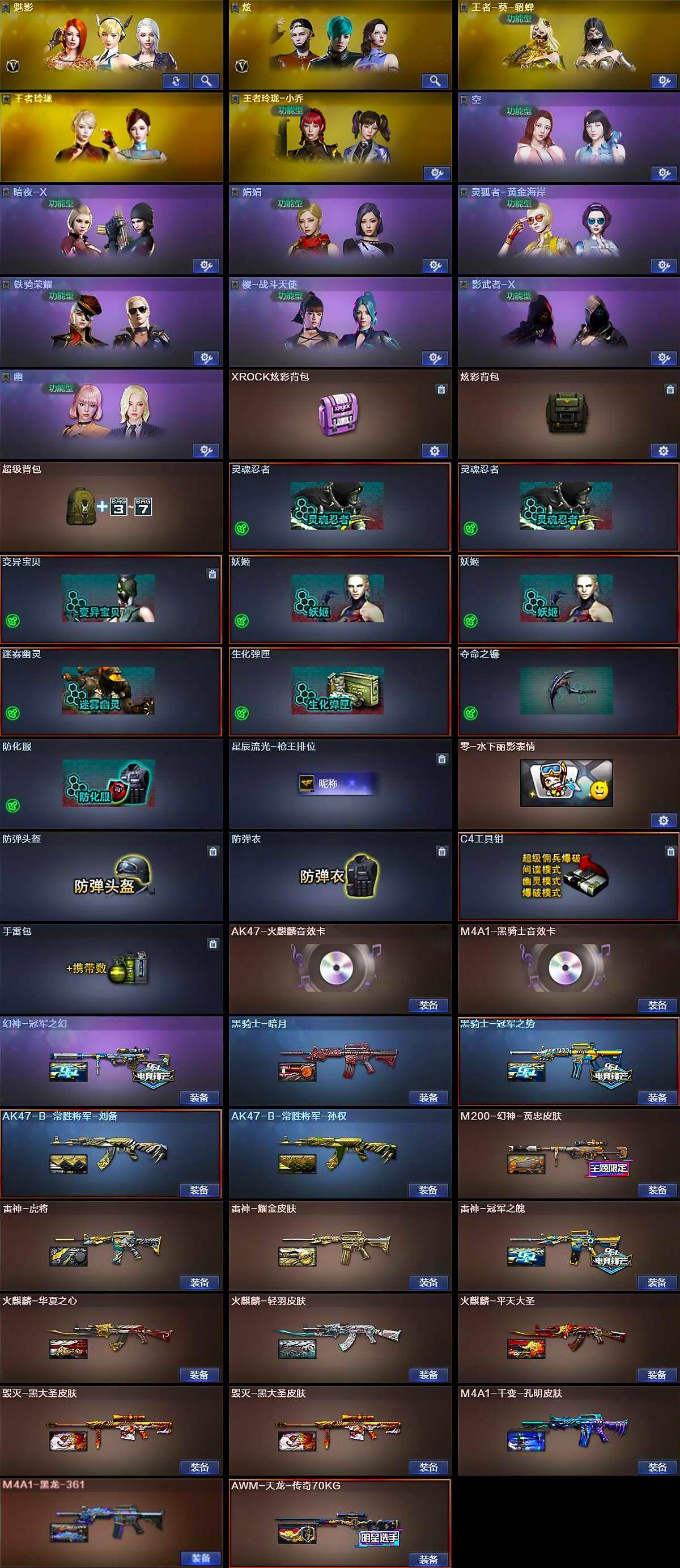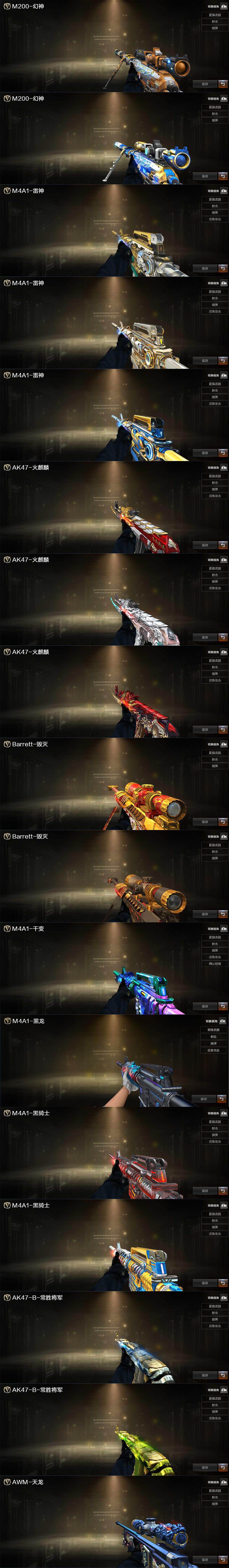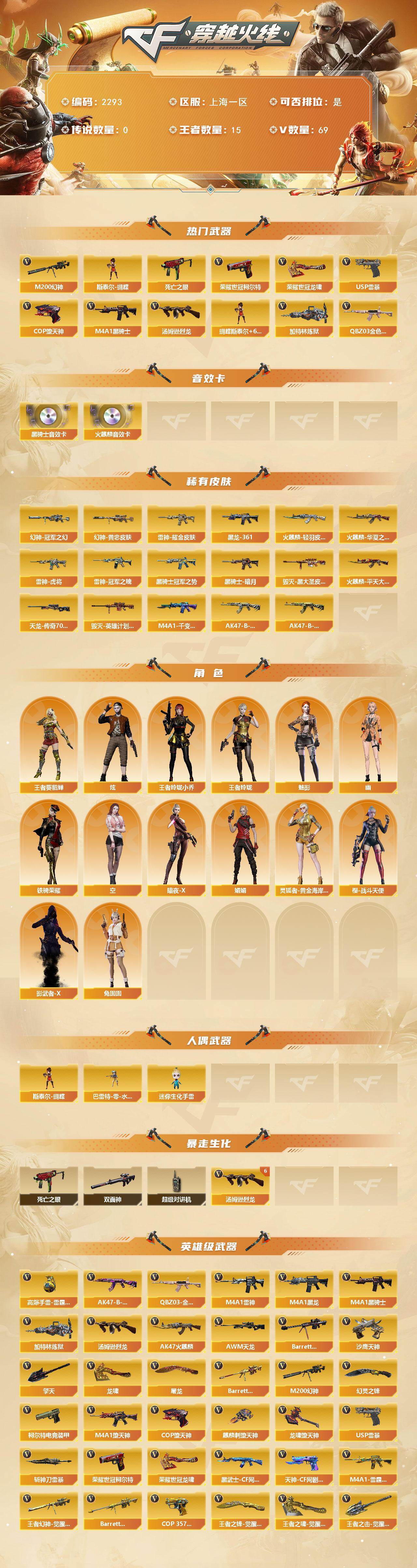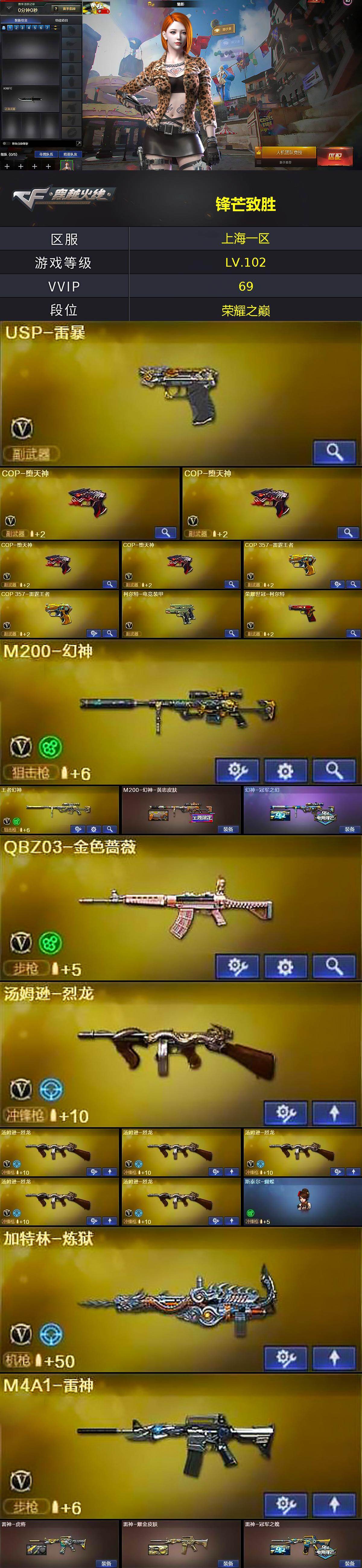 上海一区-84V-15王者武器数-0炫金武器数【热门武器】:QBZ03-金色蔷薇,M200-幻神,死亡之眼,荣耀世冠-柯尔特,M4A1-黑骑士,汤姆逊-烈龙*6,加特林-炼狱,斯泰尔-蝴蝶,USP-雷暴,COP-堕天神*4,荣耀世冠-龙啸【音效卡】:AK47-火麒麟音效卡,M4A1-黑骑士音效卡【皮肤】:M200-幻神-黄忠皮肤,幻神-冠军之幻,雷神-虎将,雷神-耀金皮肤,雷神-冠军之魄,火麒麟-华夏之心,火麒麟-轻羽皮肤,火麒麟-平天大圣,毁灭-黑大圣皮肤*2,毁灭-英雄计划 皮肤,M4A1-