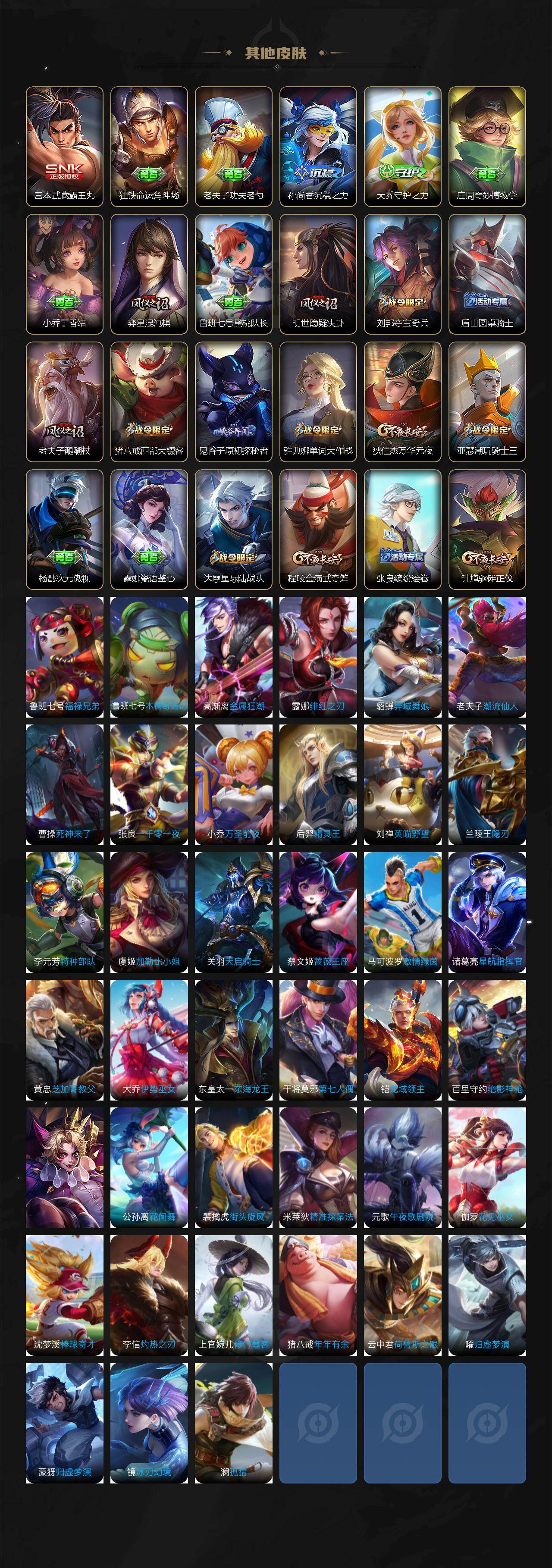【限定皮肤】:狄仁杰阴阳师,赵云皇家上将,阿轲迷踪丽影,芈月白晶晶,元歌云间偶戏,马可波罗暗影游猎,狄仁杰魔术师,狄仁杰万华元夜,达摩星际陆战队,项羽海滩派对,老夫子醍醐杖,关羽冰锋战神,程咬金演武夺筹,刘邦夺宝奇兵,亚瑟潮玩骑士王,虞姬霸王别姬,钟馗驱傩正仪,雅典娜单词大作战,蔡文姬繁星