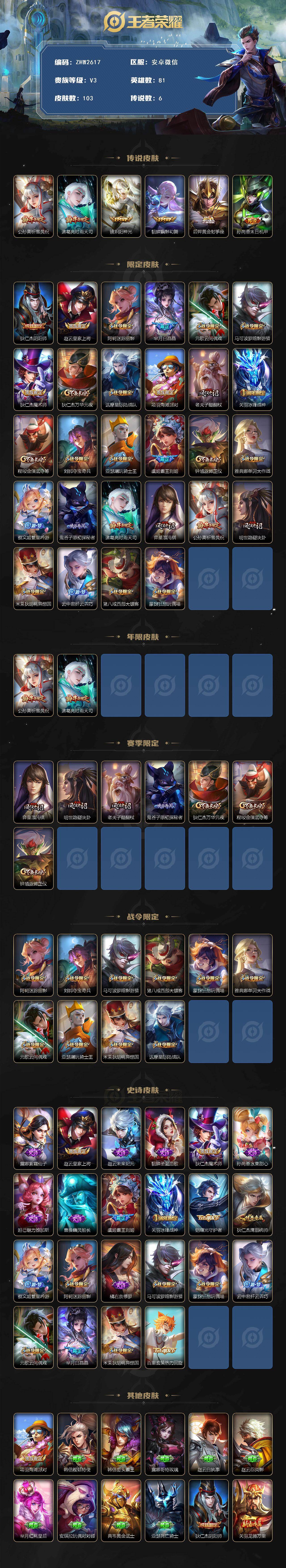 V3-荣耀黄金IV段位-81英雄-103皮肤-6传说-22史诗
