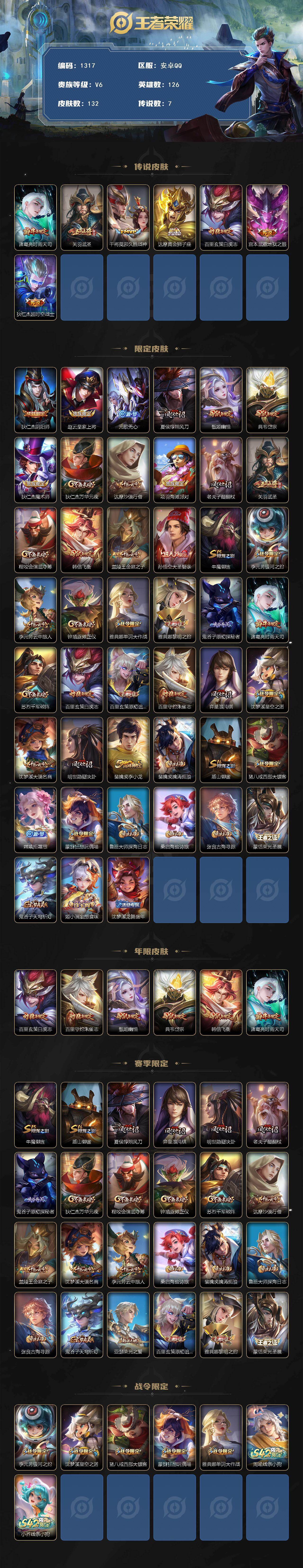 /2361038 王者荣耀账号 年限很多 安卓Q-V6-最强王者段位-126英雄-132皮肤-7传说-33史诗
