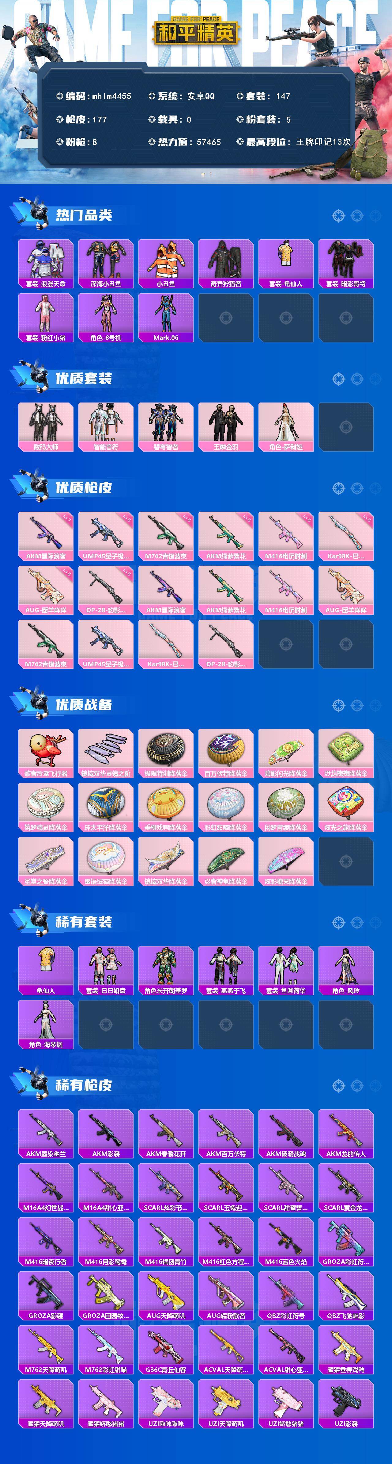 【mhlm4455】安卓 手Q-5粉装-8特效枪-0载具-2粉色飞行器-57465热力值-13王牌印记-147套装-177枪皮