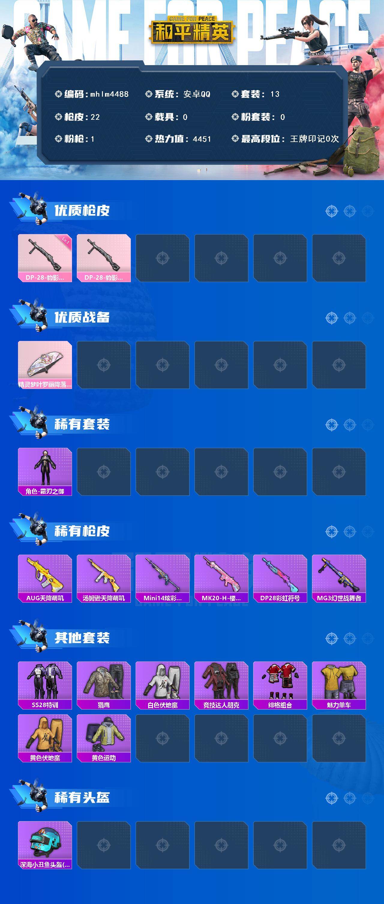 【mhlm4488】安卓 手Q-0粉装-1特效枪-0载具-0粉色飞行器-4451热力值-0王牌印记-13套装-22枪皮