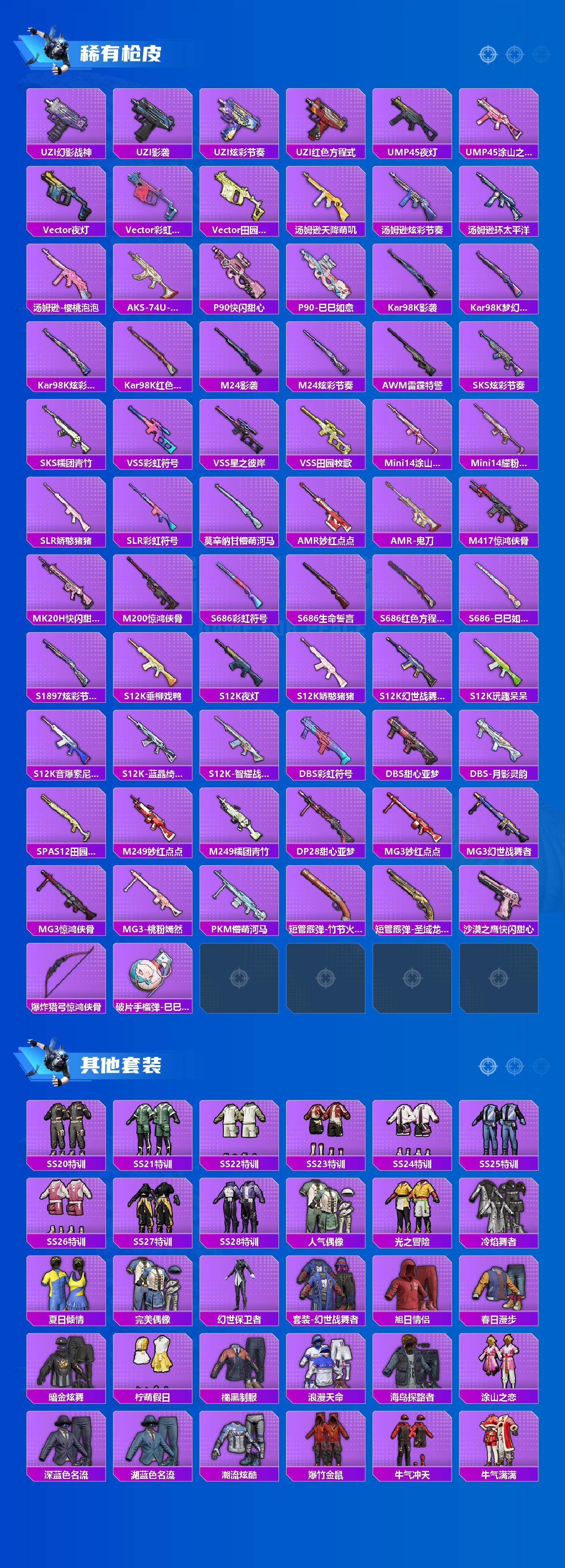 【粉色枪皮等级】:SCAR-L-锦绣绵绵(五级),GROZA-镜光银凌(五级),AUG-暖羊咩咩(五级),AKS-74U-森灵之息(五级),Kar