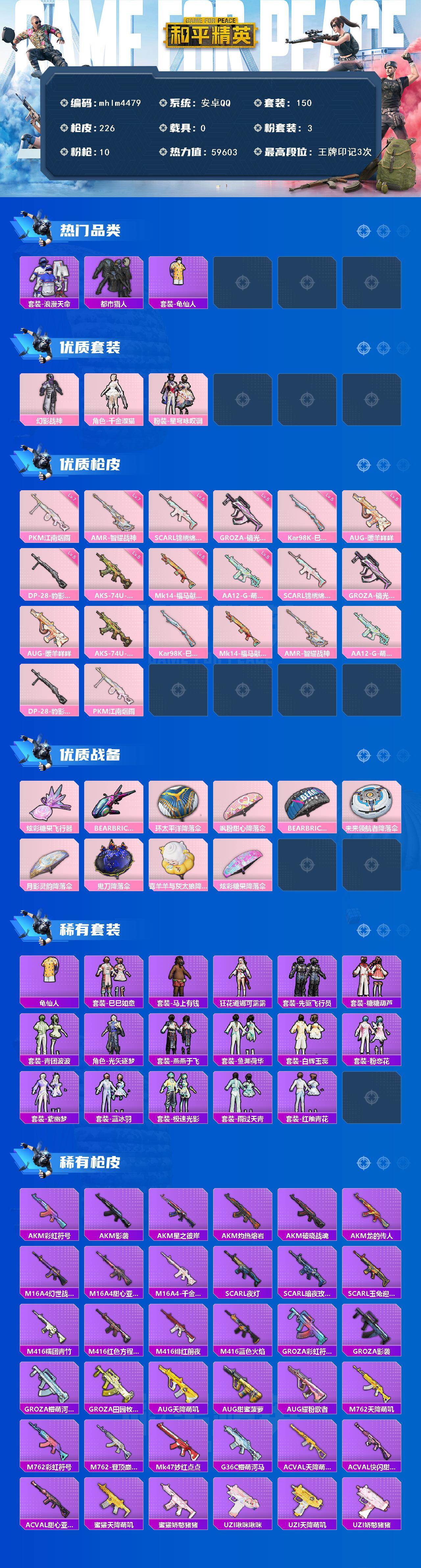 【mhlm4479】安卓 手Q-3粉装-10特效枪-0载具-2粉色飞行器-59603热力值-3王牌印记-150套装-226枪皮