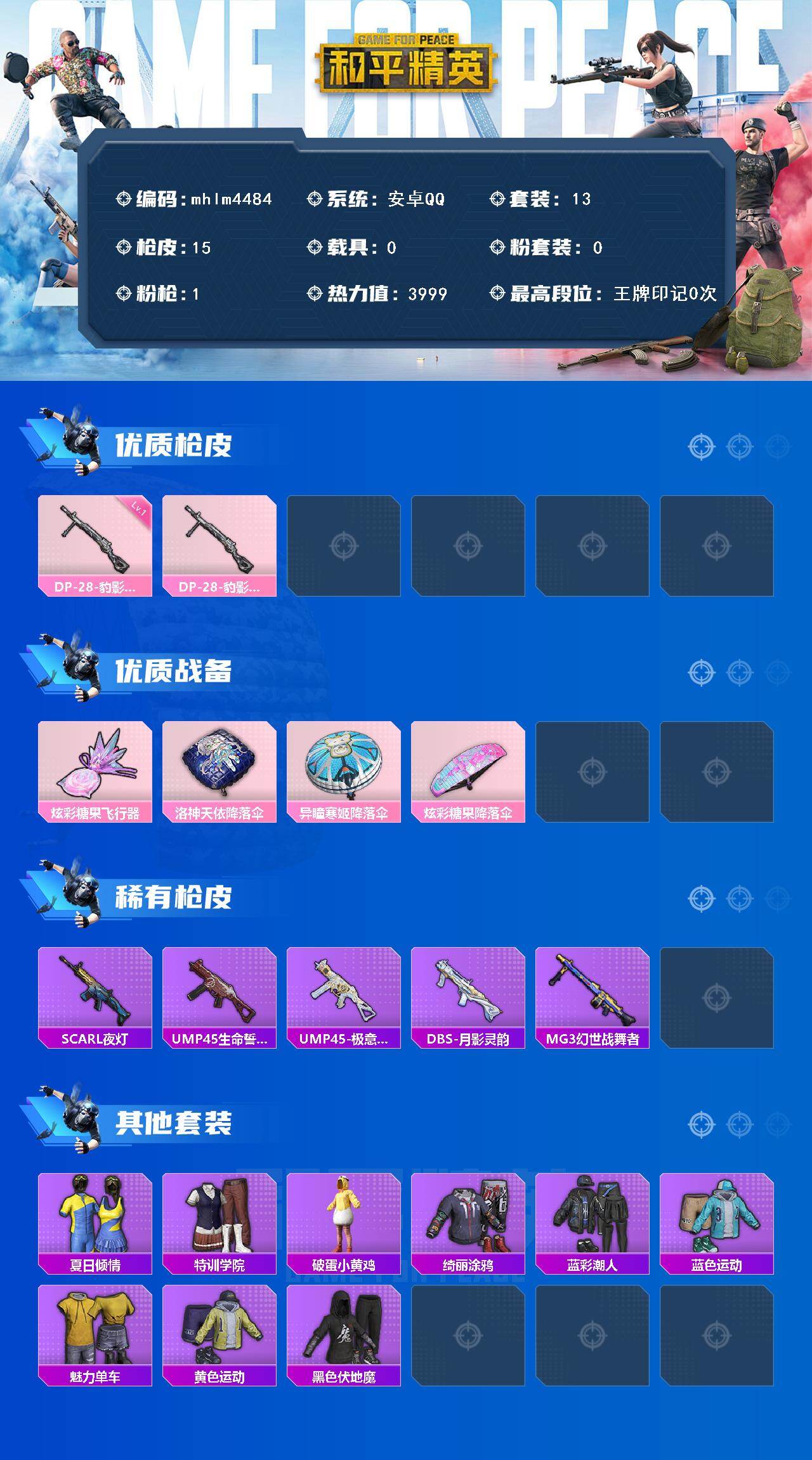 【mhlm4484】安卓 手Q-0粉装-1特效枪-0载具-1粉色飞行器-3999热力值-1王牌印记-13套装-15枪皮
