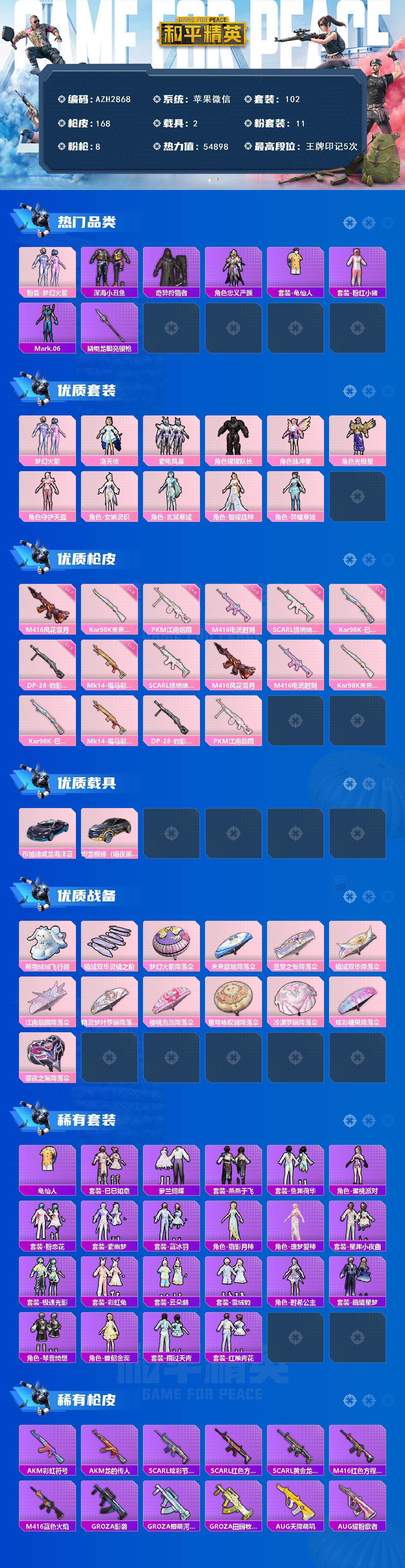 【AZH2868】苹果 微信【梦幻火箭女娲灵识洛天依 深海小丑鱼 满级风花雪月M416 2载具】11粉装-8特效枪-2载具-2粉色飞行器-54898热力值-5王牌印记-102套装-168枪皮